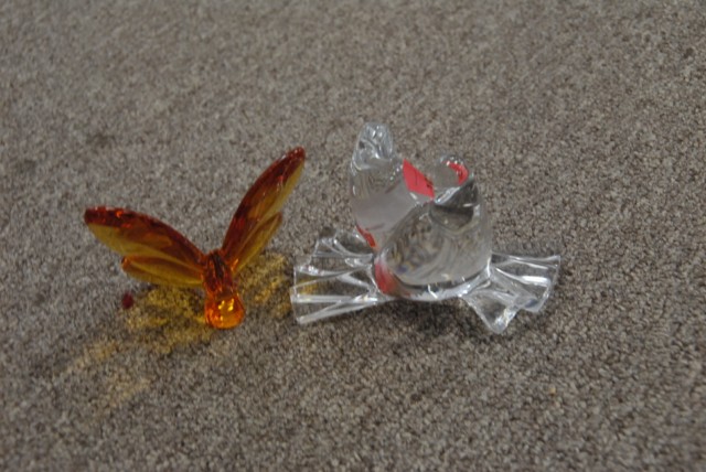 2 Baccarat crystal pieces including an amber butterfly, and pair of crystal birds.