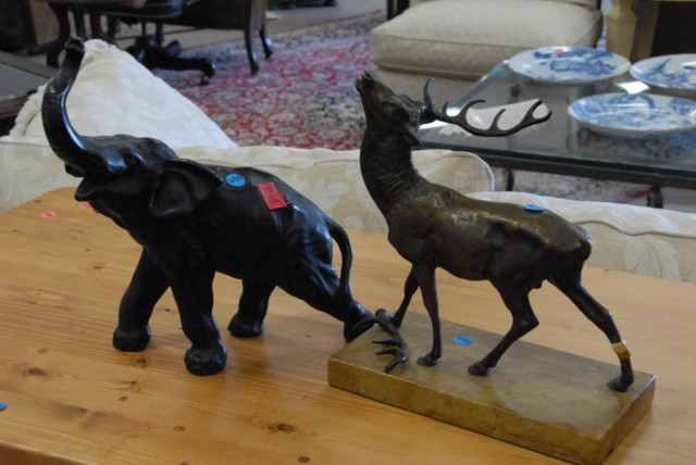 Two piece lot including white metal stag on marble base and metal elephant on marble base.