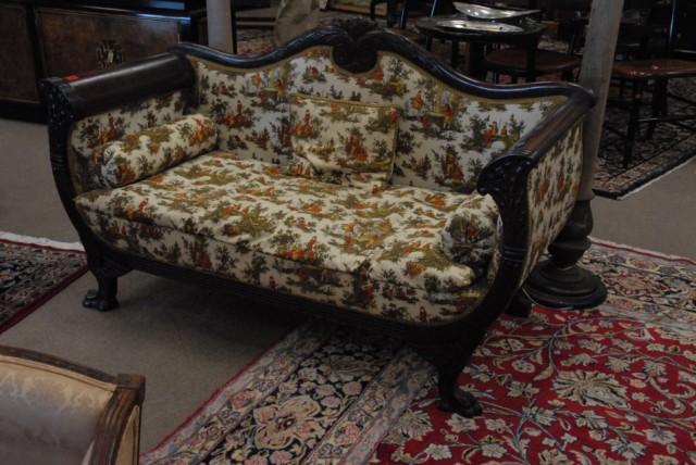Federal style carved love seat with paw feet.