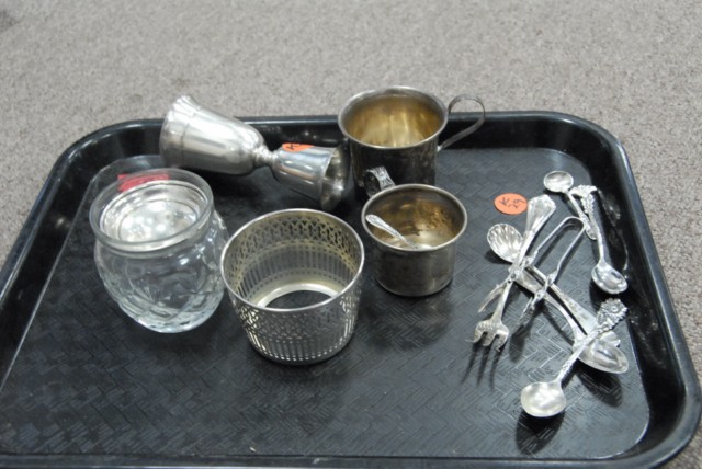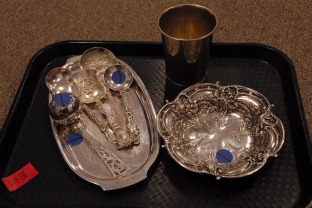 Sterling silver and plated lot including small oval tray, dish, cup, tea strainer and 4 spoons.
