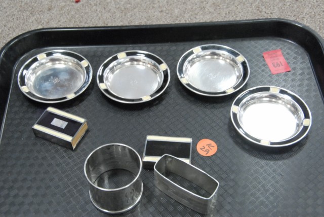Sterling silver and plated lot including 4 coasters, enameled match holders, plus two napkin holders.