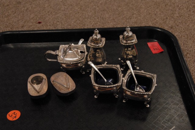 Sterling silver lot including open salts, closed salt, and two pepper shakers.
