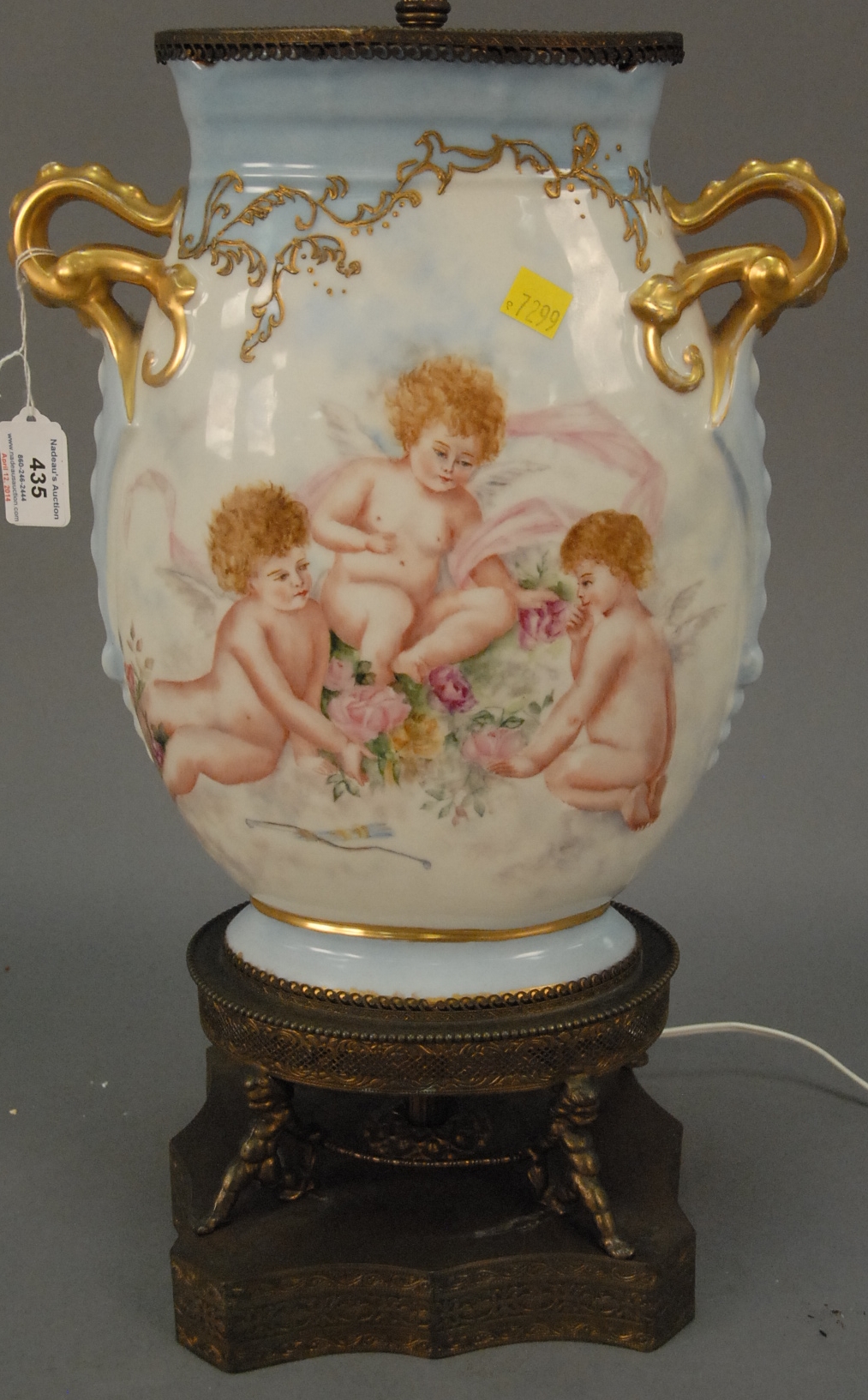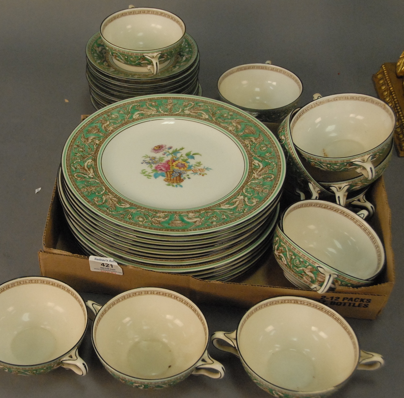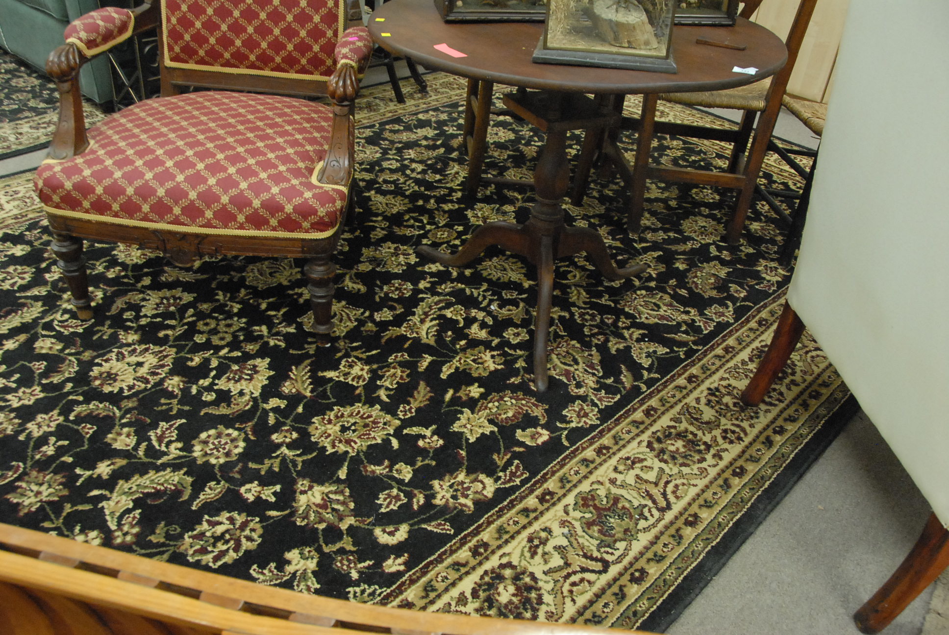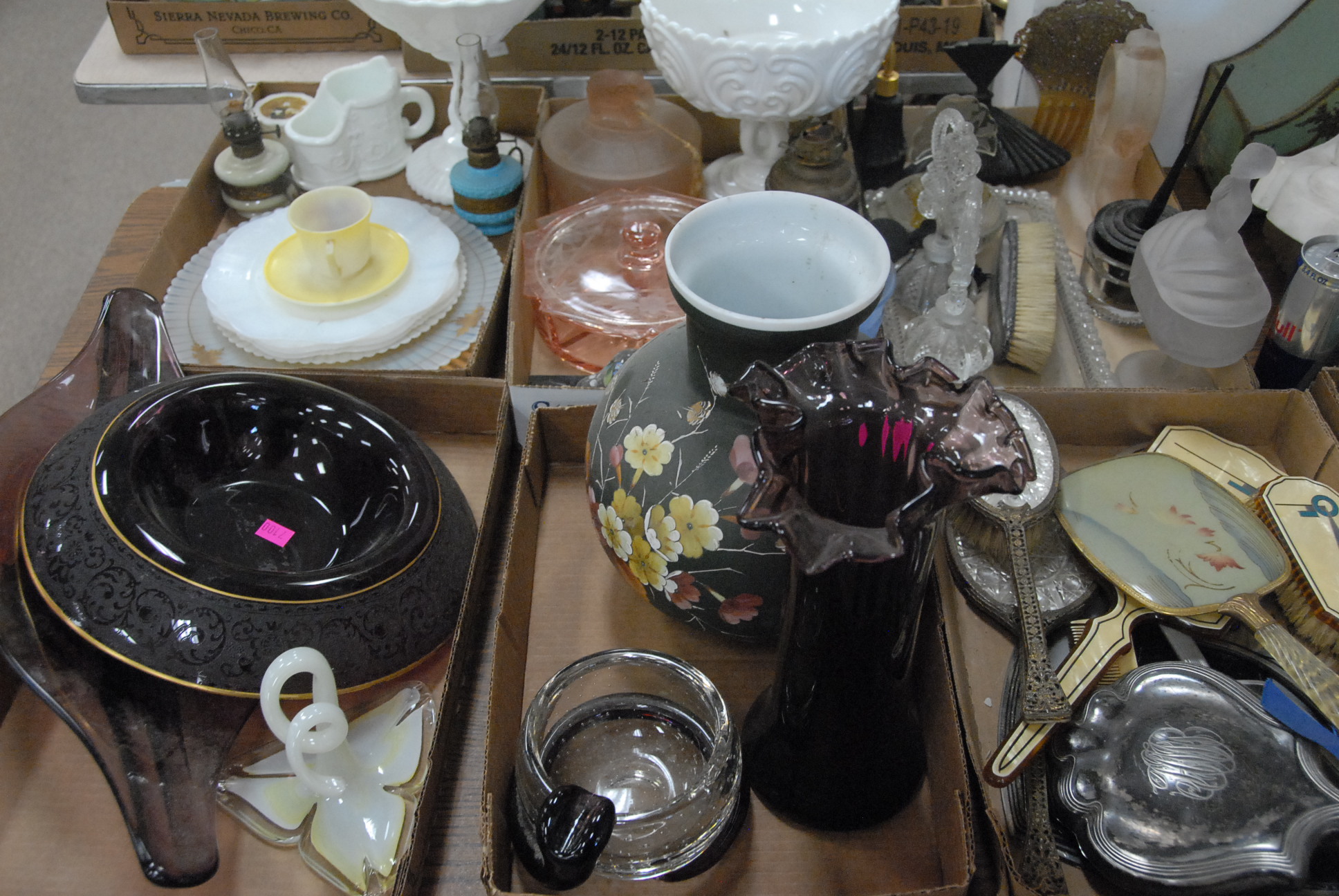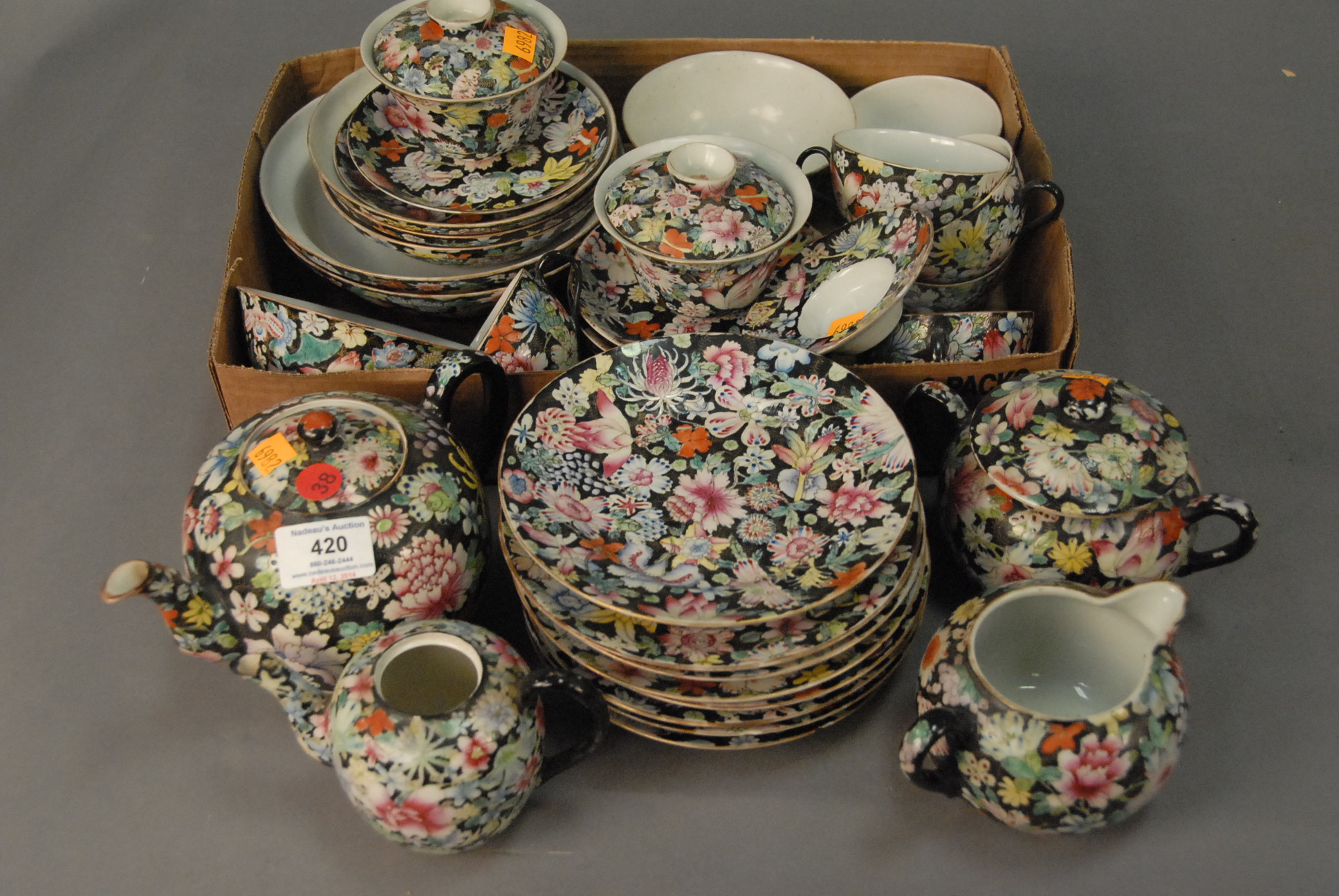 Group lot to include Famille Jaune baluster vase with pink peony and bird ht 15in. and Chinese mille fleur tea/dessert service on black ground, 34 total pieces, including: teapot, creamer, sucrier, 6 cups, 7 saucers, 8 tea plates, 7 bowls, 2 covered rice or condiment bowls with saucers, and small teapot spurious Guangxu and Qianlong marks, China 19th/20th century minor fritting to a few plates and cover missing to smallest teapot.