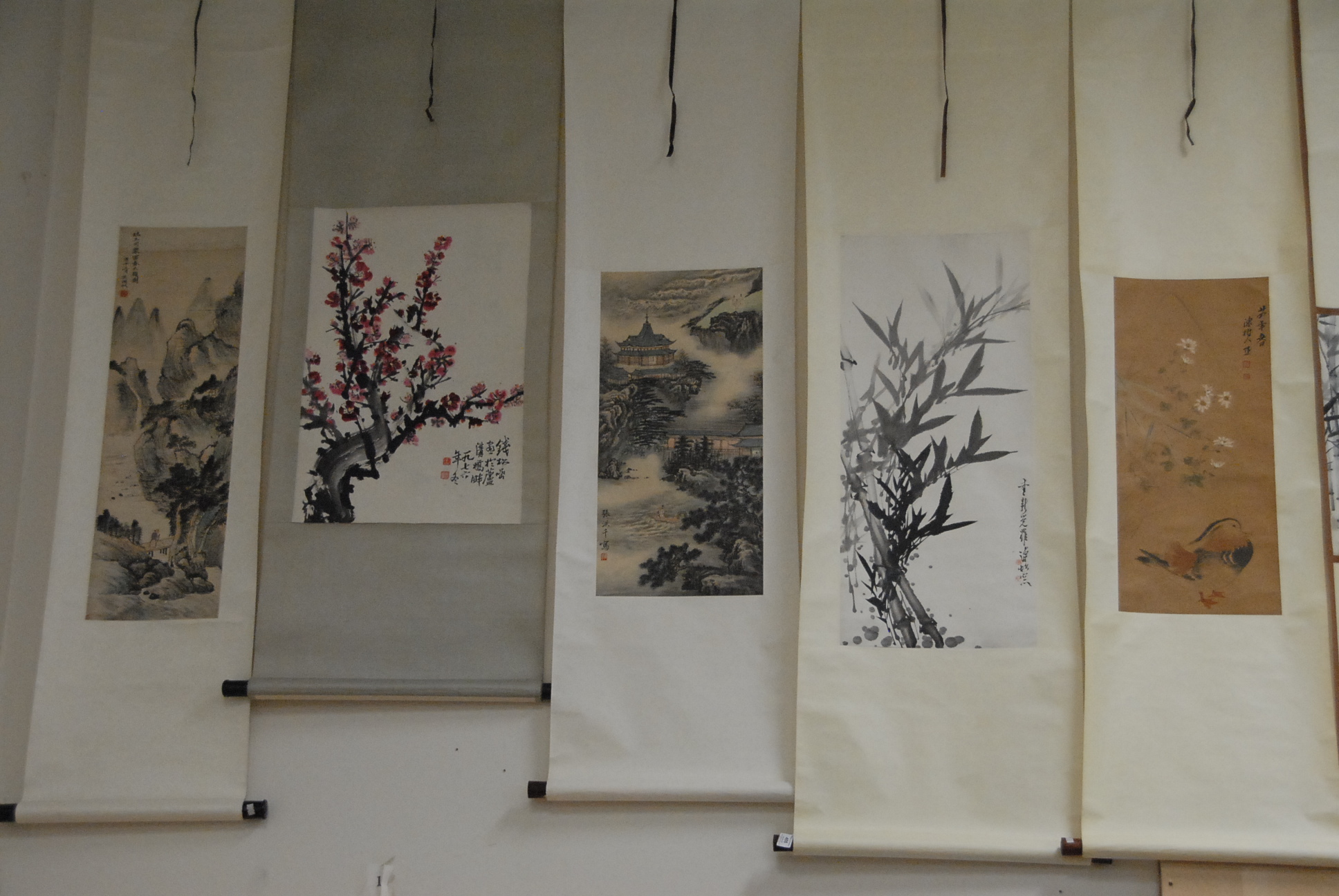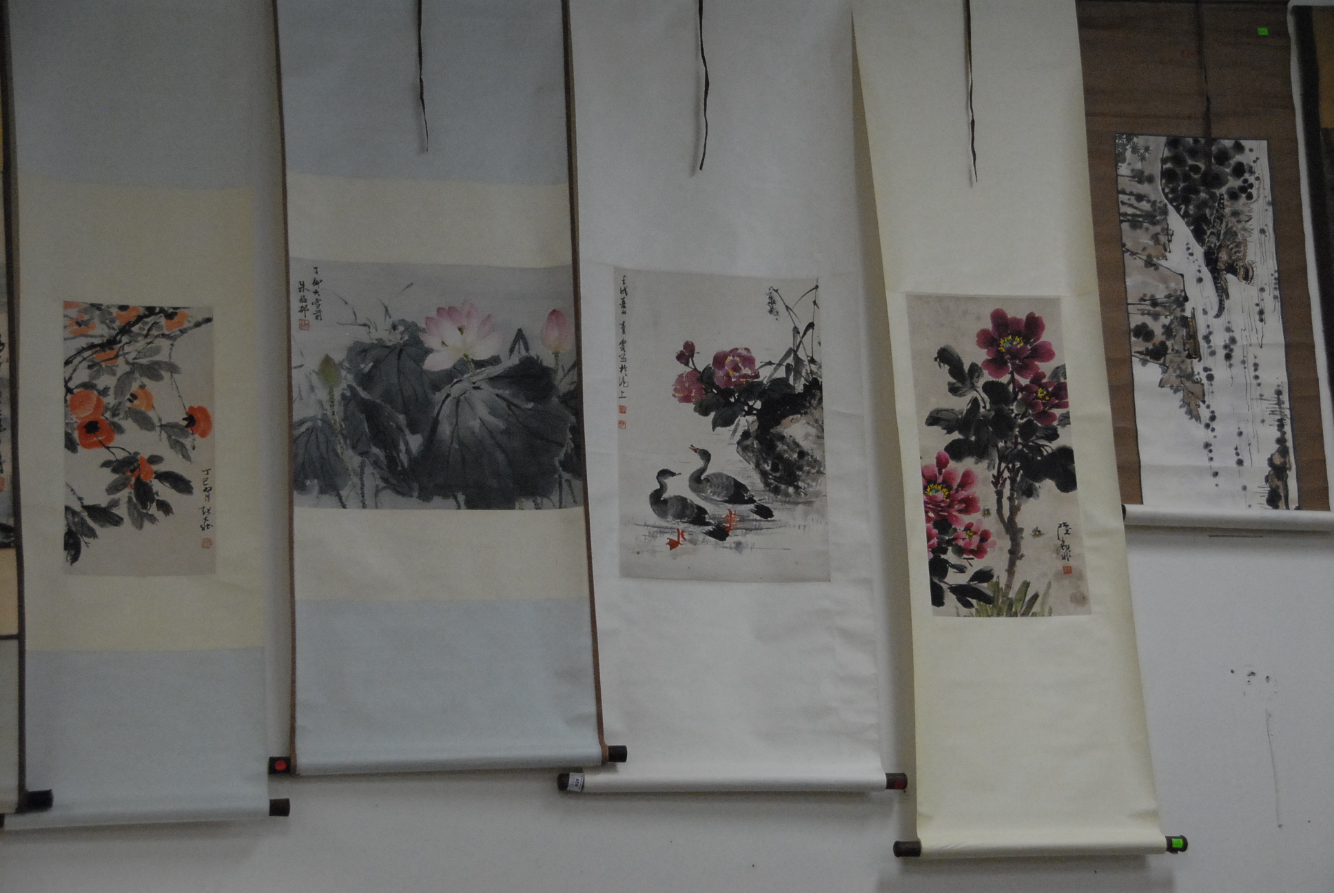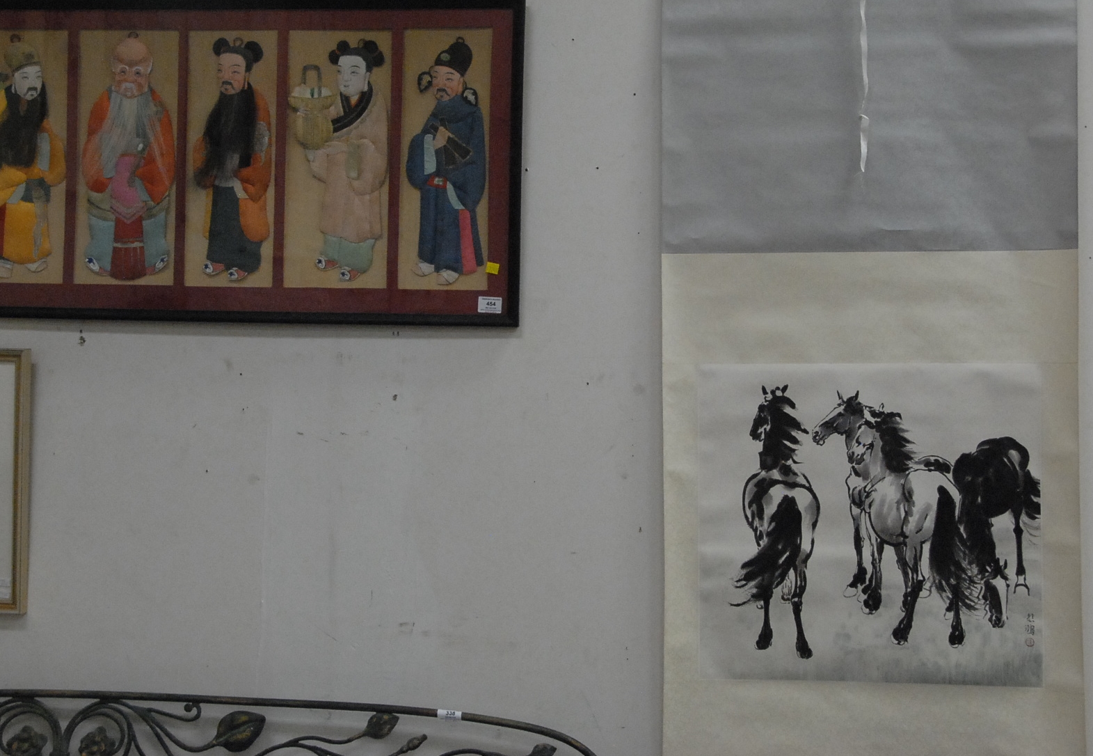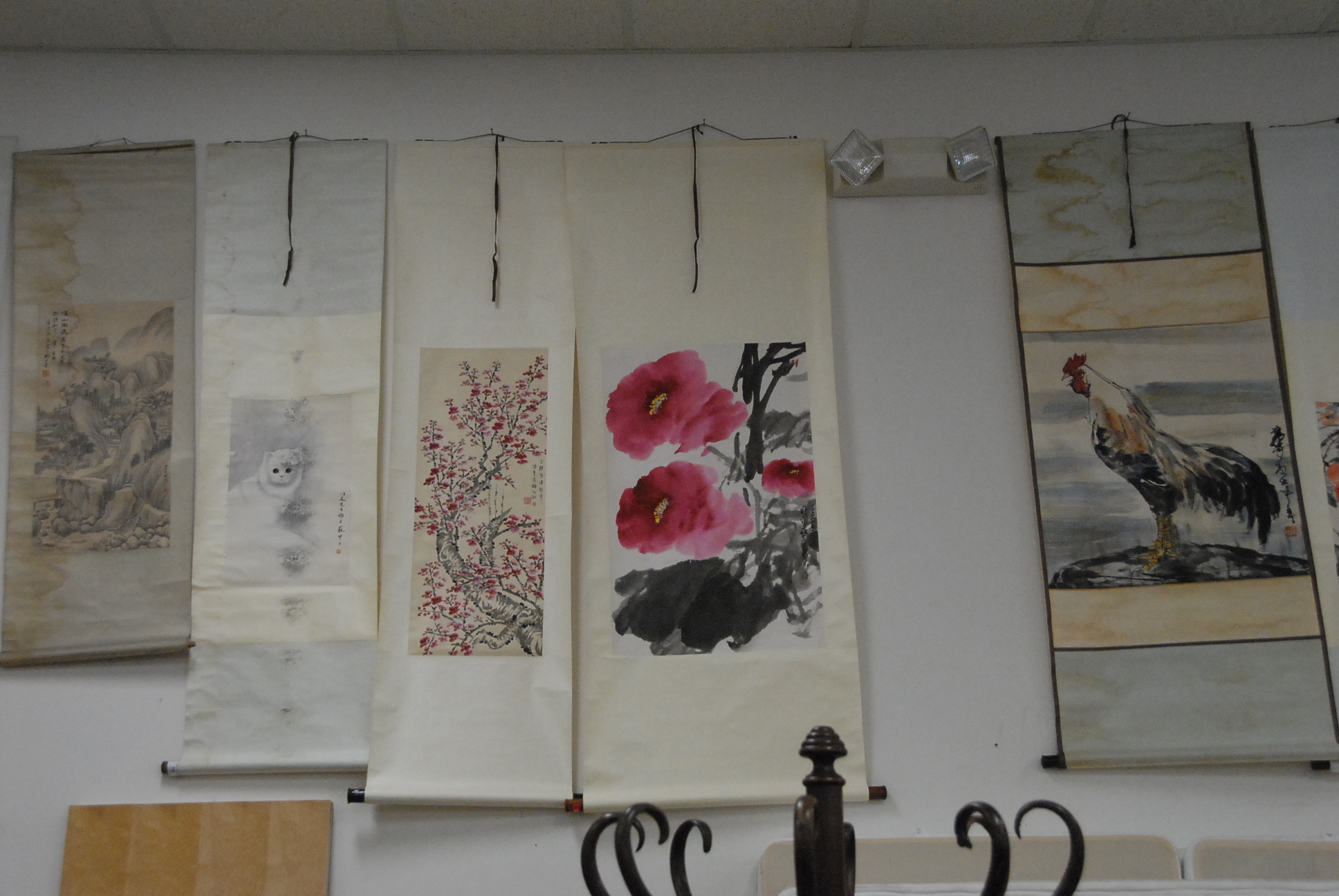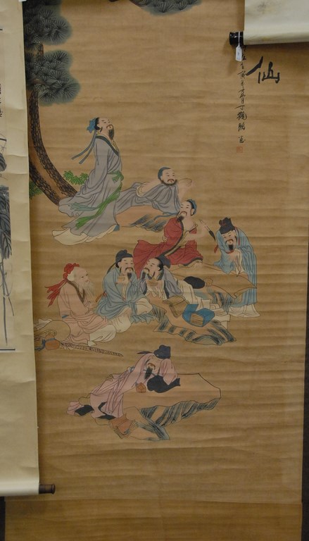 Two large Oriental watercolors on paper to include a scroll of scholars and scroll of a seated emperor wearing a yellow four claw dragon robe. both are 68 x 37