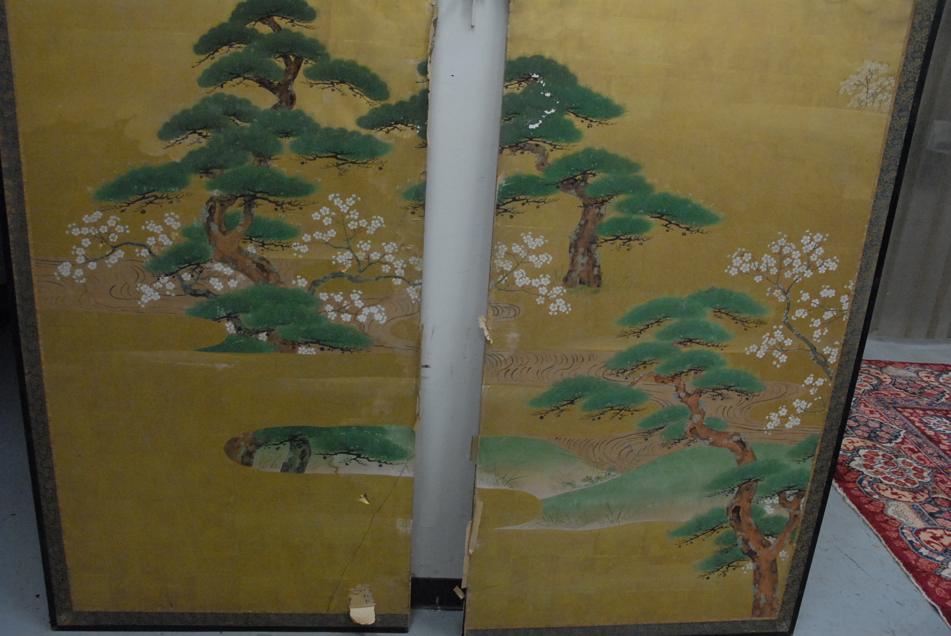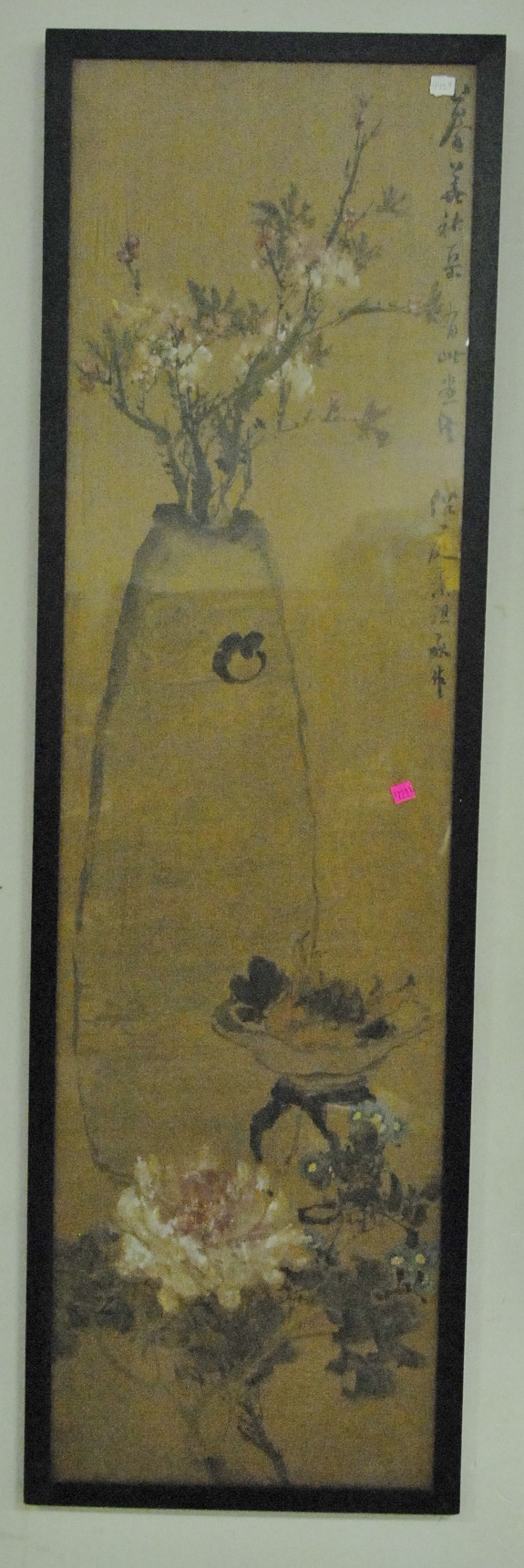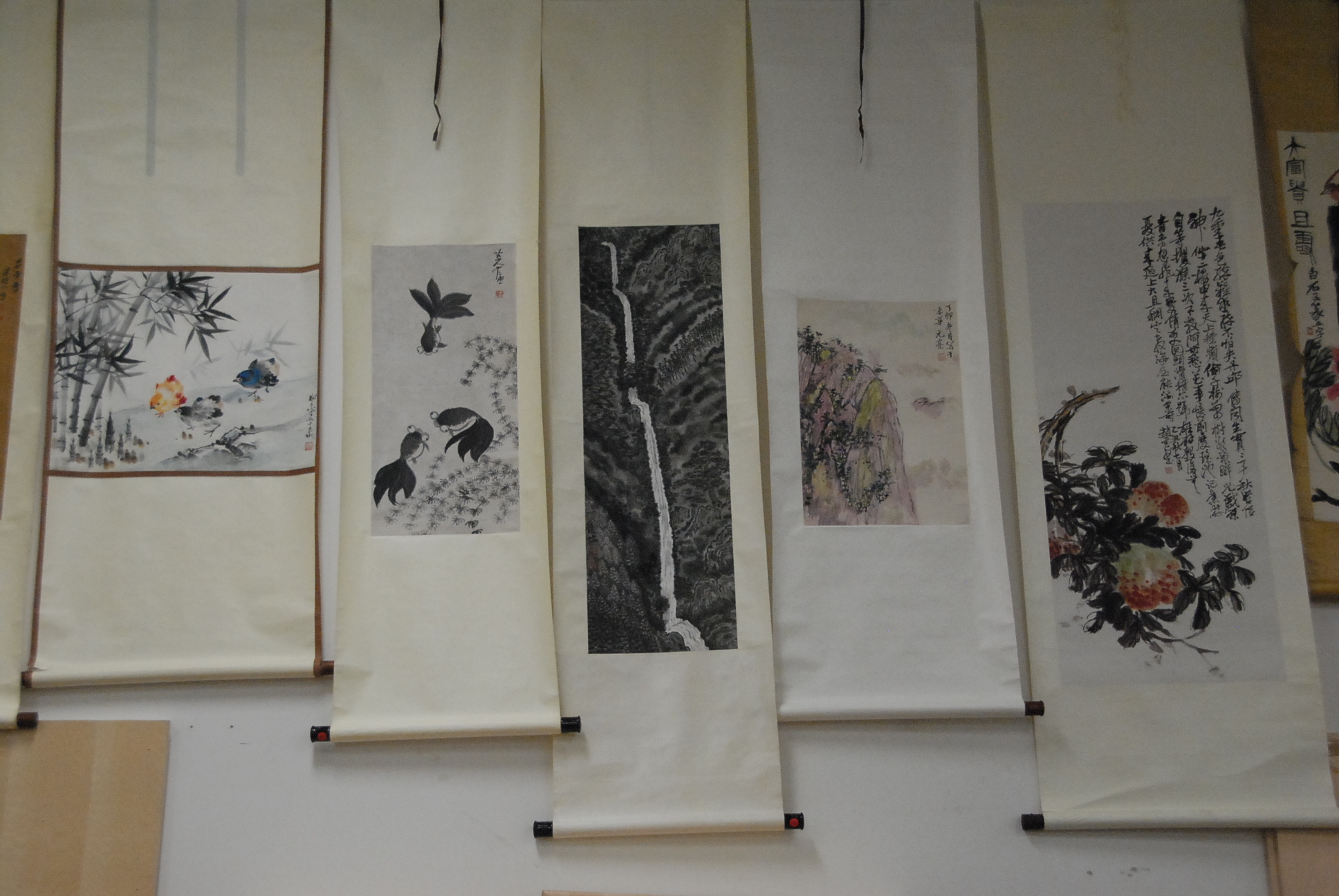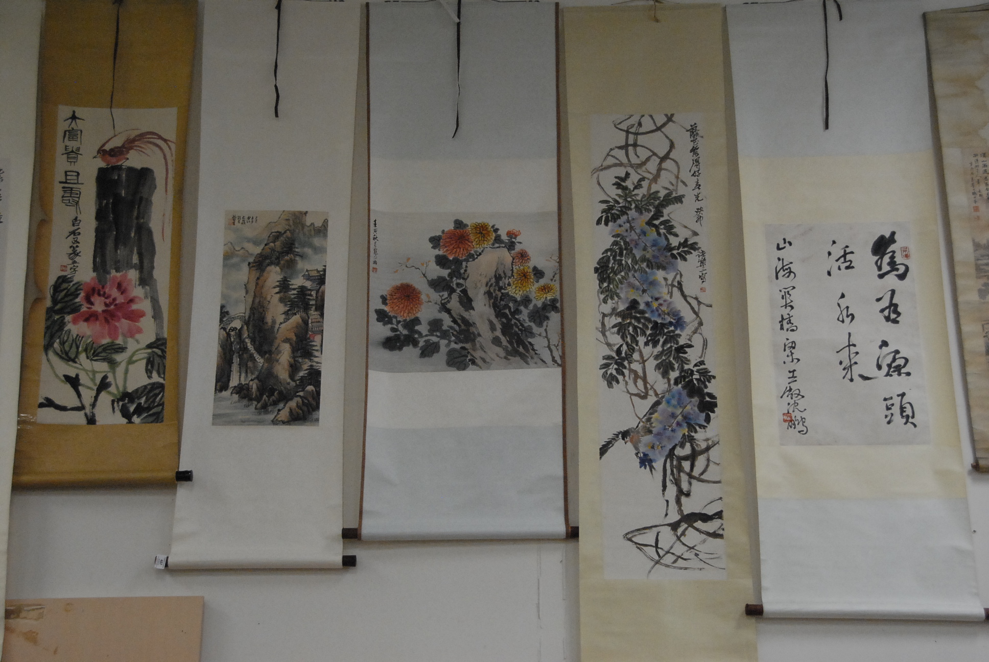 Two large Oriental watercolors on paper to include a scroll of scholars and scroll of a seated emperor wearing a yellow four claw dragon robe. both are 68 x 37