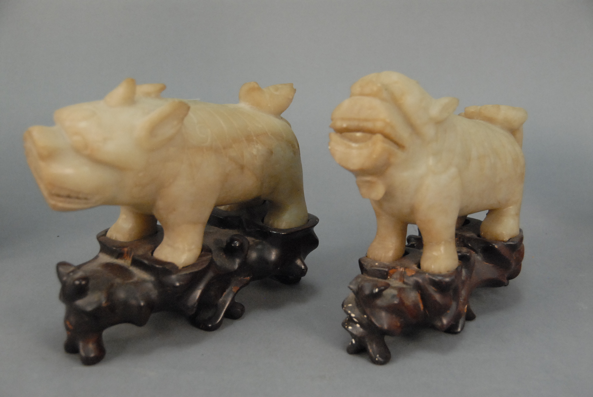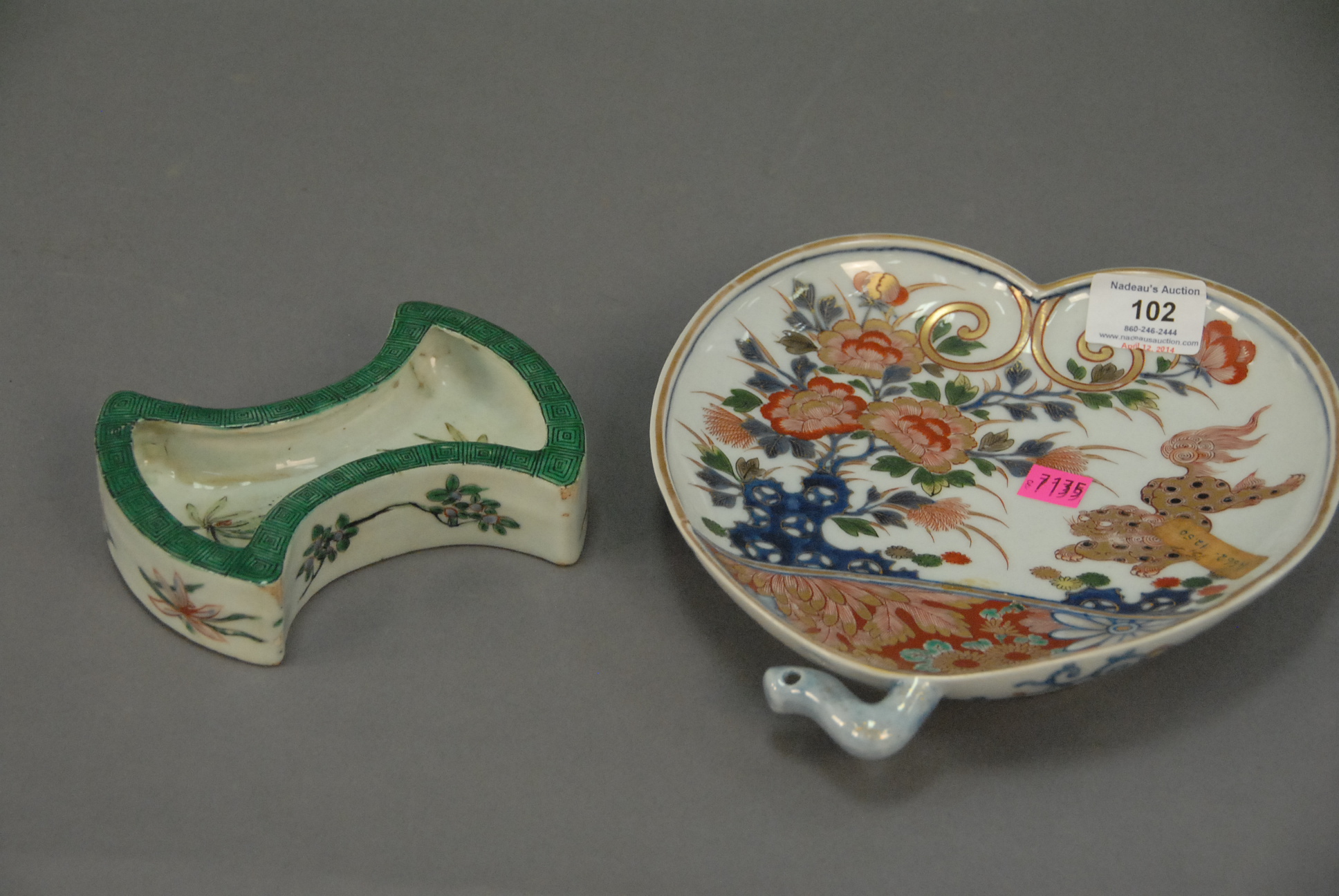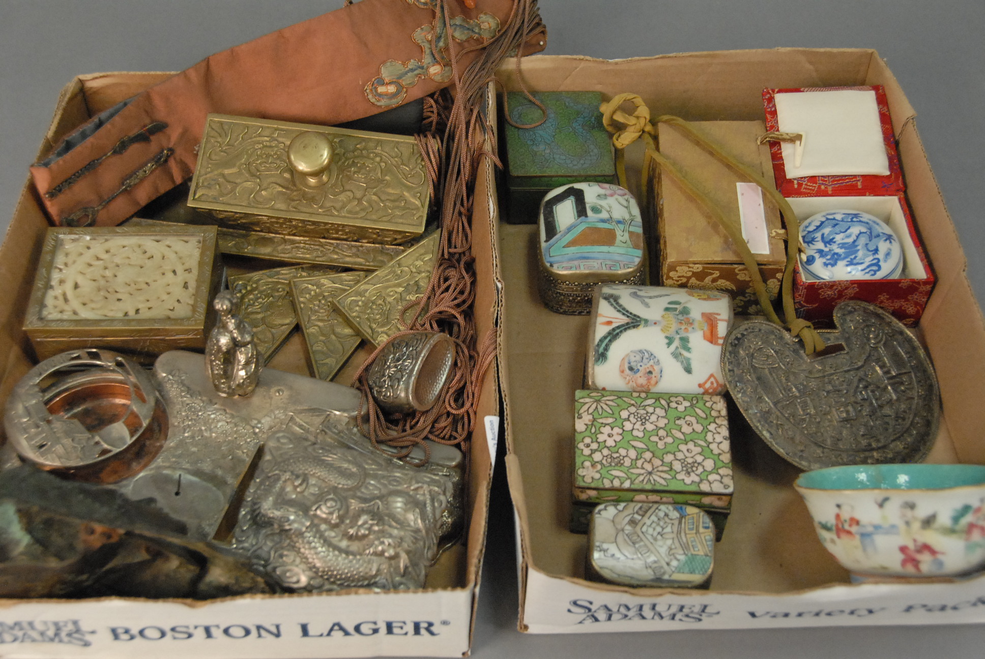 Two box lots of Chinese items to include desk set box with hardstone, small boxes, silver shield, blue and white round seal box with mark on bottom, and small bowl with seal mark on bottom.