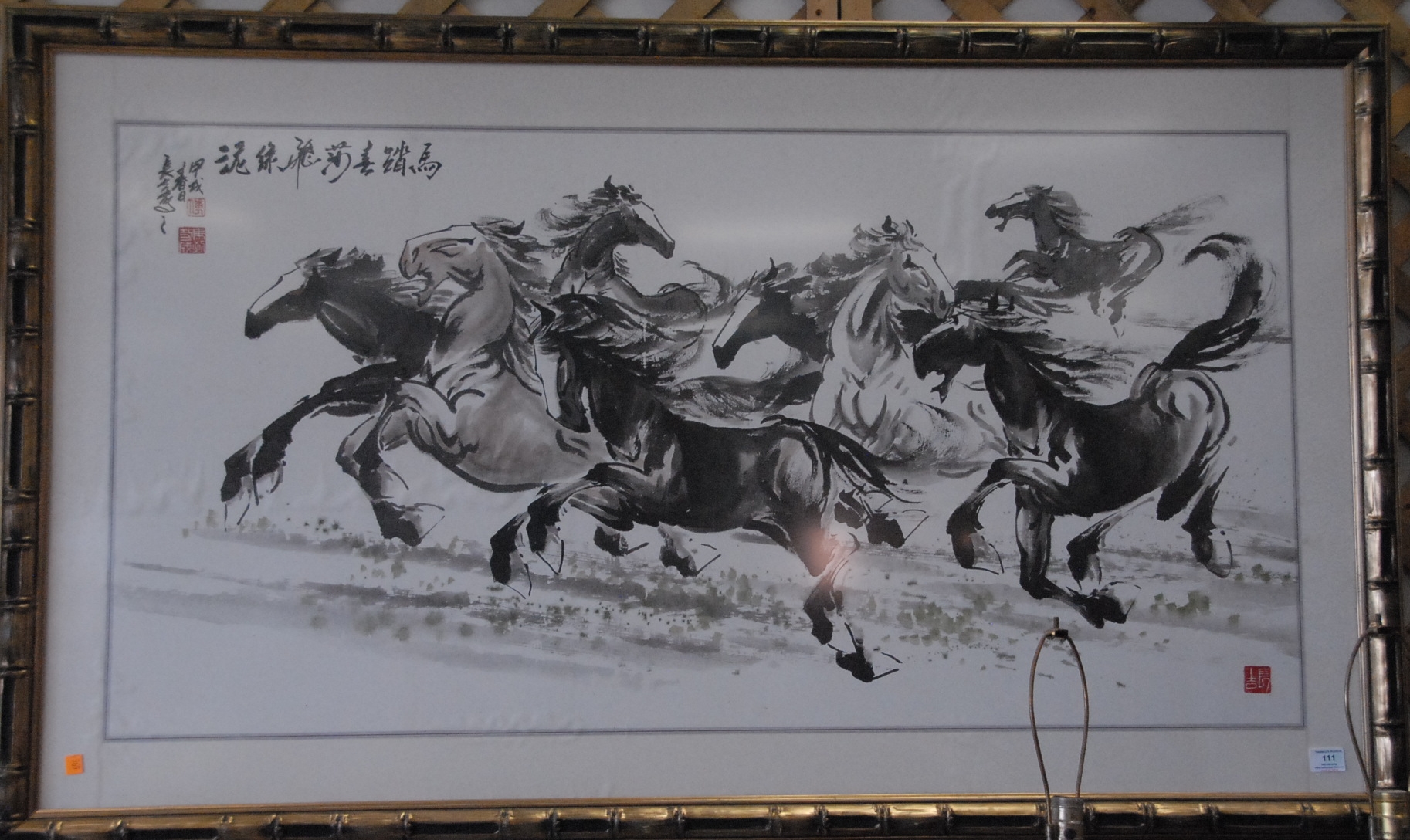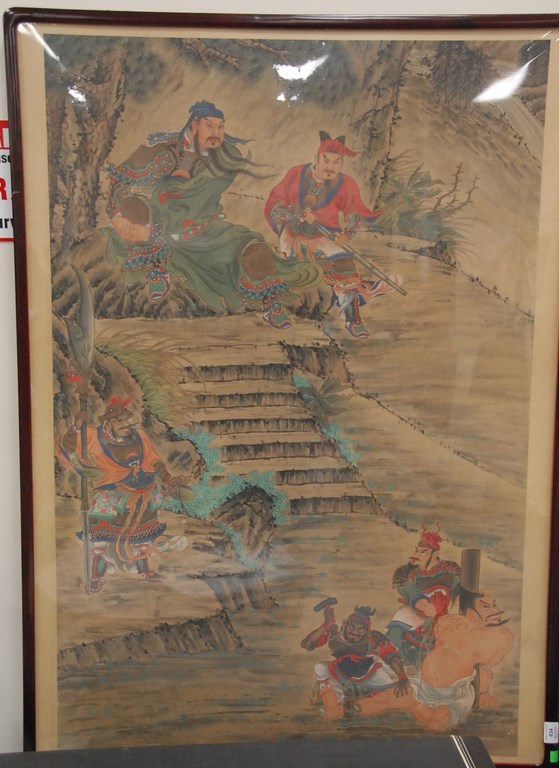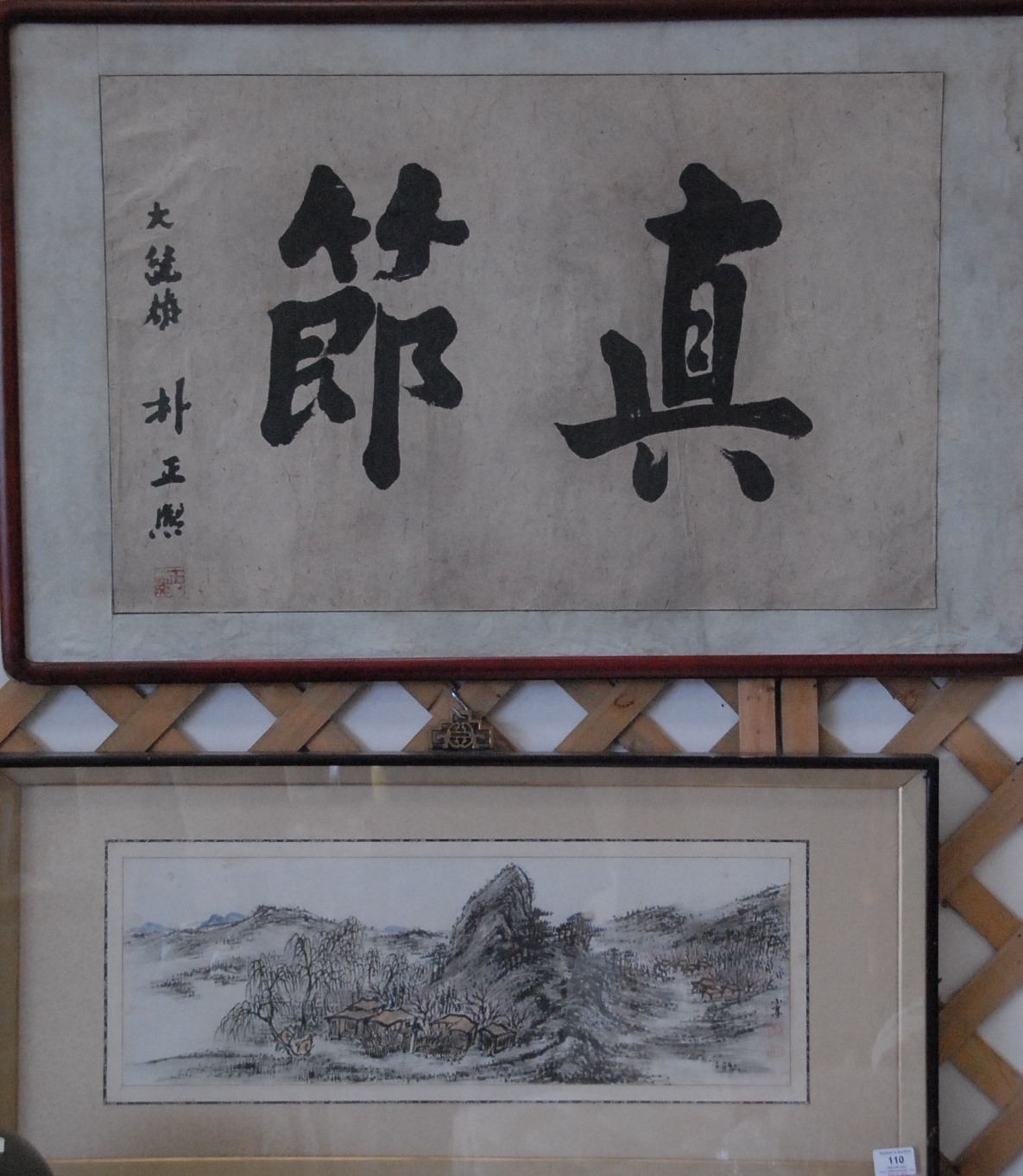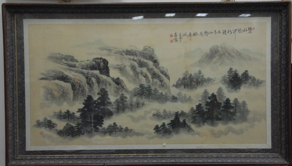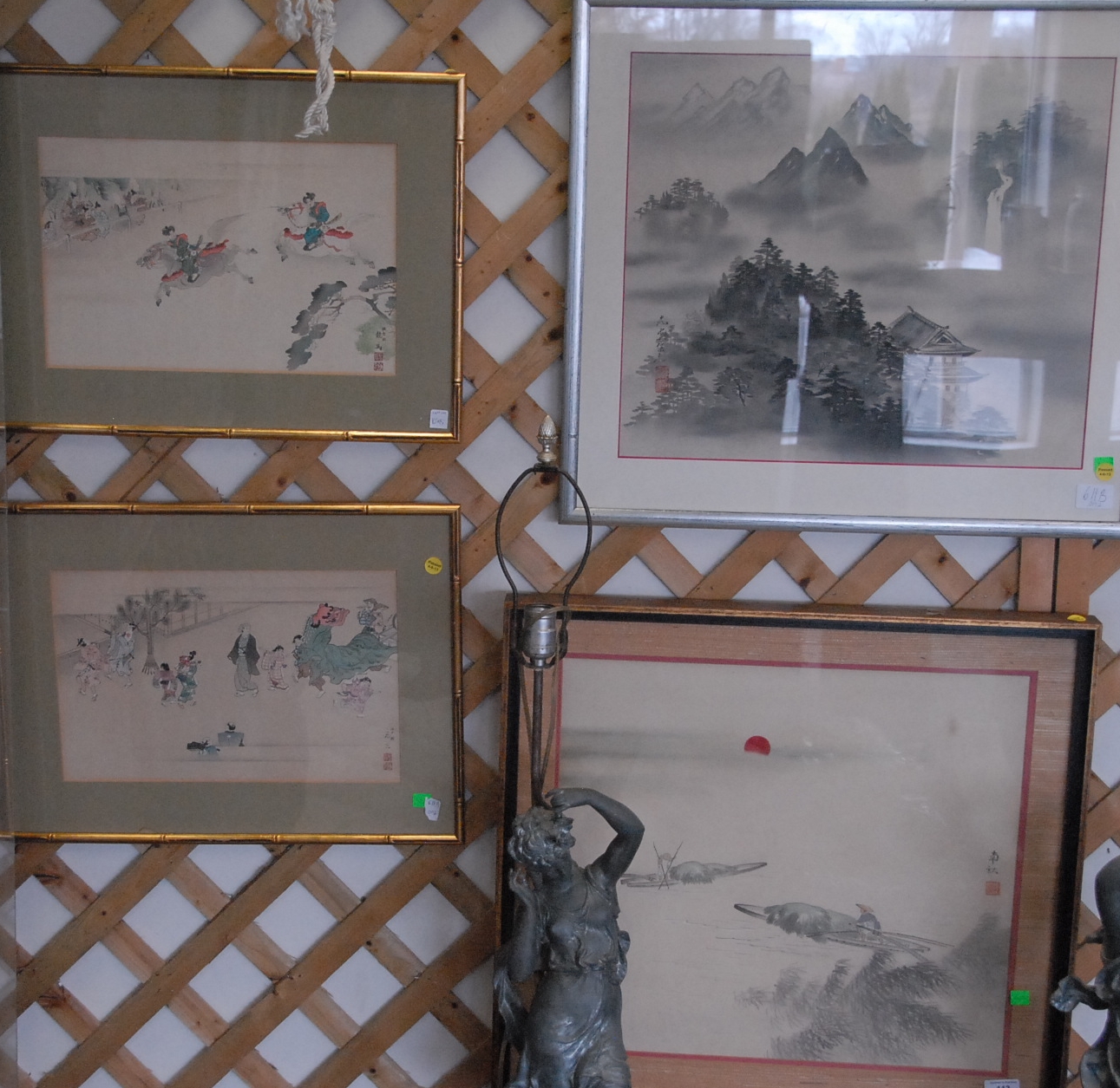 Four piece lot to include a pair of Japanese framed woodblock prints sight size: 10 x 15, Oriental watercolor on silk black and white landscape, and Oriental watercolor on silk of two bats at sunrise 18 x 20.