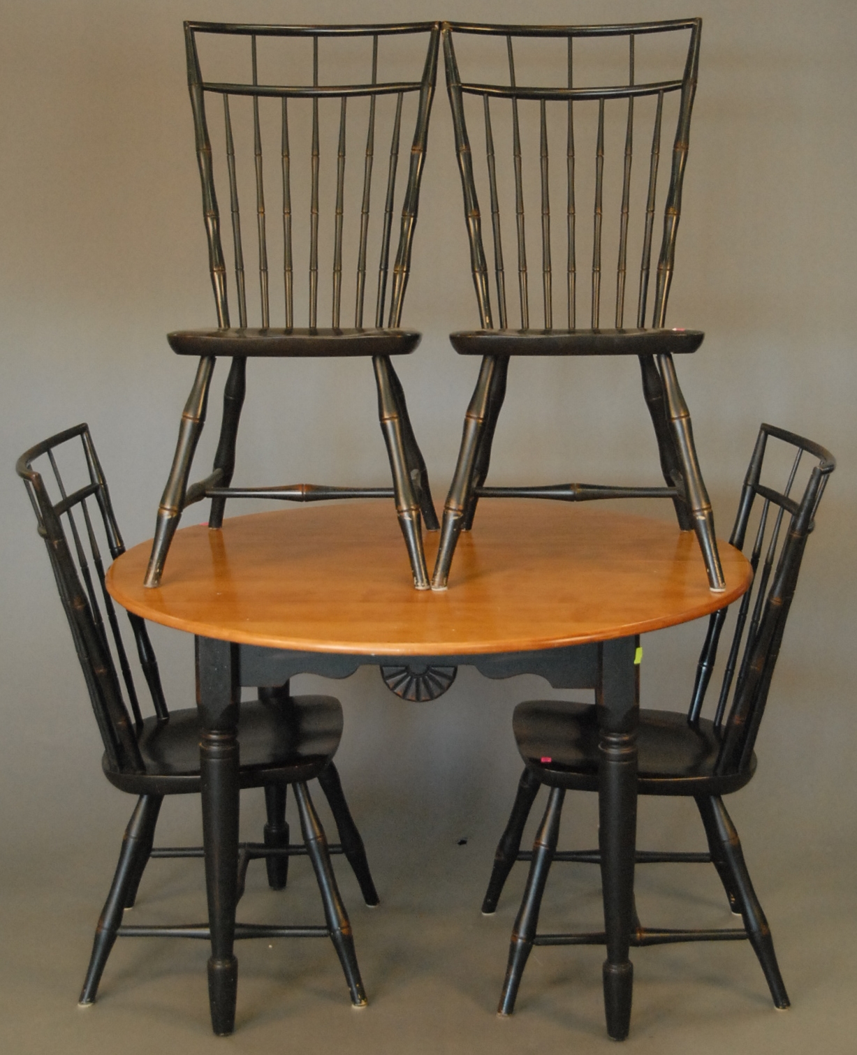 Nichols & Son contemporary five piece kitchen set to include round table with one leave and four Windsor style chairs. table: dia. 46in. opens to 62in.
