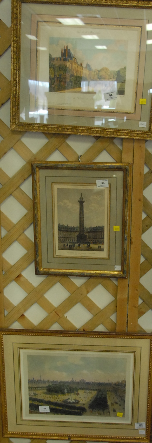 Three prints to include a hand colored engraving after Jean-Baptiste Marie Chamouin French, born 1768 Colonne de la Place Vendome, #21, hand colored engraving Louis Garneray French 1783-1857 after Auguste Garneray French, 1785-1829 Vue du Chateau Du Cote du Pare from Vuedela Malmaison plate 1, and Philippe Benoist 1813-1880 after Felix Benoist 1818-1896 Paris dans sa splendour/Place Royale.