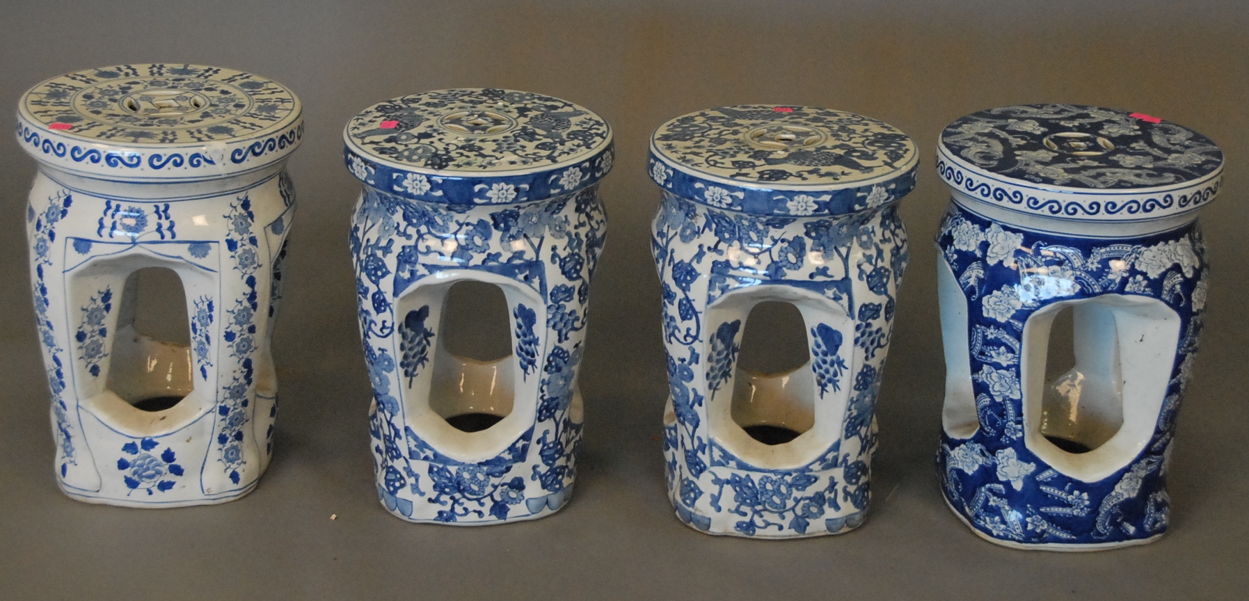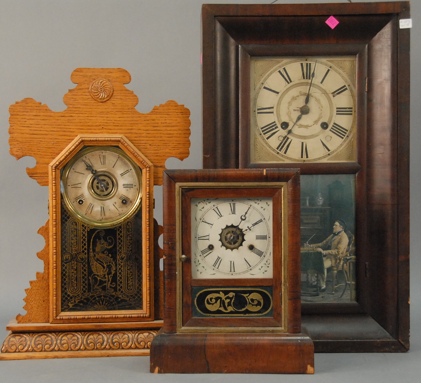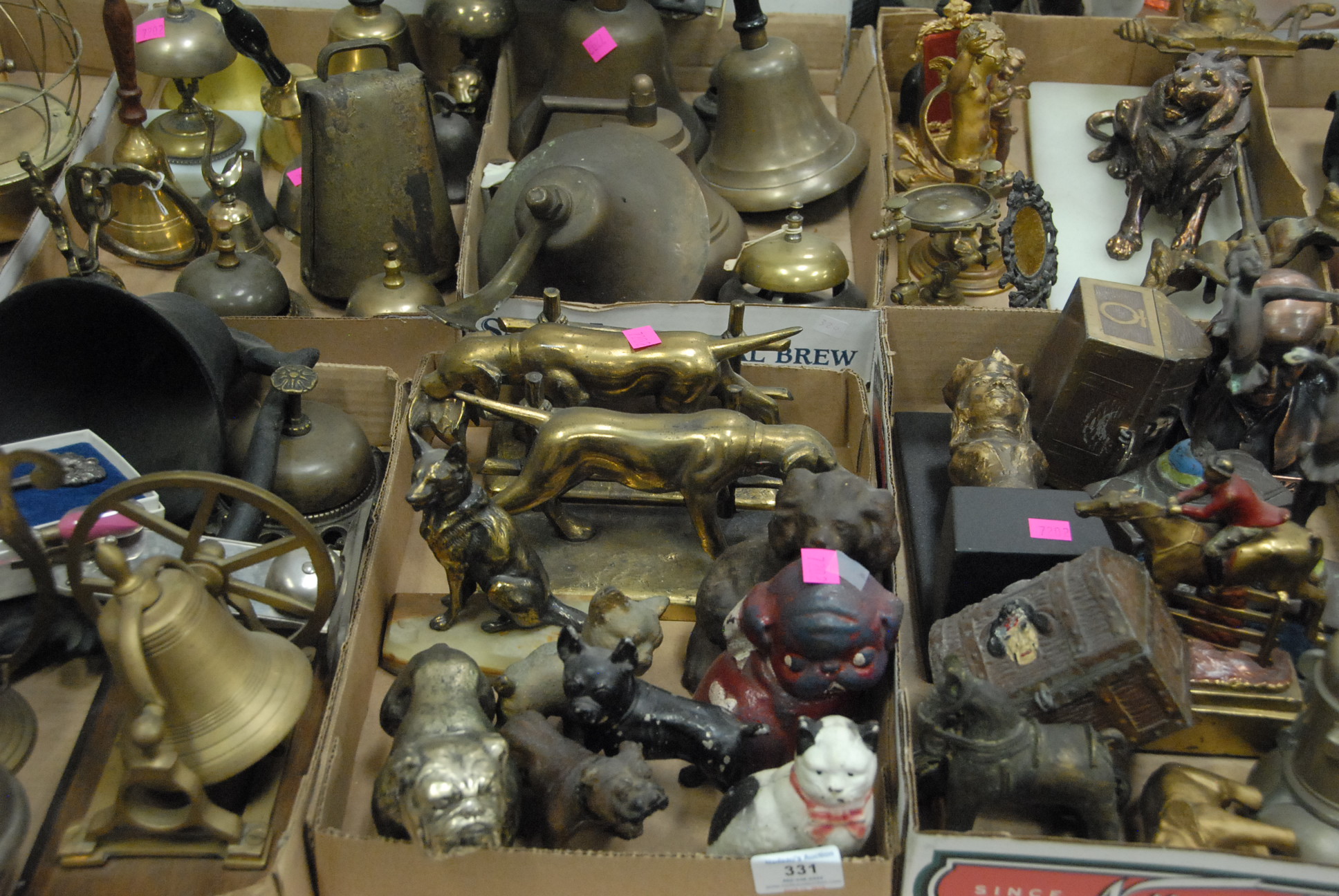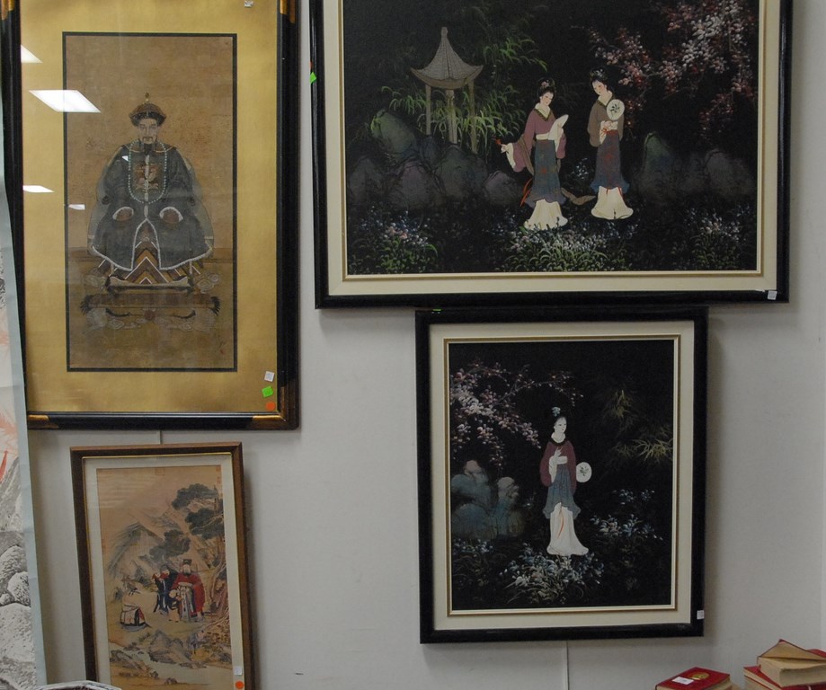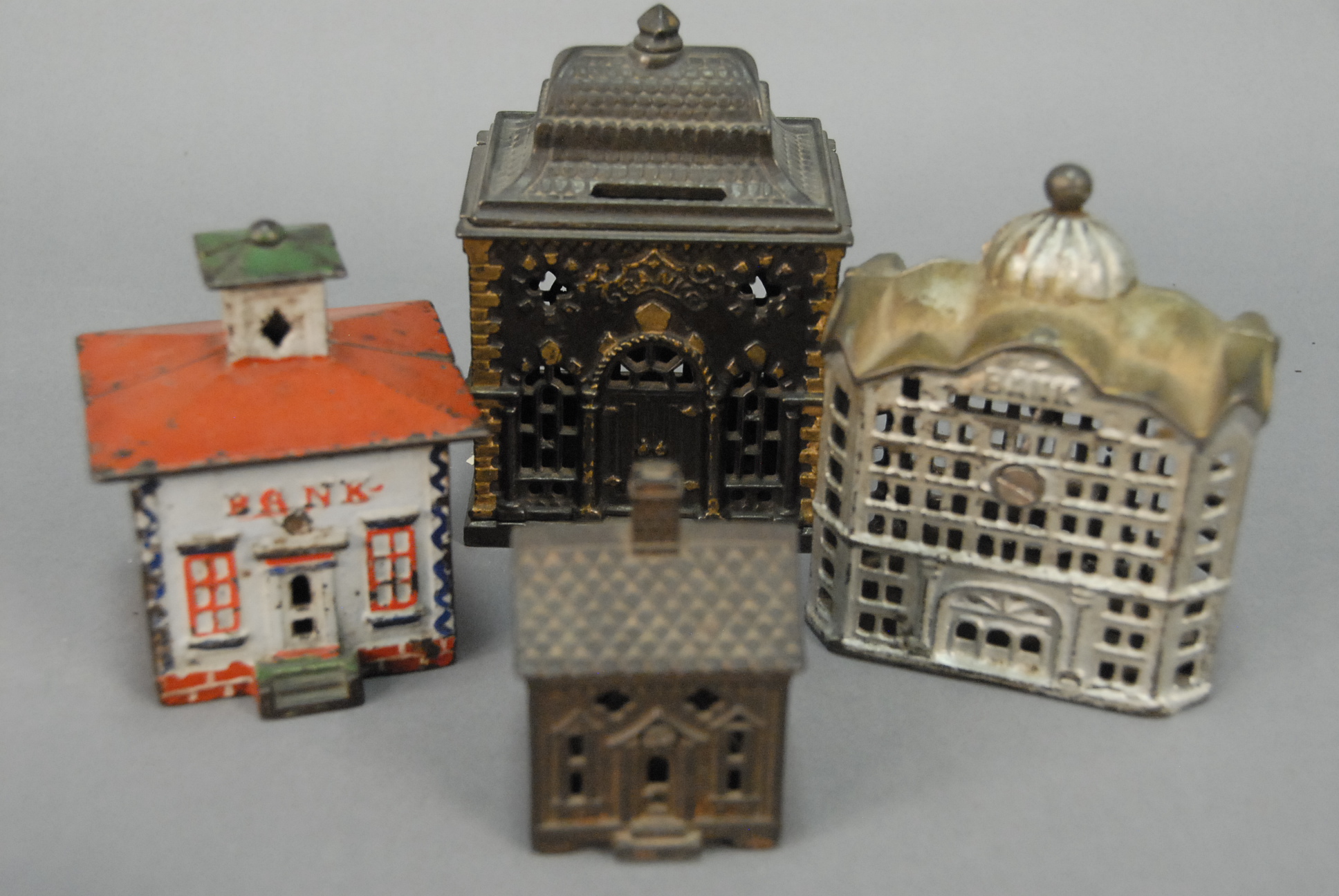 Group of four cast iron still banks to include ornate still bank building, school house with copula, miniature house with chimney, and capitol dome bank. hts. 3in. – 5in.
