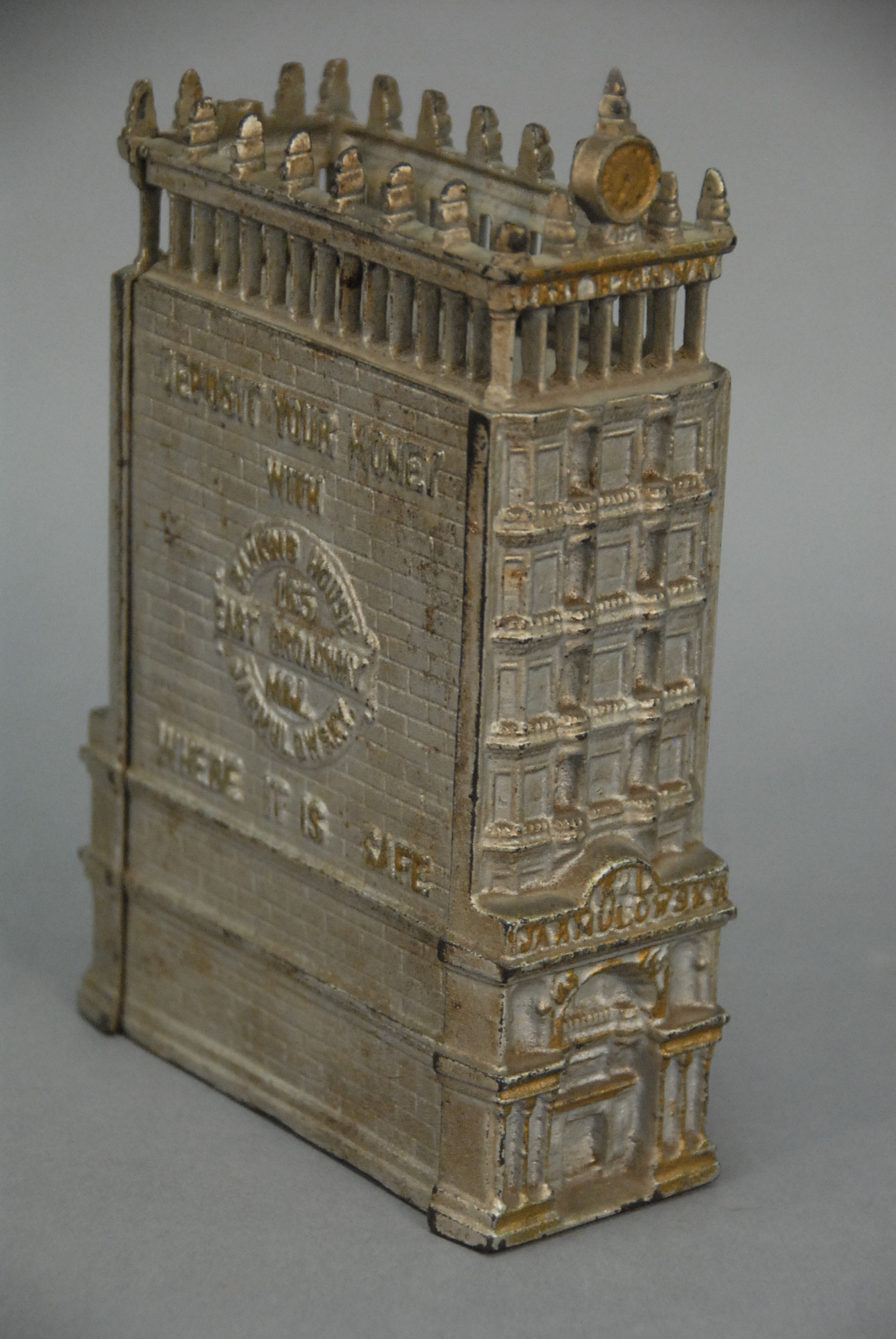 Cast iron Jarmulowsky Building still bank, made in the US with silver paint, stating Deposit your money with Banking House Jarmulowsky East Broadway, WHERE IT IS SAFE. ht. 8in.