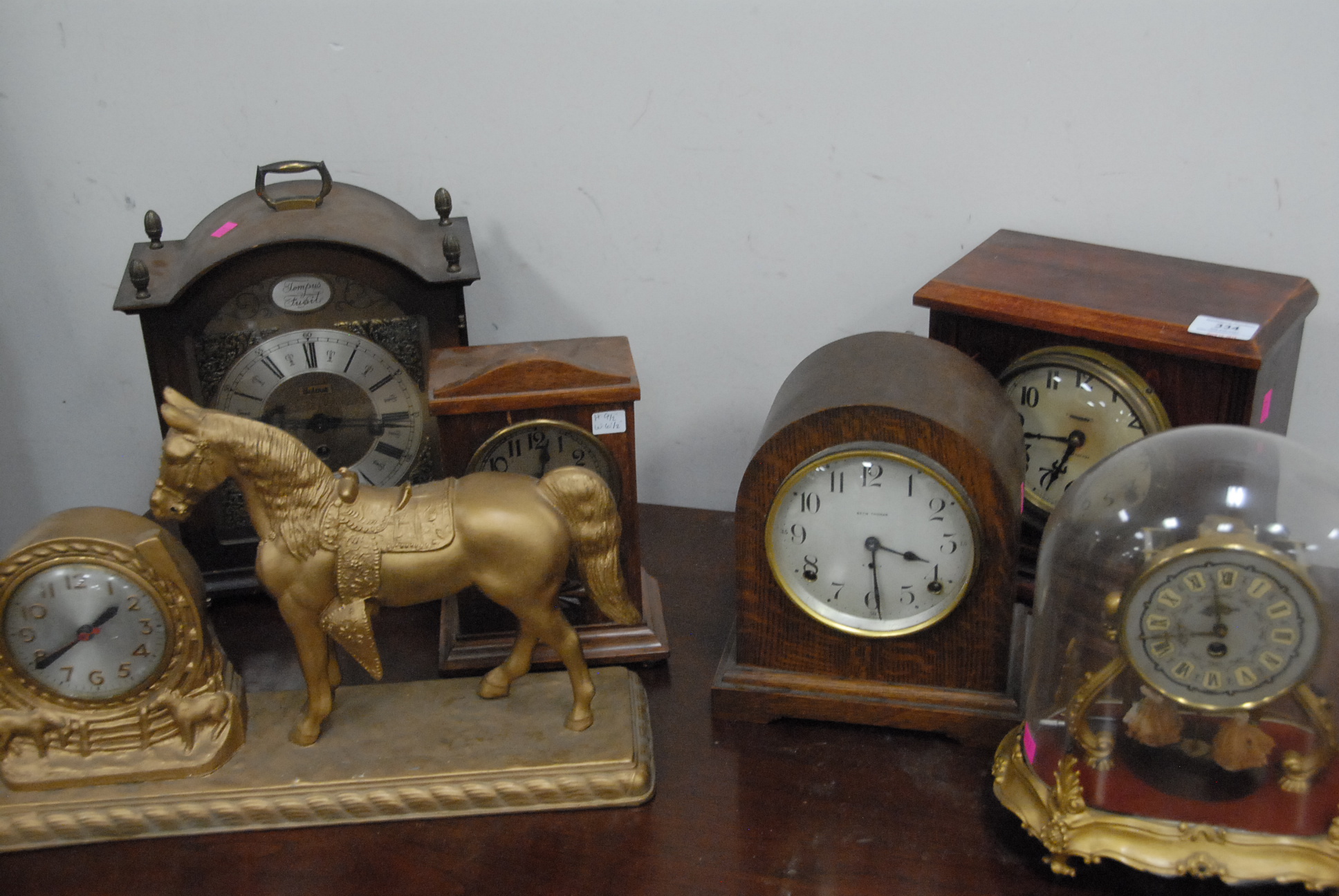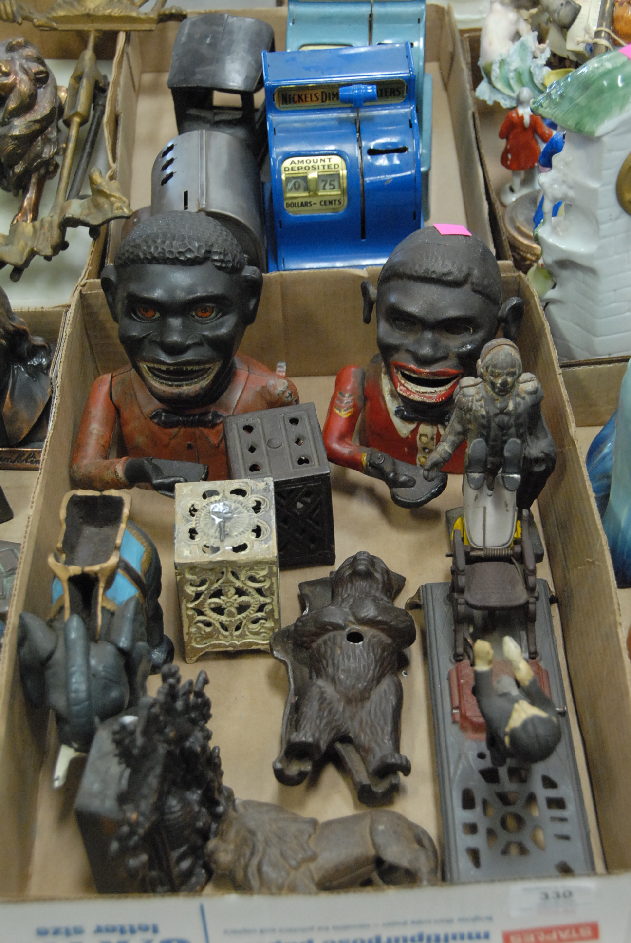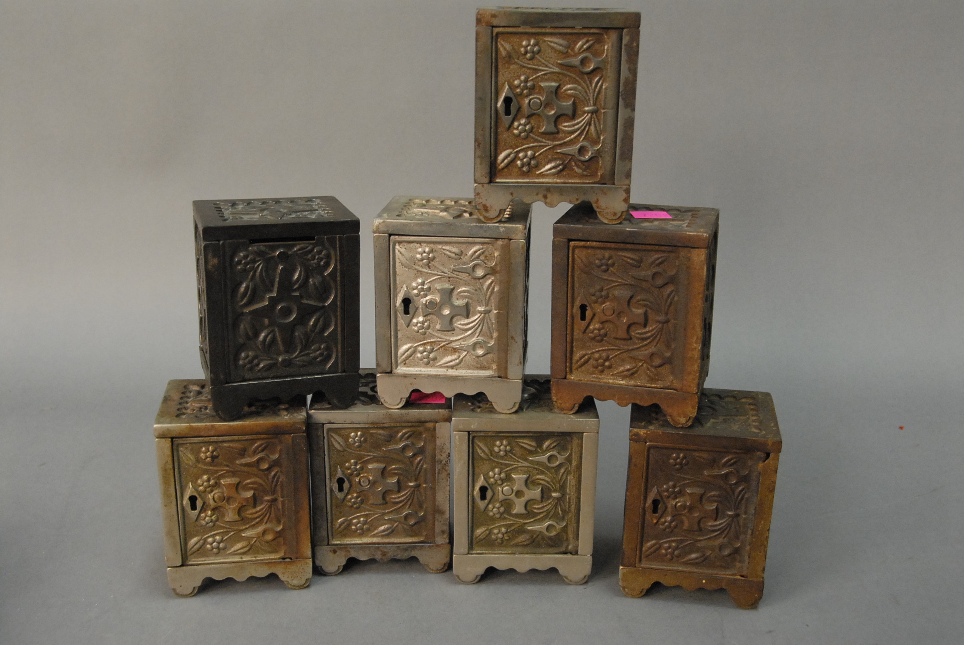 Group of six cast iron still banks with locks to include security safe deposit with drawer, two small safe deposit with locks, coin deposit bank with lock, black and brass safe deposit bank, and an ornate bank. hts. 4in. – 6in.