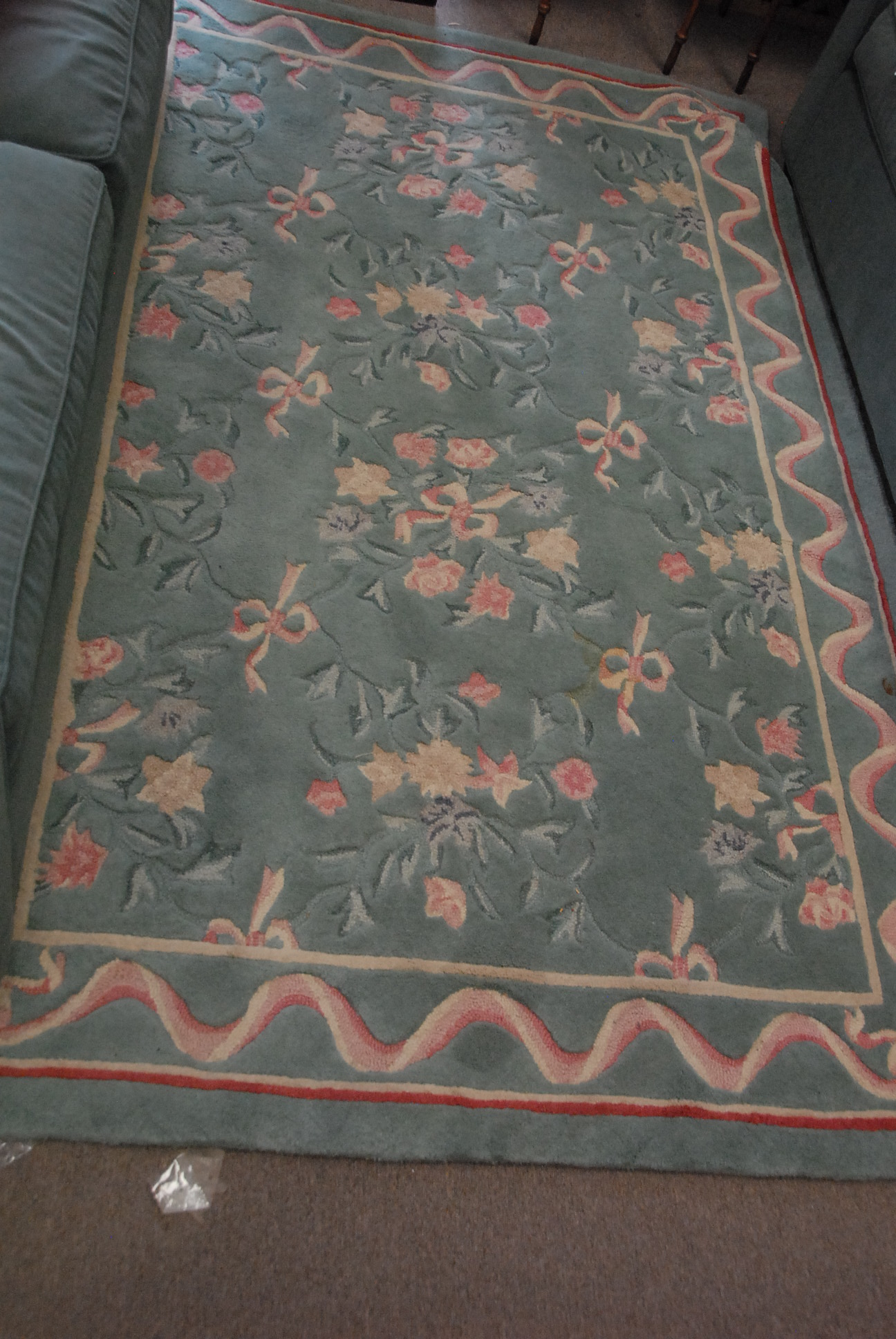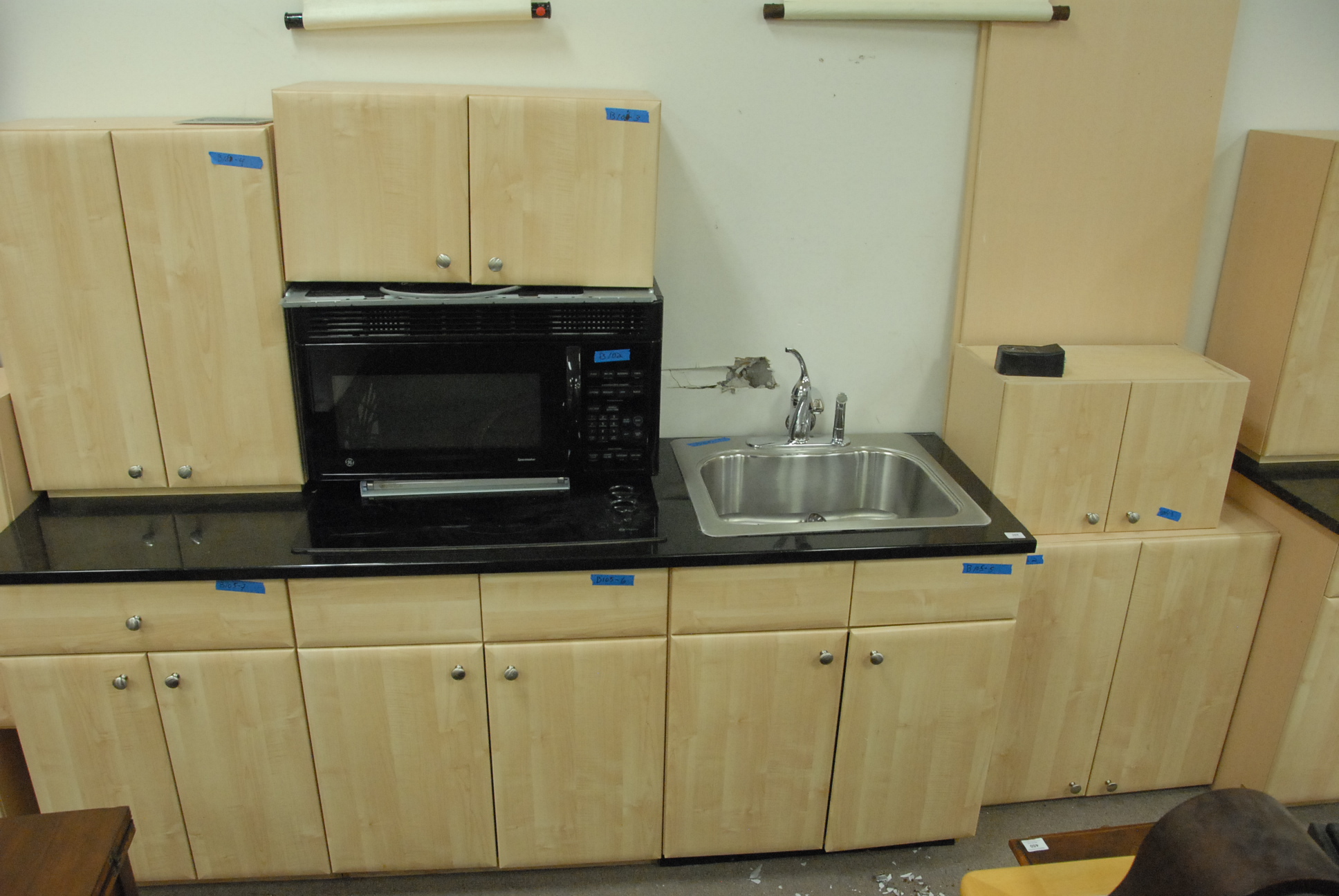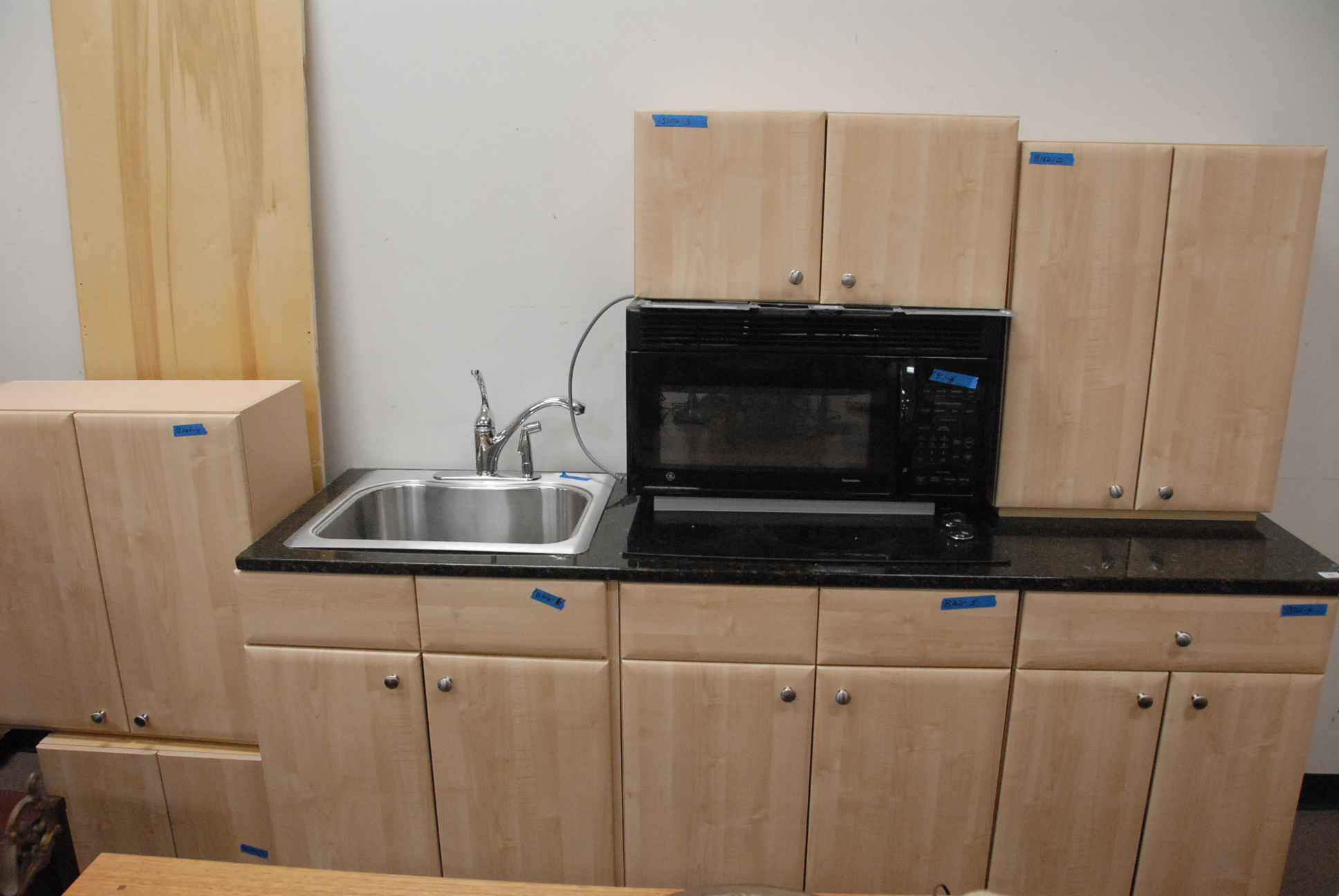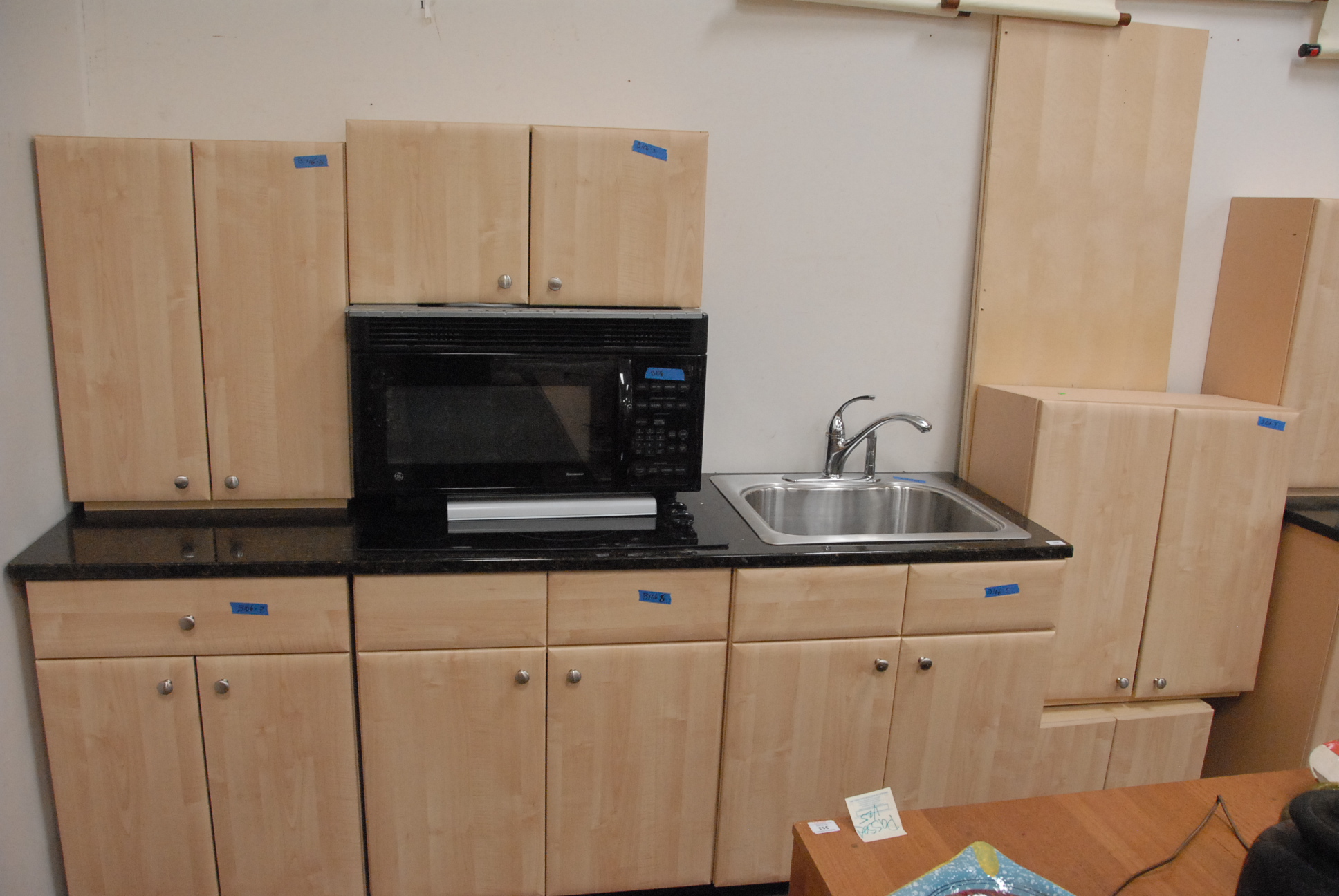 Custom kitchen set having granite tops, seven kitchen cabinets with hardware, stainless sink with faucet, GE profile stove top, GE wall mount microwave and side panels for refrigerator.