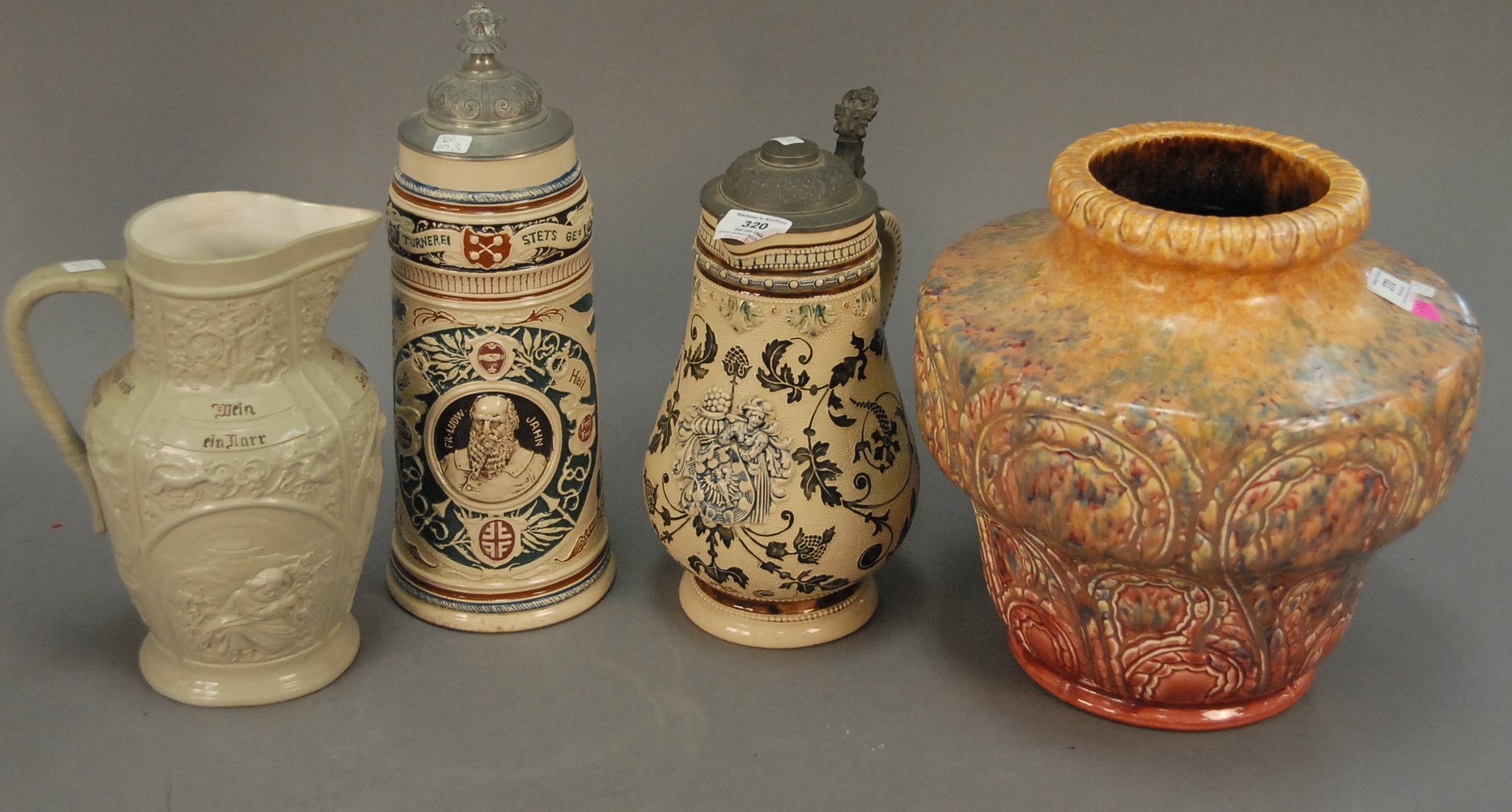 Four piece lot to include three large pitcher/steins one is Villeroy and Boch and two not marked, ht. 13in., 11 3/4in., & 10in. and Large Luxembourg vase, ht. 11 1/4in.