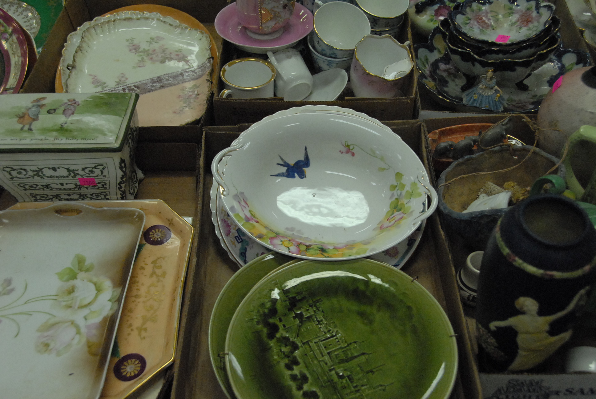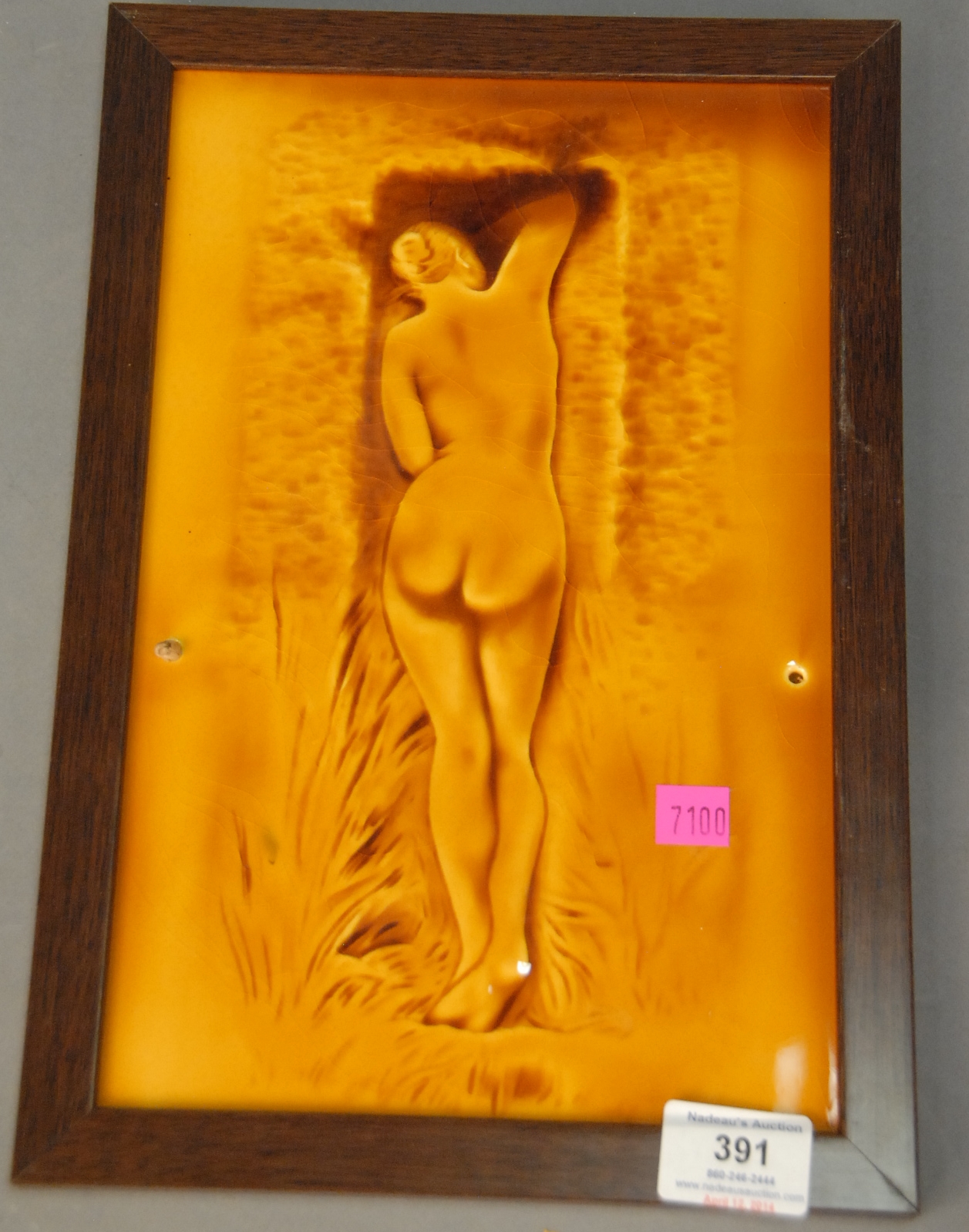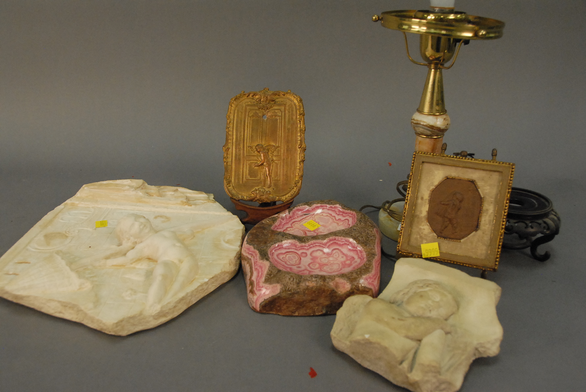 Six piece lot to include an Italian school terracotta relief plaque depicting cherubs amidst ruins, framed with marble backing paper ht. 5in., French gilt bronze wall plaque inscribed Aldebert Ed Ltd / 23 Rue de Capuchines/Paris/G. Faraomi Septeur. ht. 7in. wd. 5in., two plaster plaques, marble tray, and table lamp.