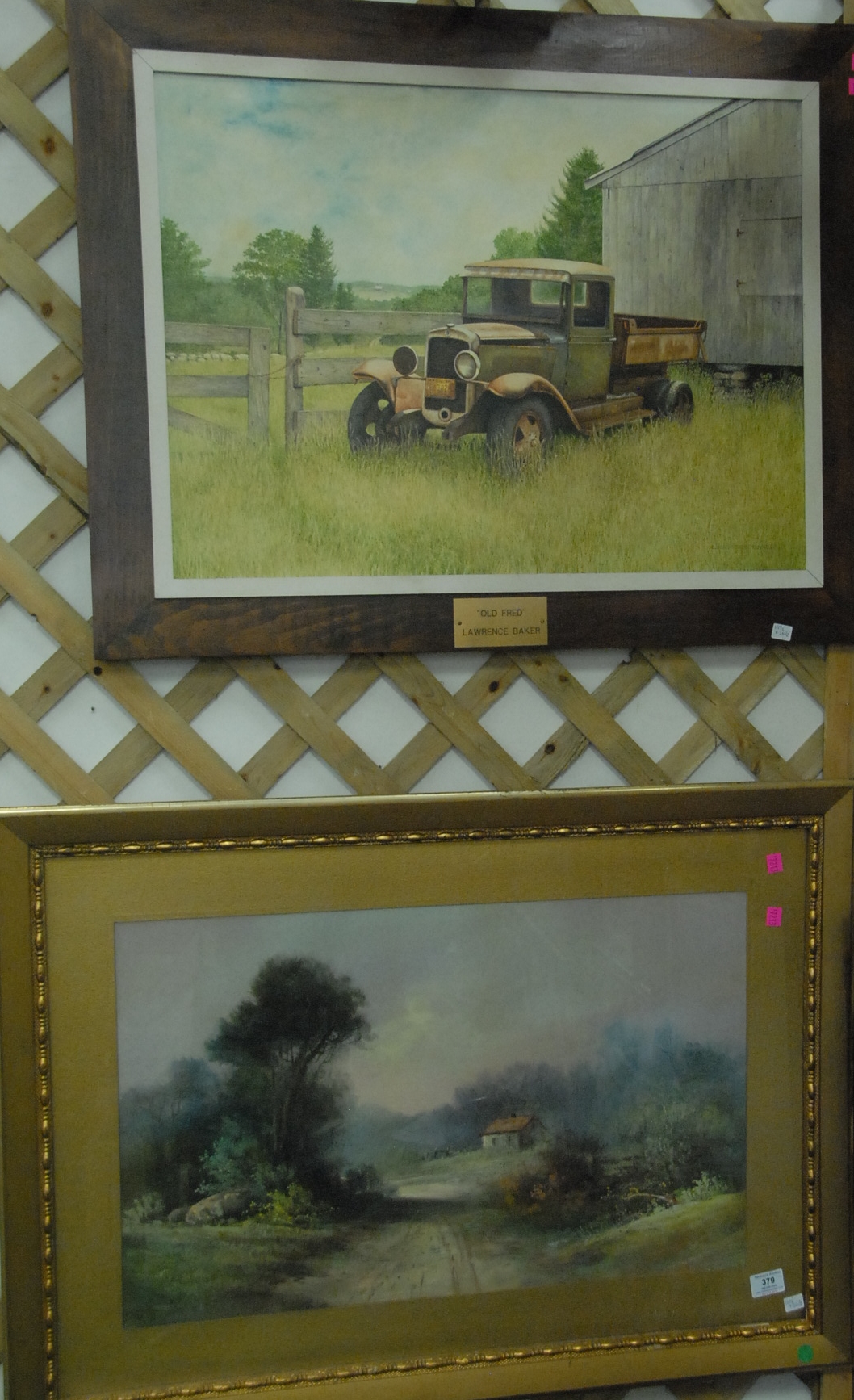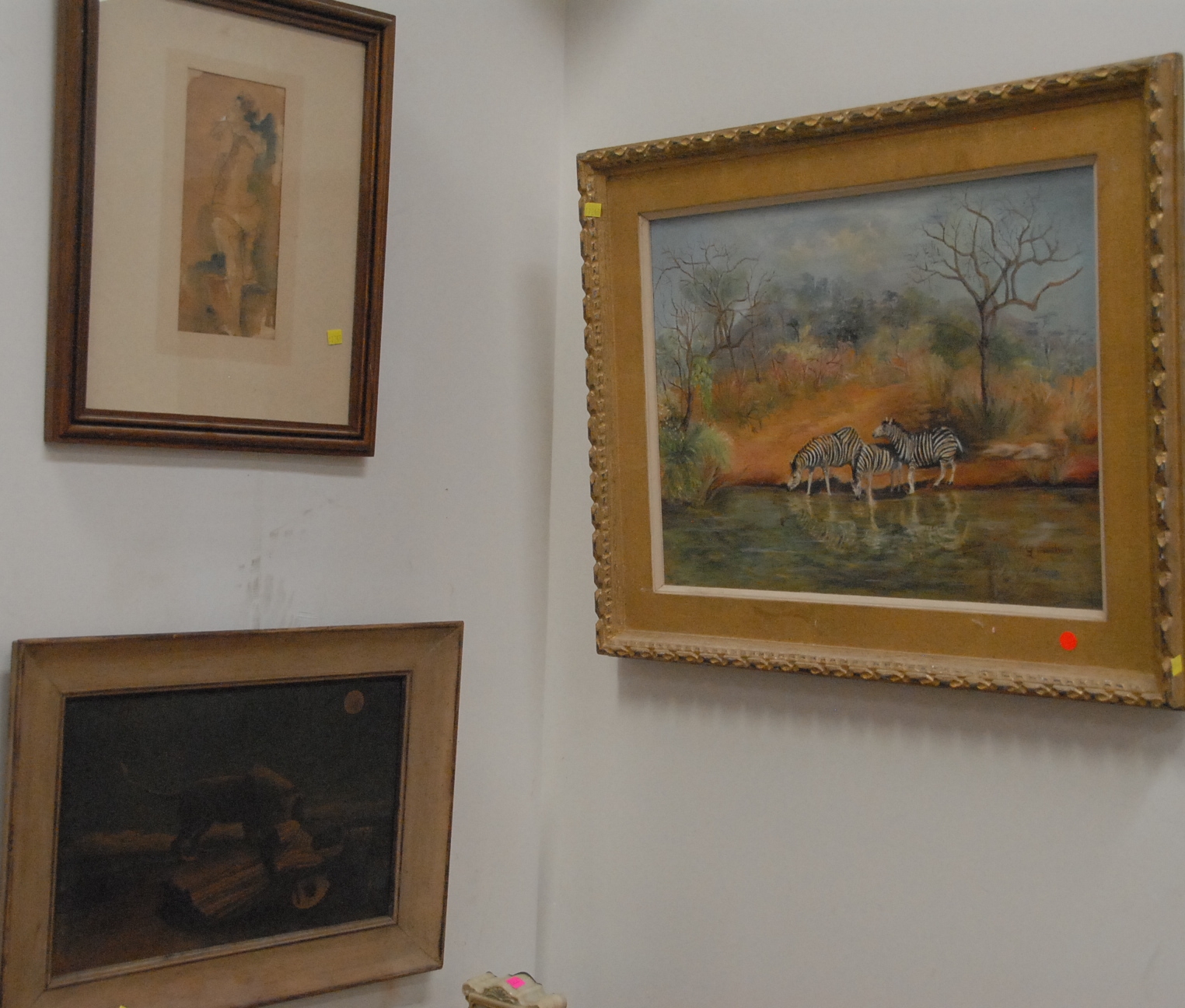 Six piece lot to include, Tom Oliphant water color Waiting in the Wings 16×20, two pastels signed indistinctly, oil on board with zebras by water signed Hamilton, oil on canvas bust of a man, and a print by Henri Rousseau.
