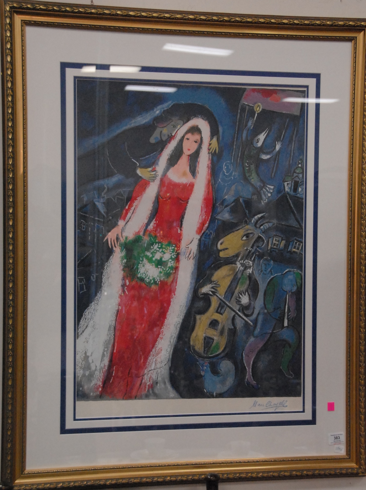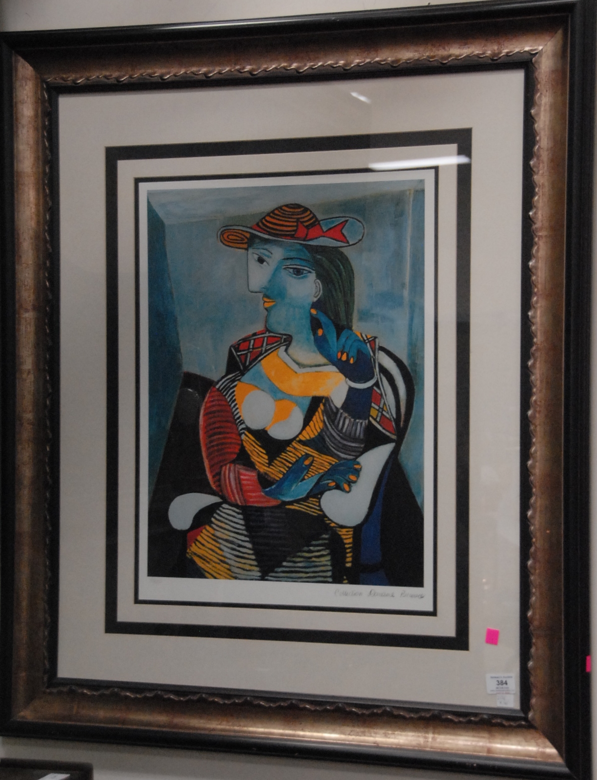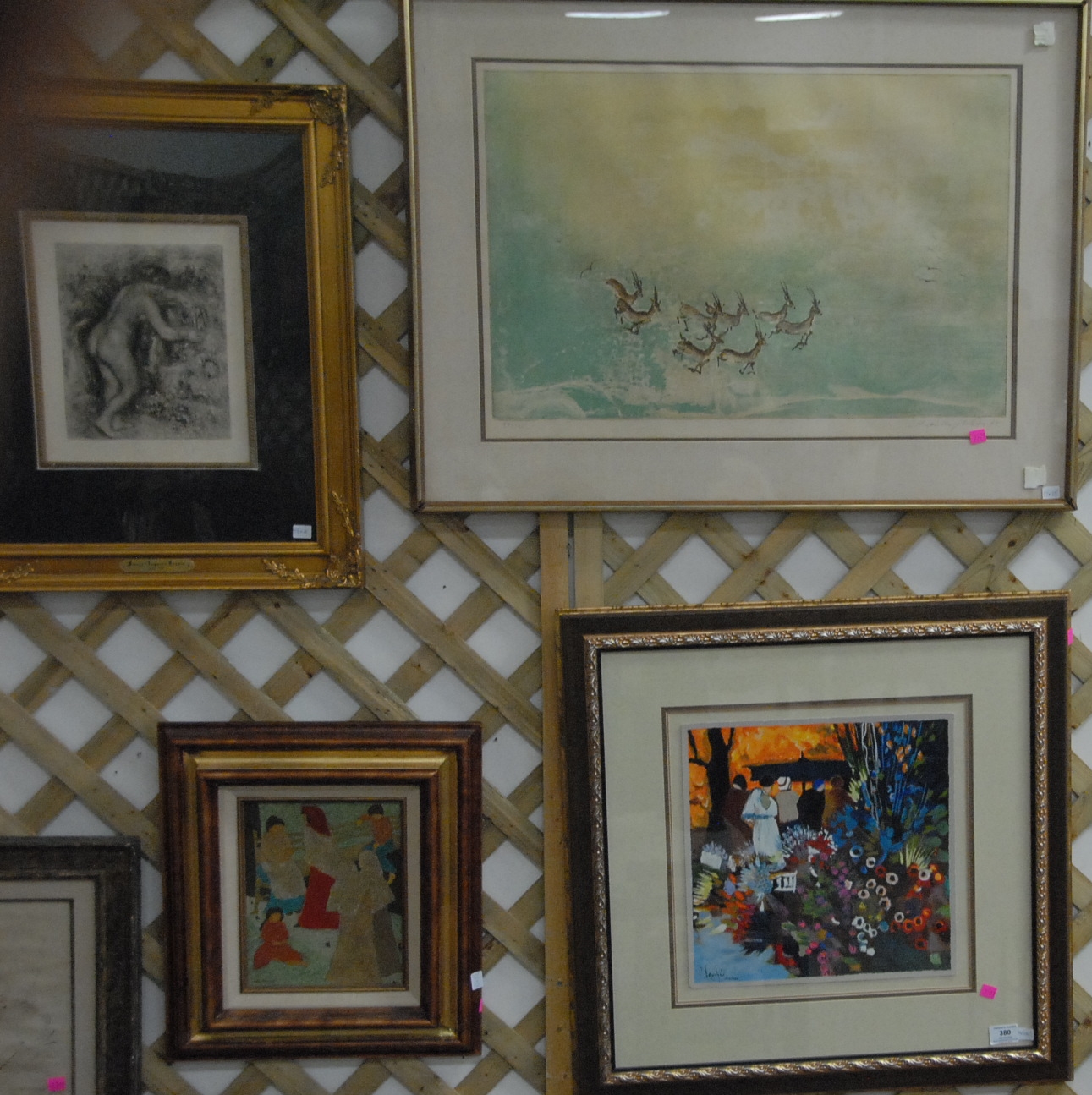 Group of four framed items to include Renoir framed print 9 1/2 x 8, pencil signed print of antelope prancing, a print signed lower left Favigere 14 x 14 and a collage.