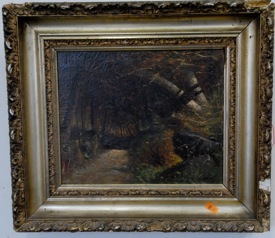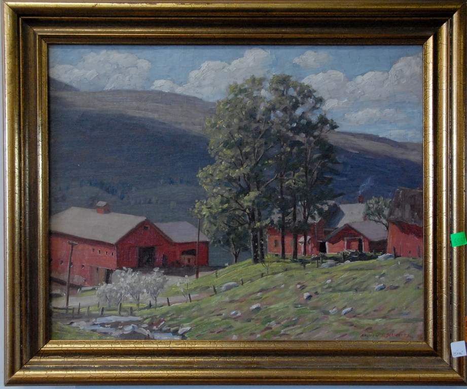 Andrew Thomas Schwartz 1867-1942, RED BARD LANDSCAPE oil on canvas signed lower right Andrew T. Schwartz having The Wiley Gallery label on reverse, 15 x 19.