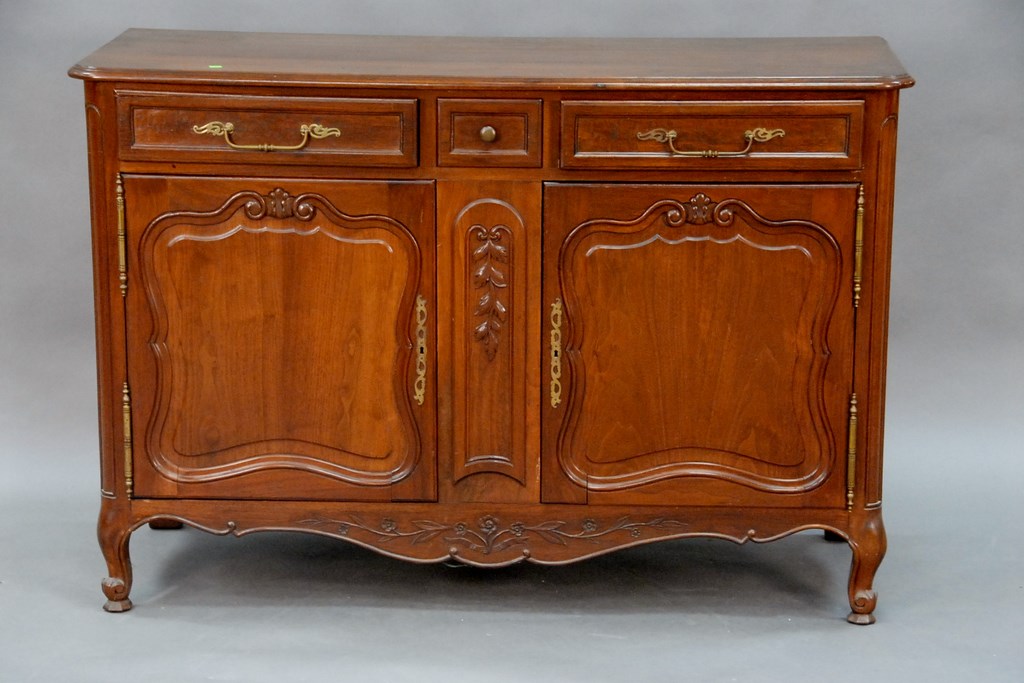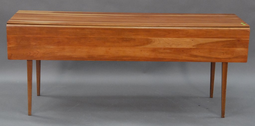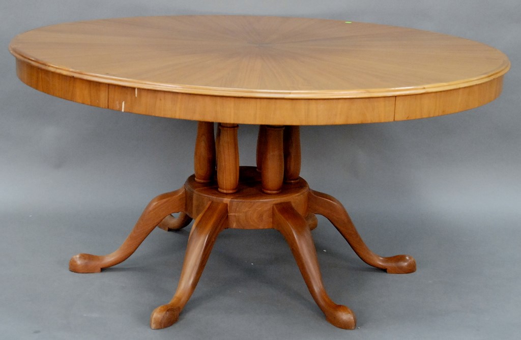 Custom handmade walnut round dining table with six extra leaves to make larger round along with custom center lazy susan and custom bench/cabinet to hold leaves, closed: dia. 60in. open: dia. 84in.