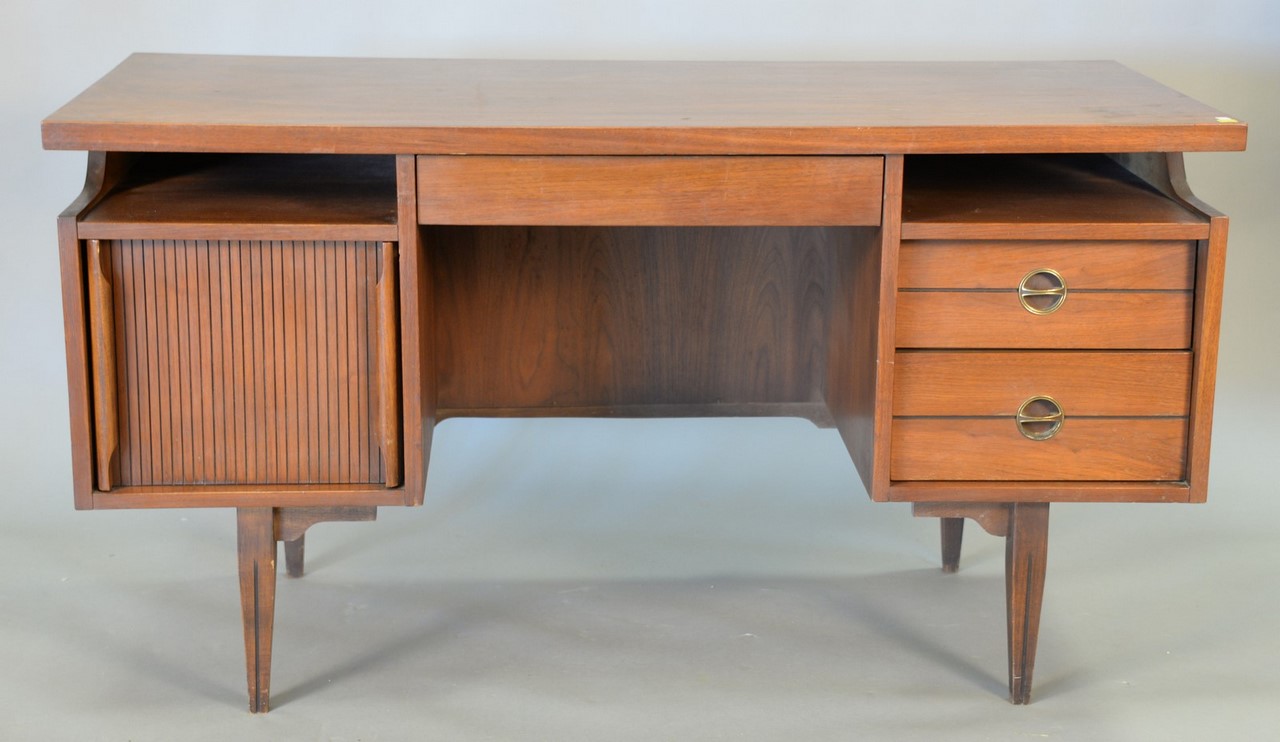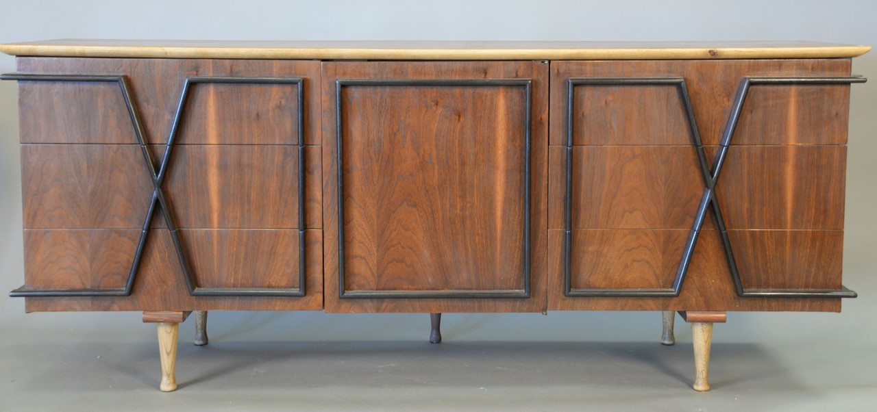 Merton Gershun for American of Martinsville nine drawer dresser, refinished walnut with black ebonized geometric designed pulls. ht. 31 in. wd. 74 in. dp. 19 1/2 in.