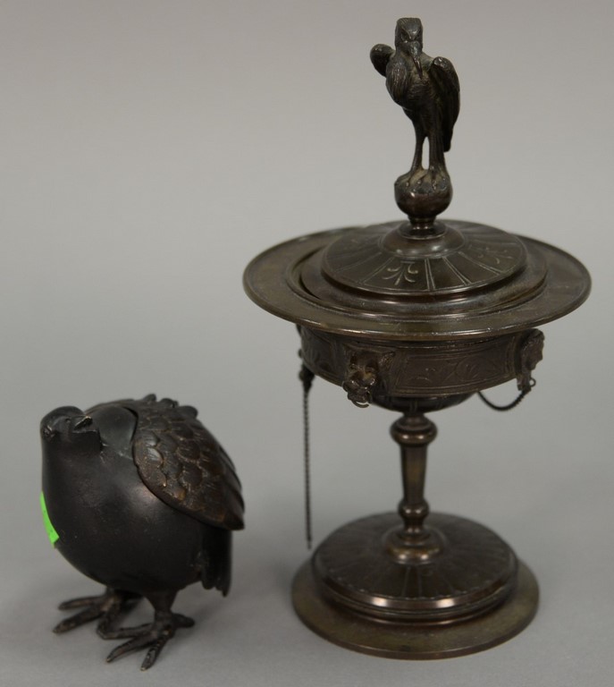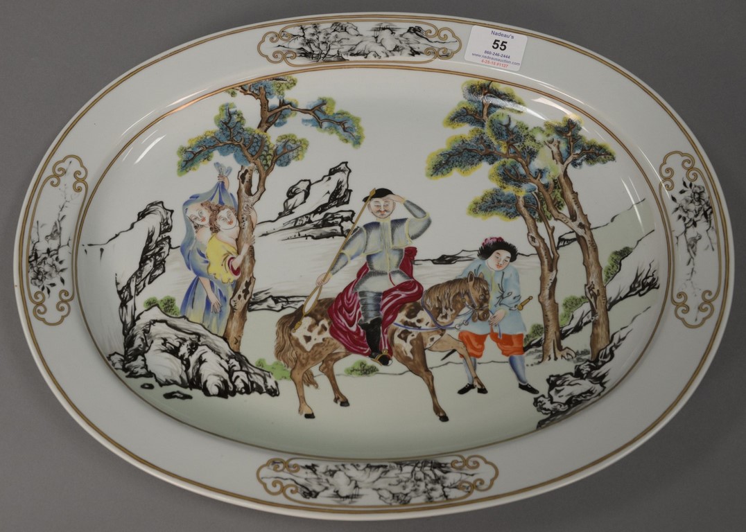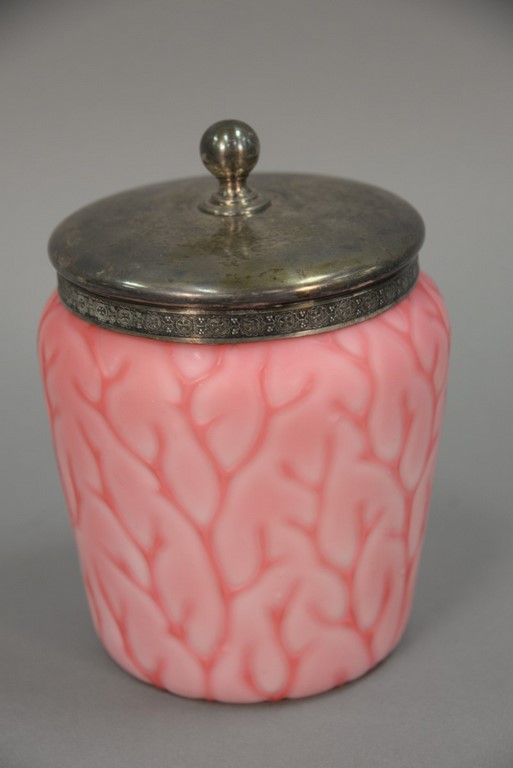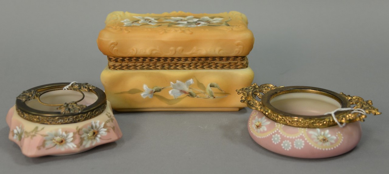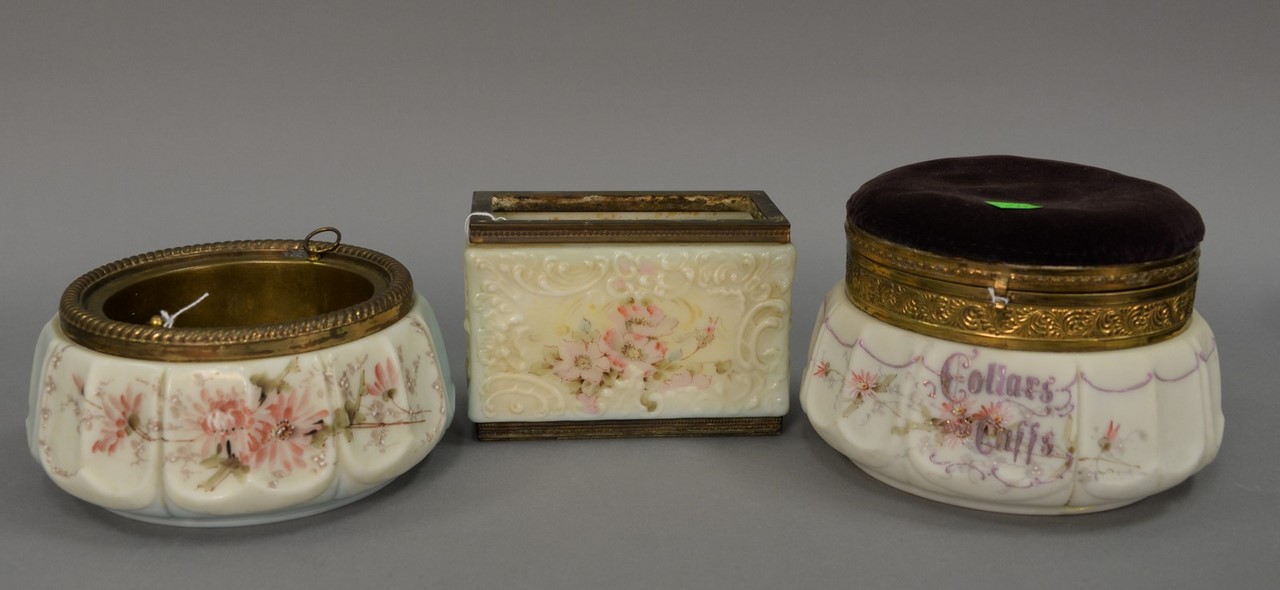 Three large Victorian Wavecrest pieces including collars and cuffs dresser box with cushion top, ht. 5 1/4 in., dia. 7 3/4 in. a large round open container with cloth cover, ht. 3 3/4 in., dia. 8 in. and a rectangular open container, ht. 4 1/2 in., lg. 6 1/4 in., wd. 3 1/4 in.