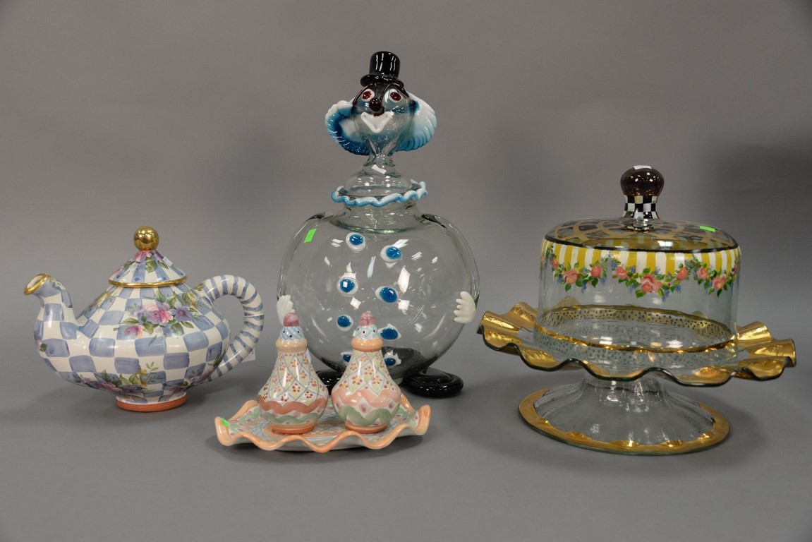 Four piece group Mackenzie Child’s group to include glass cake plate with dome, morning glory teapot, salt pepper and undlerplate, and a Murano glass clown punch bowl. clown: ht. 18 in., cake plate: dia. 14 in.