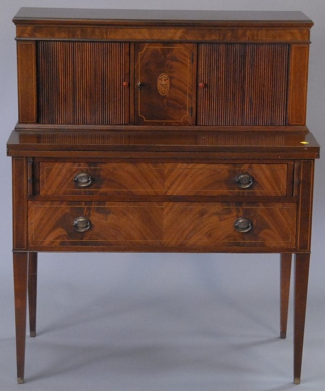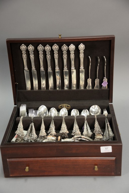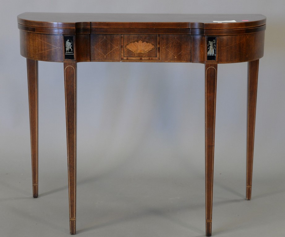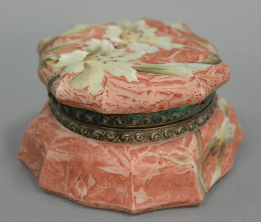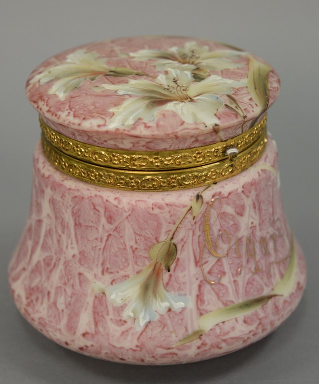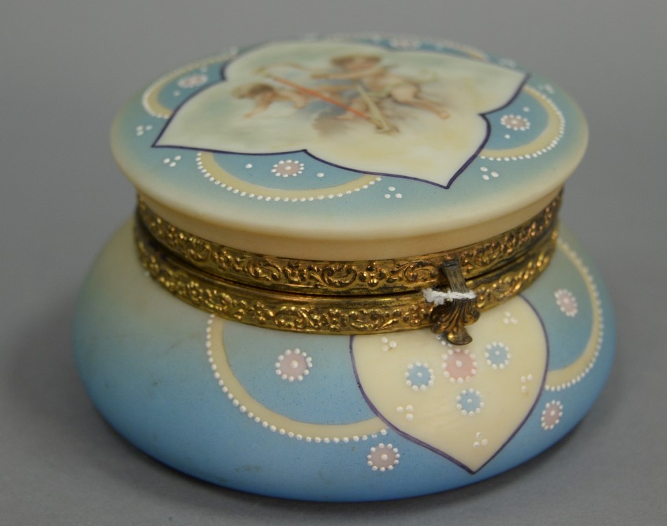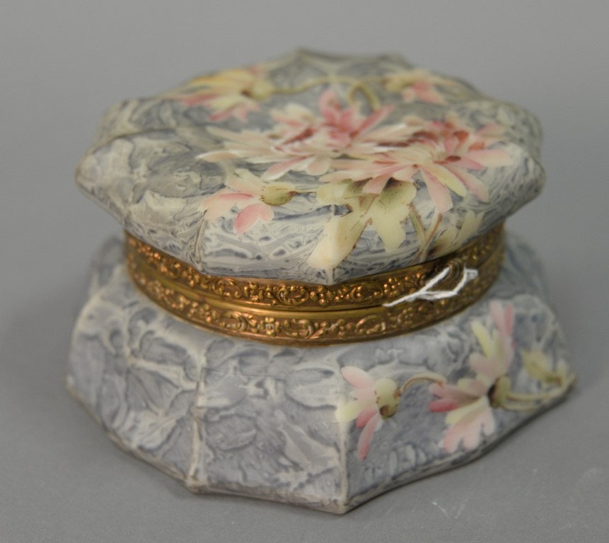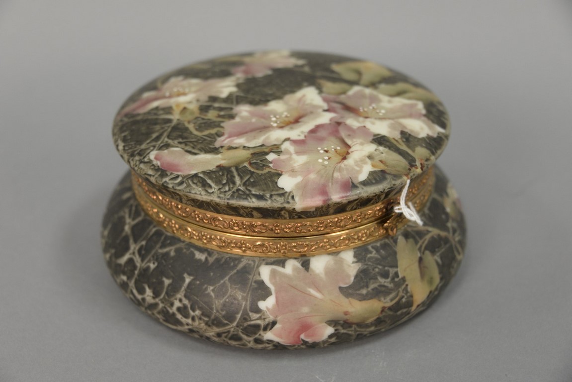 Kelva dresser or jewelry box, hand painted grey with flowers, silk interior with mounted mirror, Wavecrest style, stamped Kelva on bottom. ht. 3 1/4 in. dia. 6 in.
