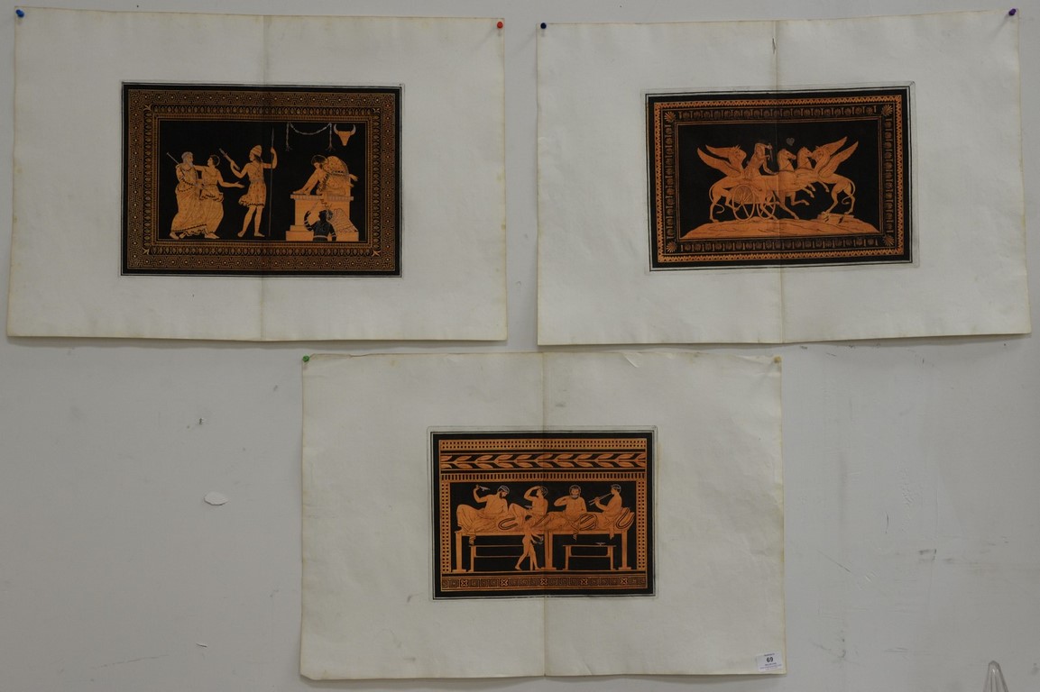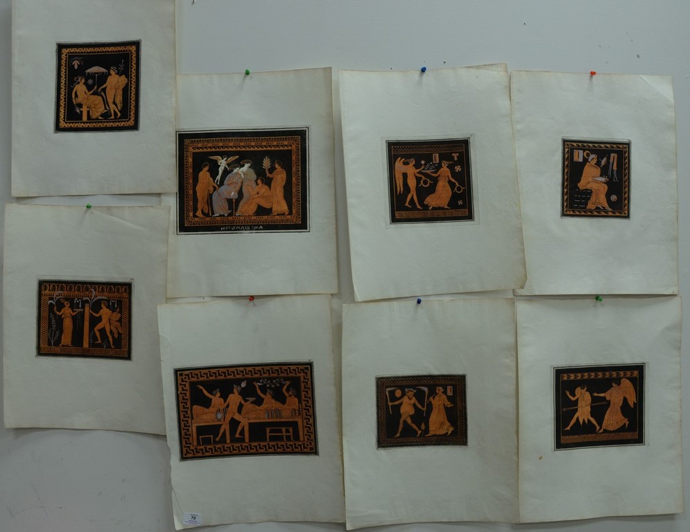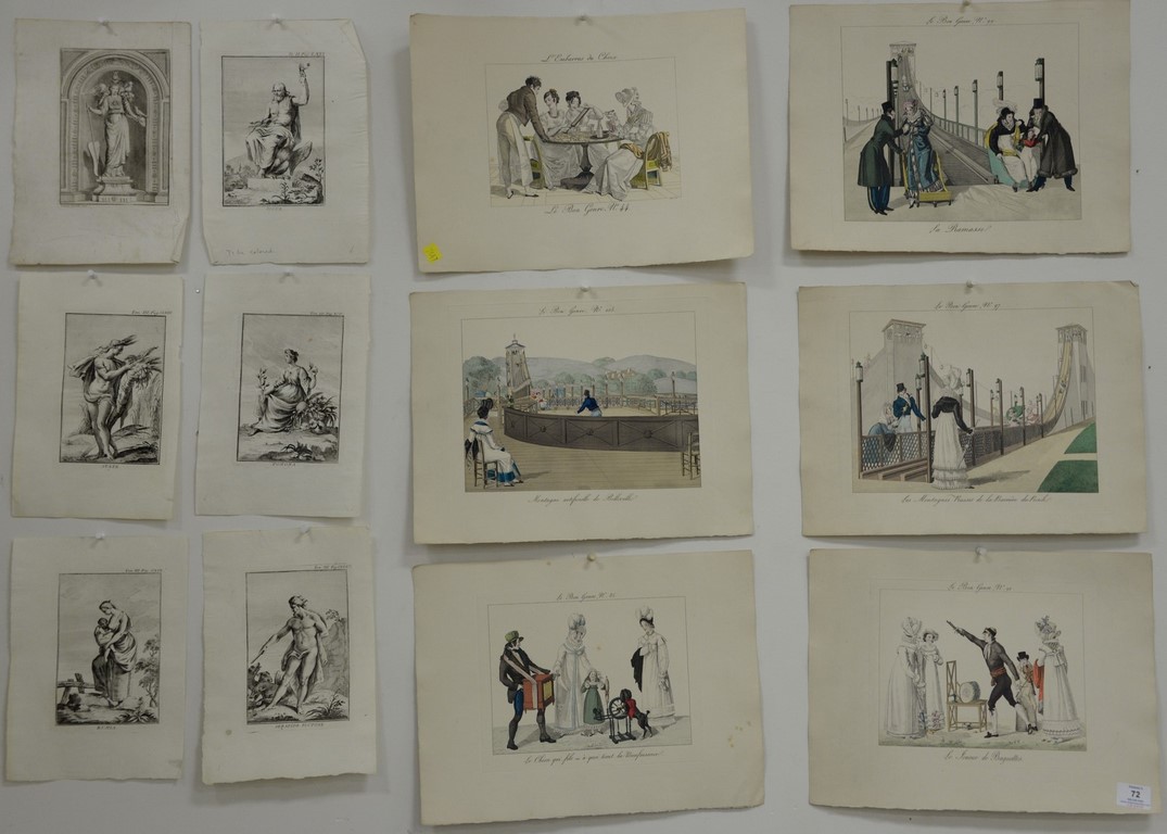 Large group of approximately 93 small hand colored Victorian prints and engravings to include a set of seven colored Parisian engravings, set of 23 black and white engravings of Greek and Roman Gods, 16 Italian colored Solca prints, five colored ship engravings, eight 19th century costume engravings, 16-19th century Italian colored engravings of Greek and Roman Gods and Heroes, 9 colored engravings of European costumes and 9 colored 19th century engravings of various costumes. smallest: 5 1/2 x 4 1/2, largest: 10 x 12 1/2