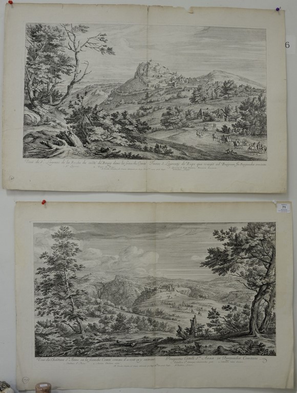 After Antoine Francois Bauduins Adam Franz Vander Meulen 1632-1711, two large engravings, Veue de St. Laurent de la Roche due coste’ du Bourg dans lafranche Comte Facies S. Laurenty de Rupe qua vergit ad Burgum In Burgundice Comitatu. each 16 1/2 x 27 1/2