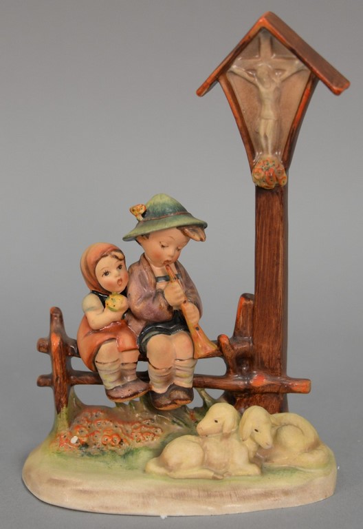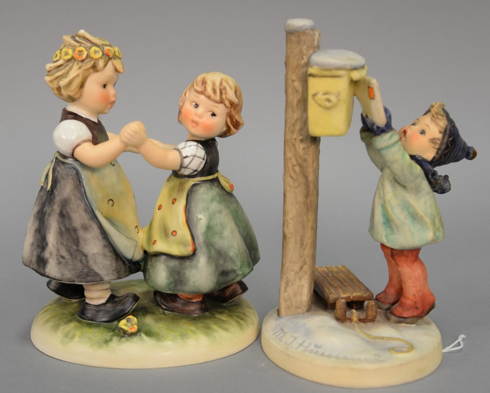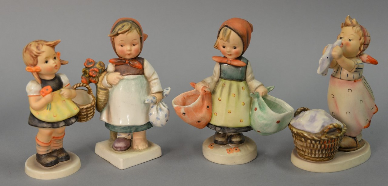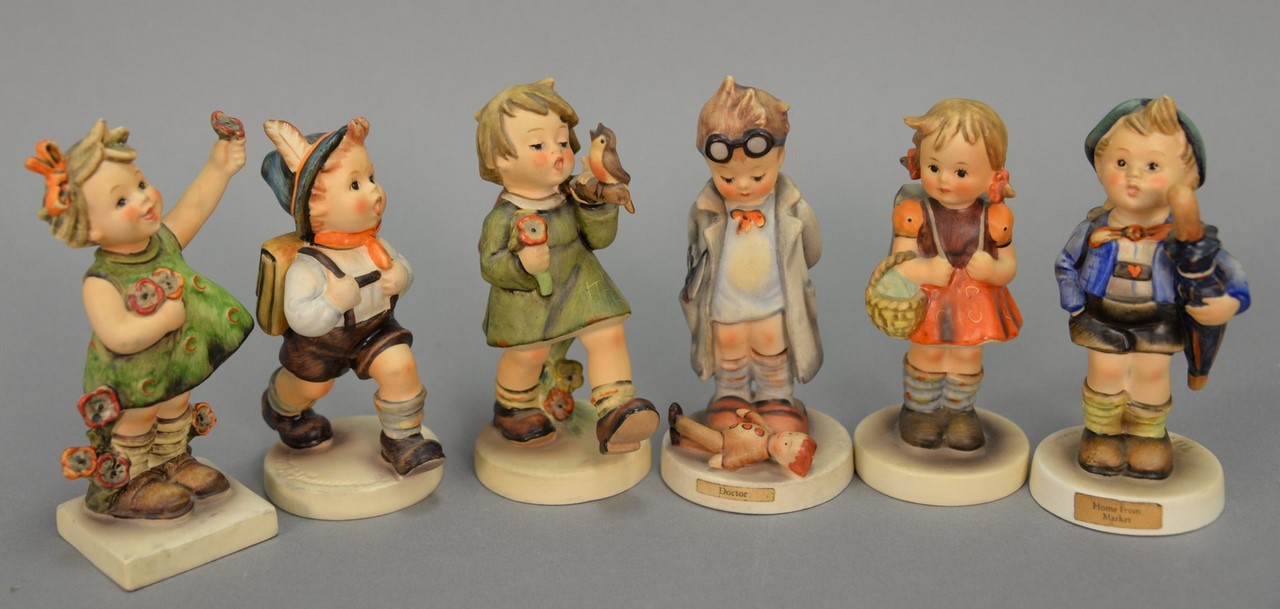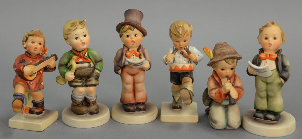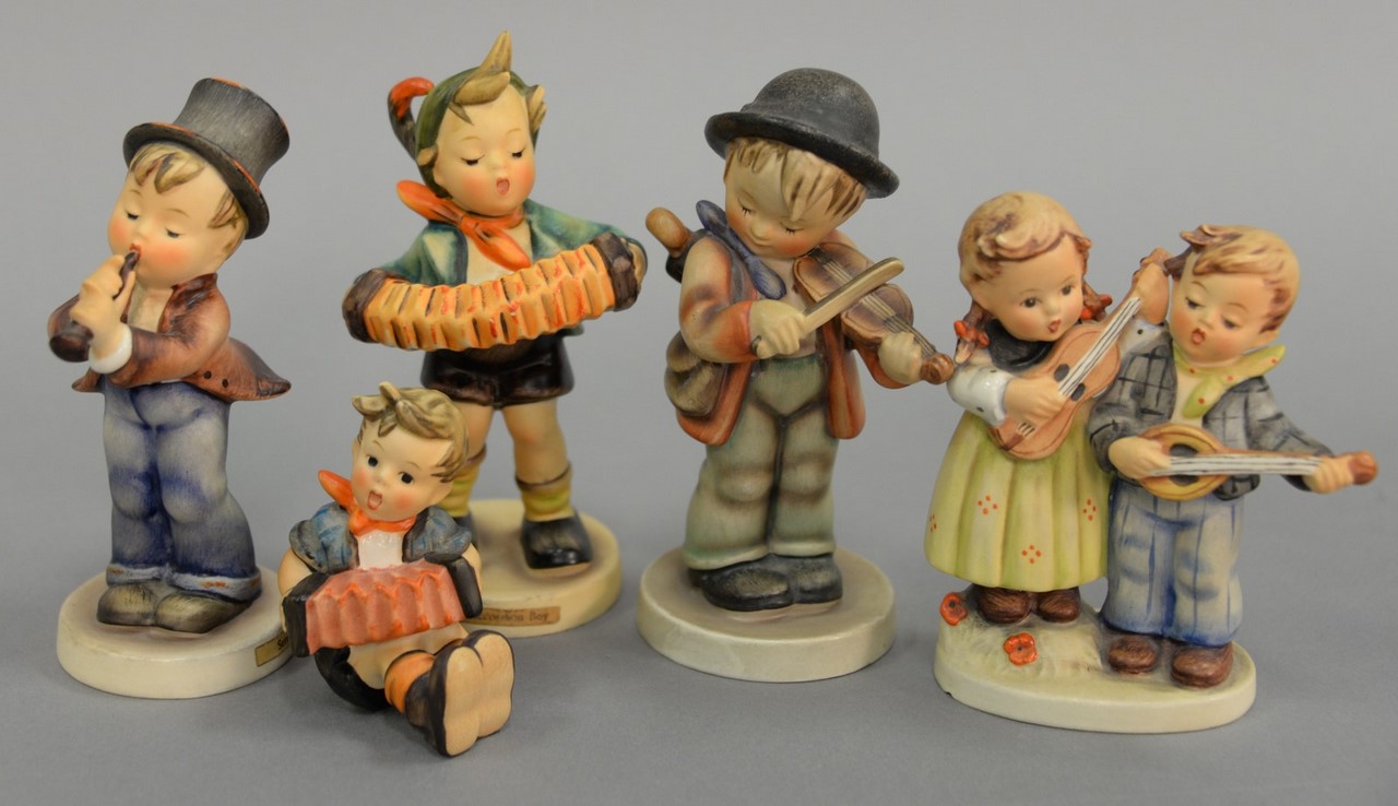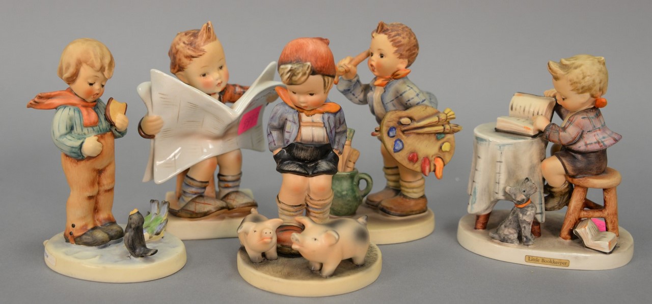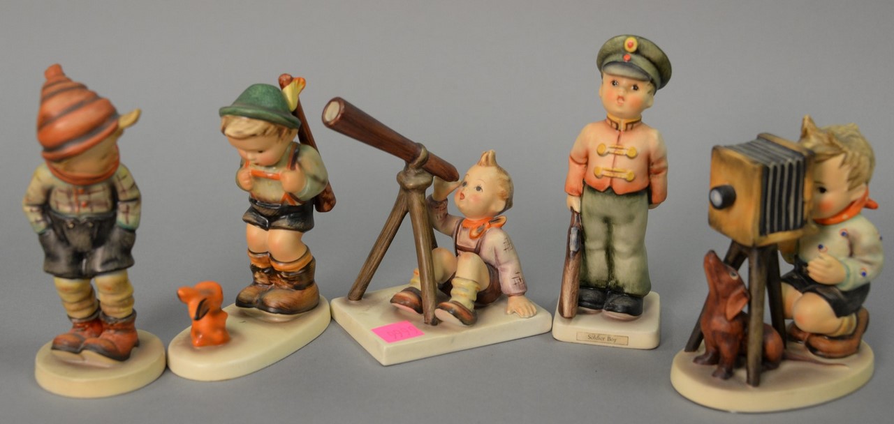 Group of five Hummels including Soldier Boy #332, March Winds #43, The Photographer Boy with a Camera #176, Star Gazer boy with telescope #132, and a Sensitive Hunter boy with rabbit #6/0. hts. 4 1/2 in. to 5 1/2 in.