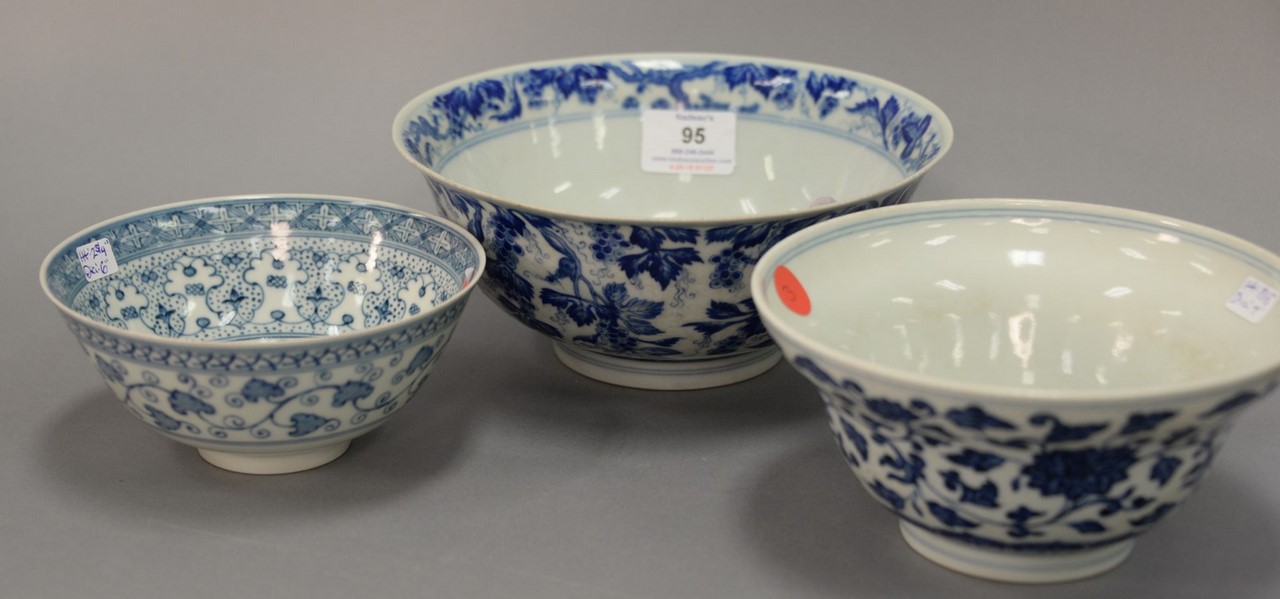 Three Chinese porcelain blue and white bowls, one with scrolling blossoming flowers having seal mark on bottom, ht. 3 1/2 in., dia. 7 in. one with scrolling leaves and six character mark on bottom, ht. 2 3/4 in., dia. 6 in. and the largest bowl having painted trees with leaves and six character mark on the bottom, ht. 3 1/2 in., dia. 8 1/2 in.