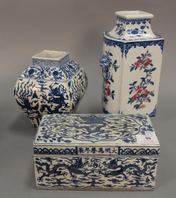 Three piece lot to include a blue and white covered five claw dragon box having painted flighting five claw dragons amongst flaming clouds ht. 4 in. lg. 9 in. and two blue and white vases, one painted with fruit and lion head handles ht. 11 in. and square five claw dragons and phoenix birds ht. 8 in.