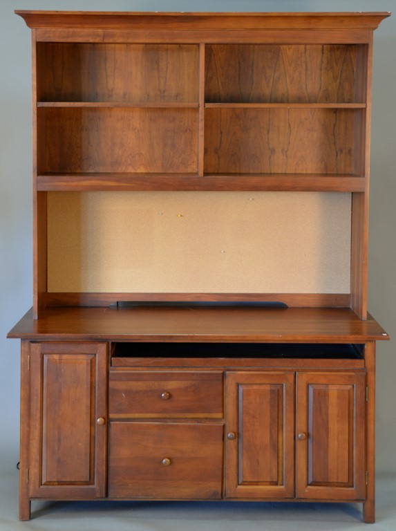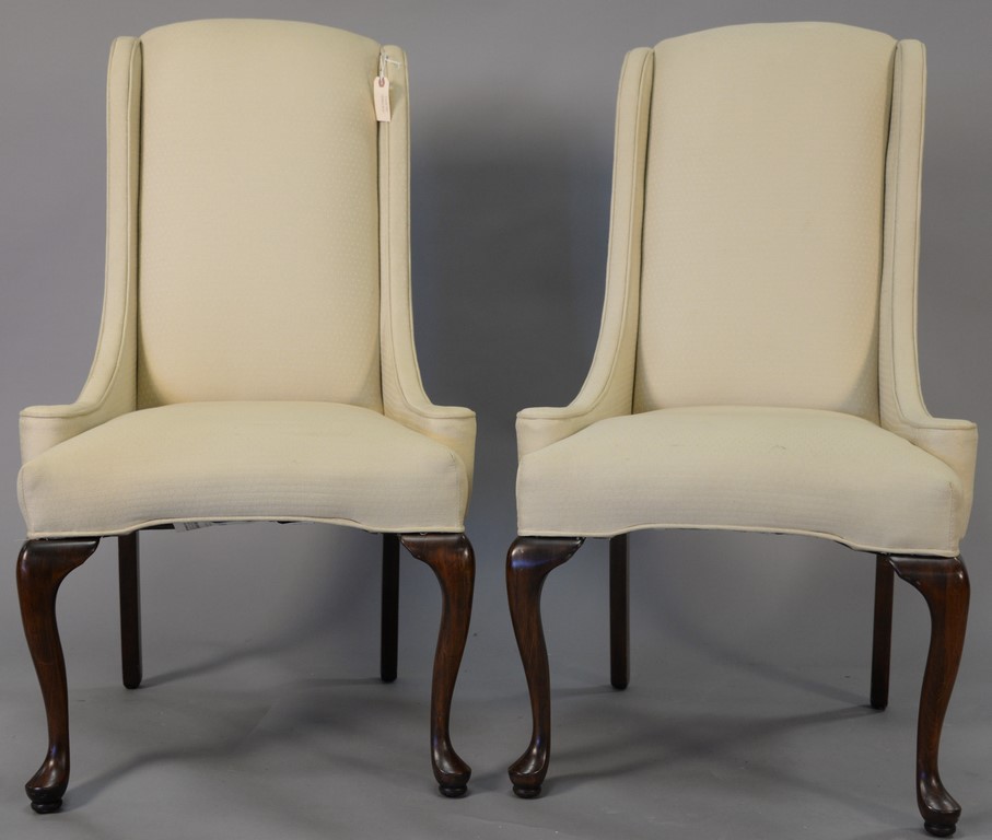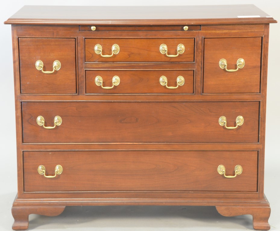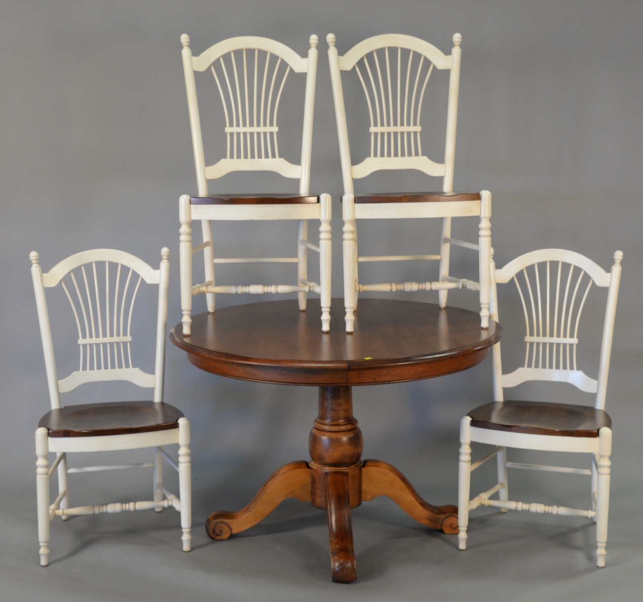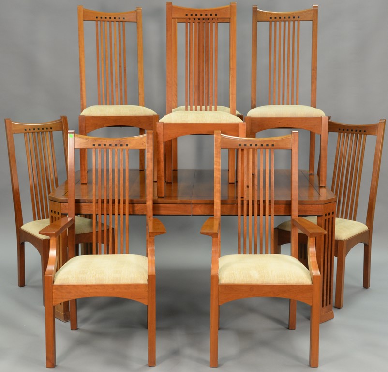 Stickley 21st Century cherry set of eight highback chairs with square spindles and matching inlaid table having two 15 leaves and custom pads, like new condition New Price 17,500. ht. 30 in. top: 44 x 68 opens to 98