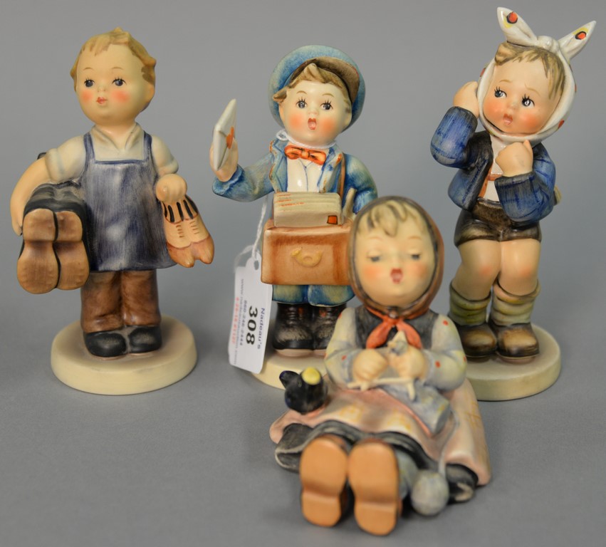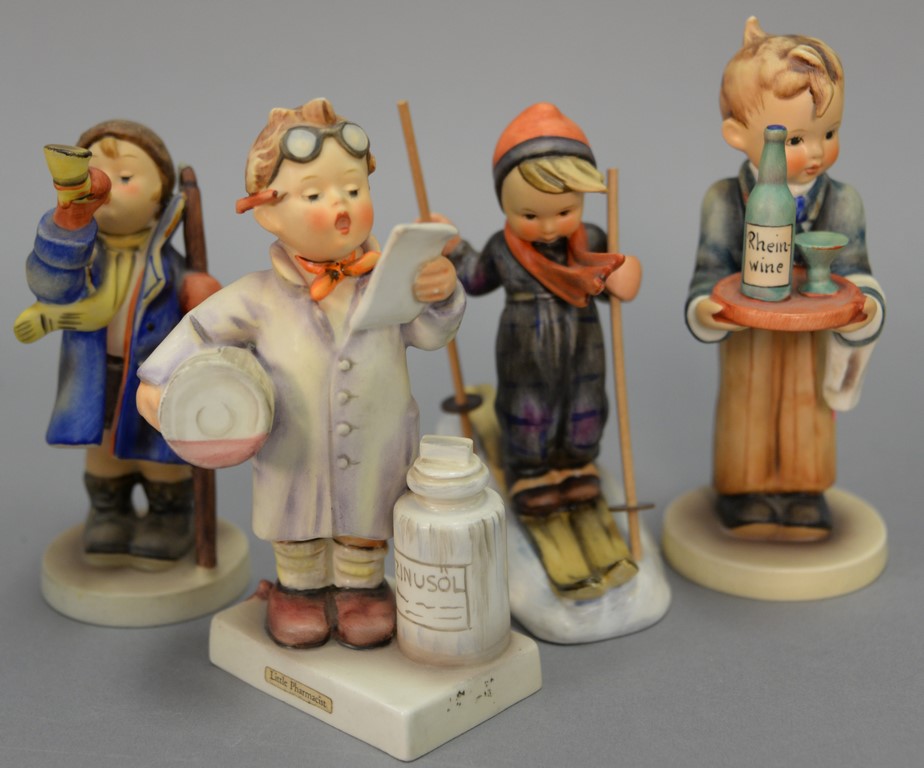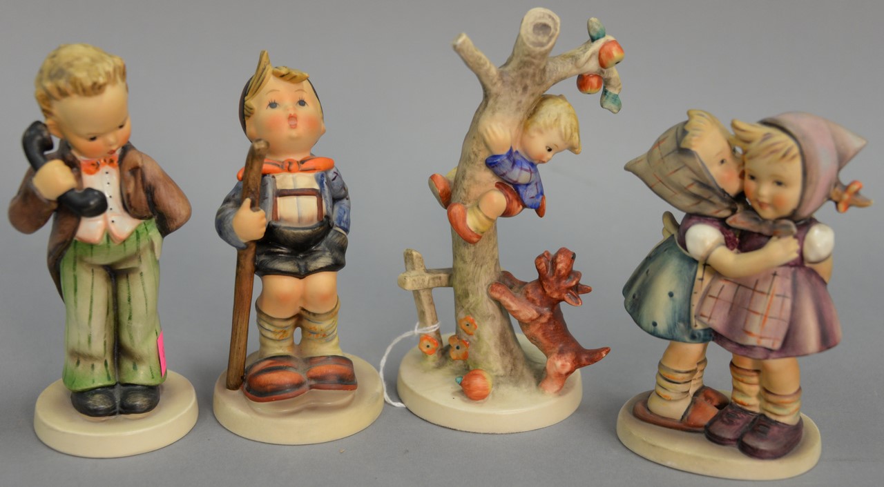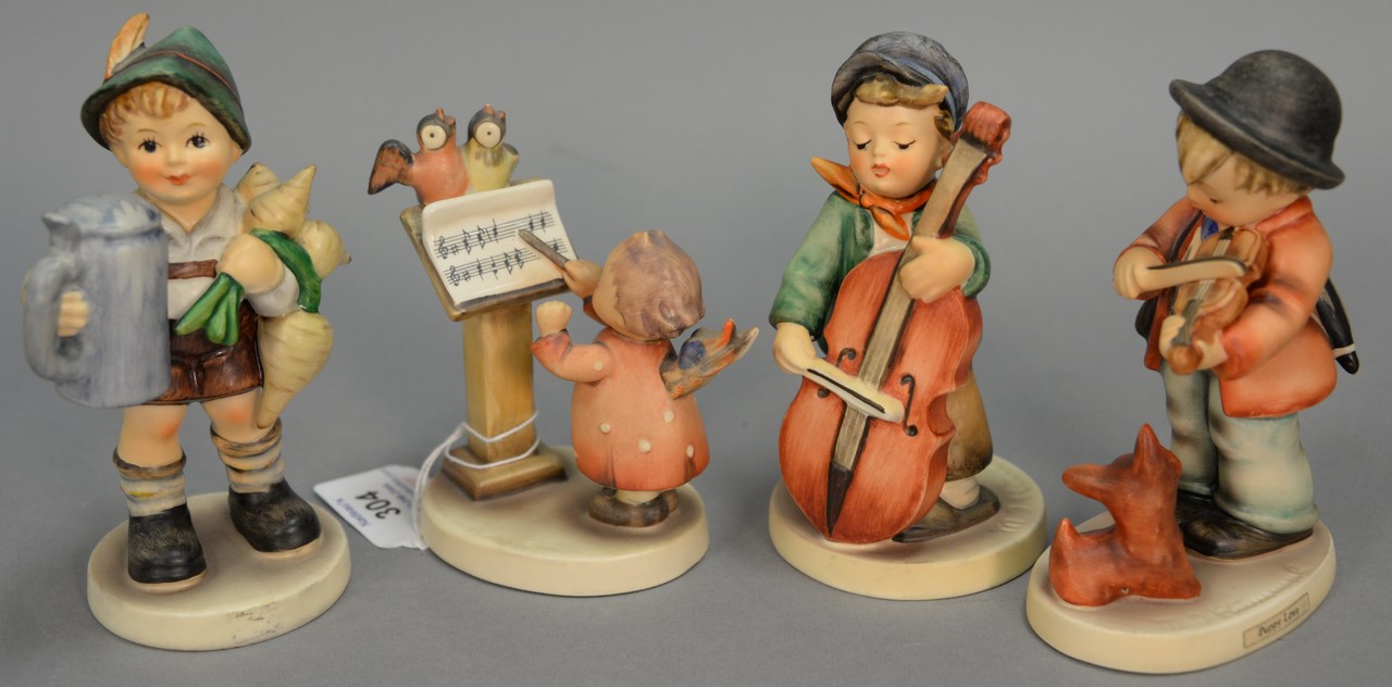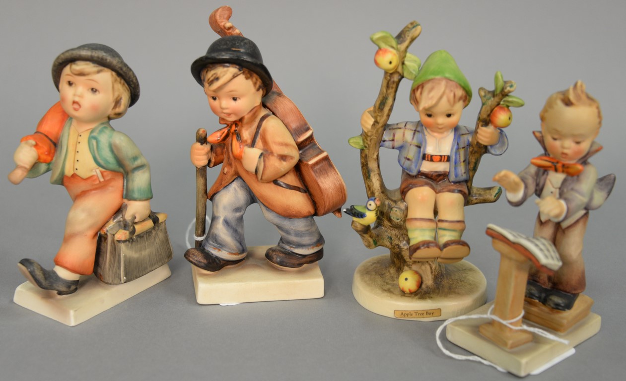 Group of four Hummels to include Apple Tree Boy #142/1, Merry Wanderer 11/0, Band Leader #129, and Little Cellist #89/1 one Hummel with chip. average ht. 5 in.