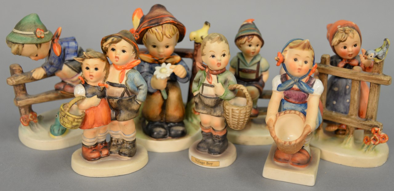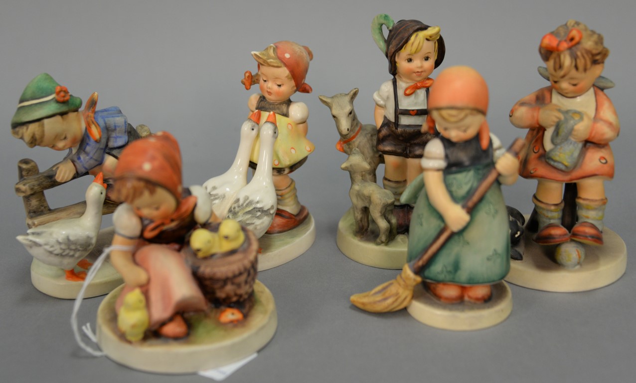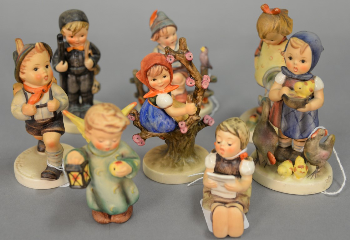 Group of seven Hummels to include Little Helper, Village Boy, Surprise, She Loves Me, She Loves Me Not, Signs of Spring, and one other. ht. 3 1/2 in. to 4 in.