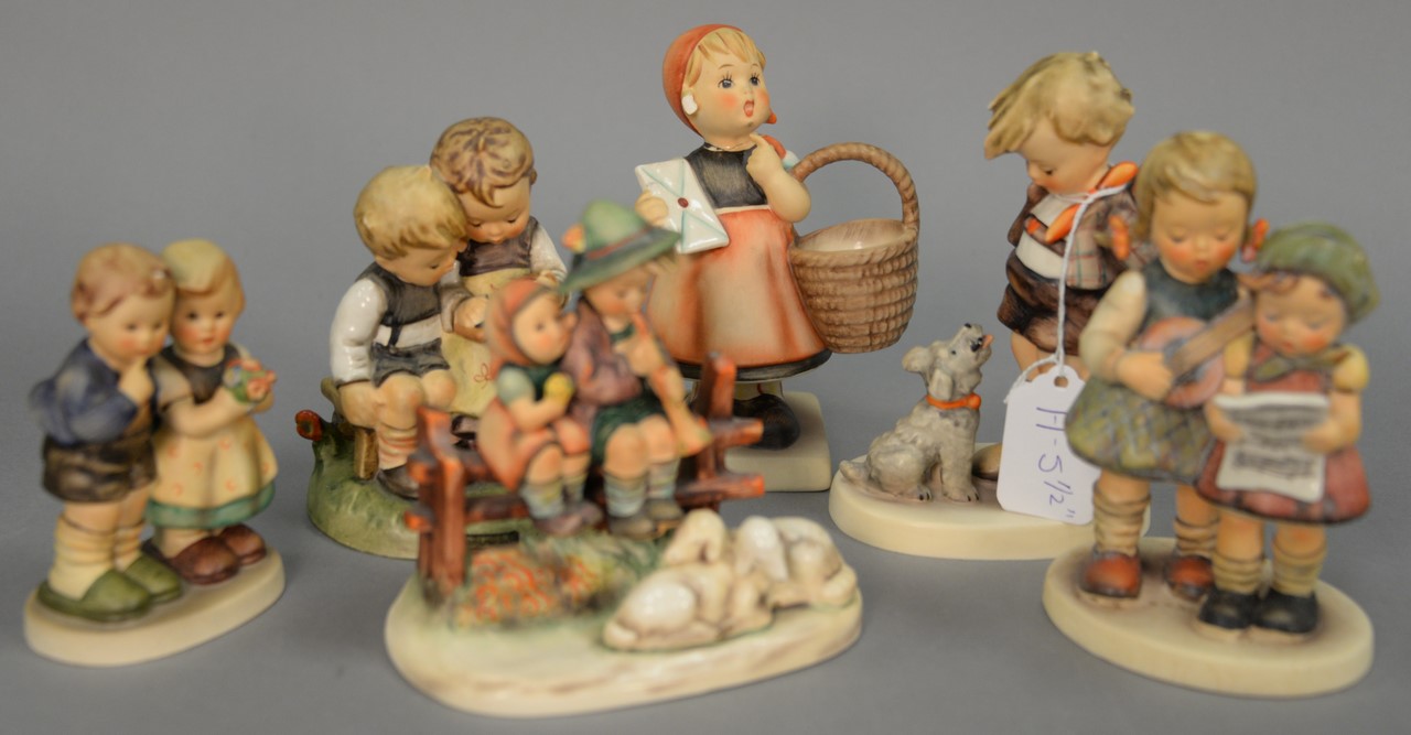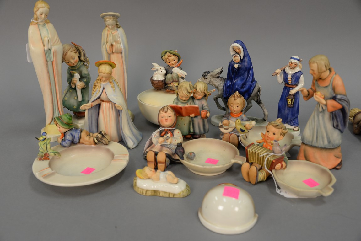 Group of Fifteen Hummels including four ashtrays: Joyful #33, Boy With Bird #166, Let’s Sing #114, and Happy Pastime #62, ten are religious. average ht. 3 1/ 2in.