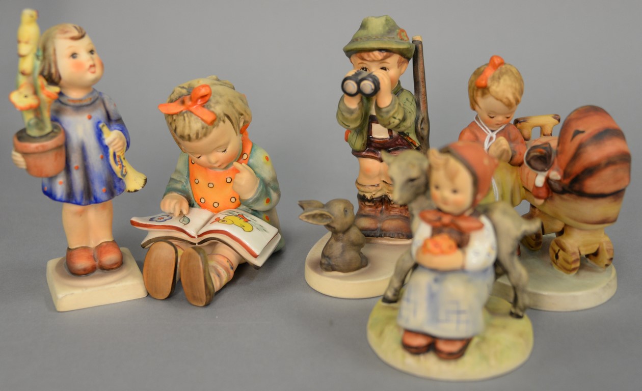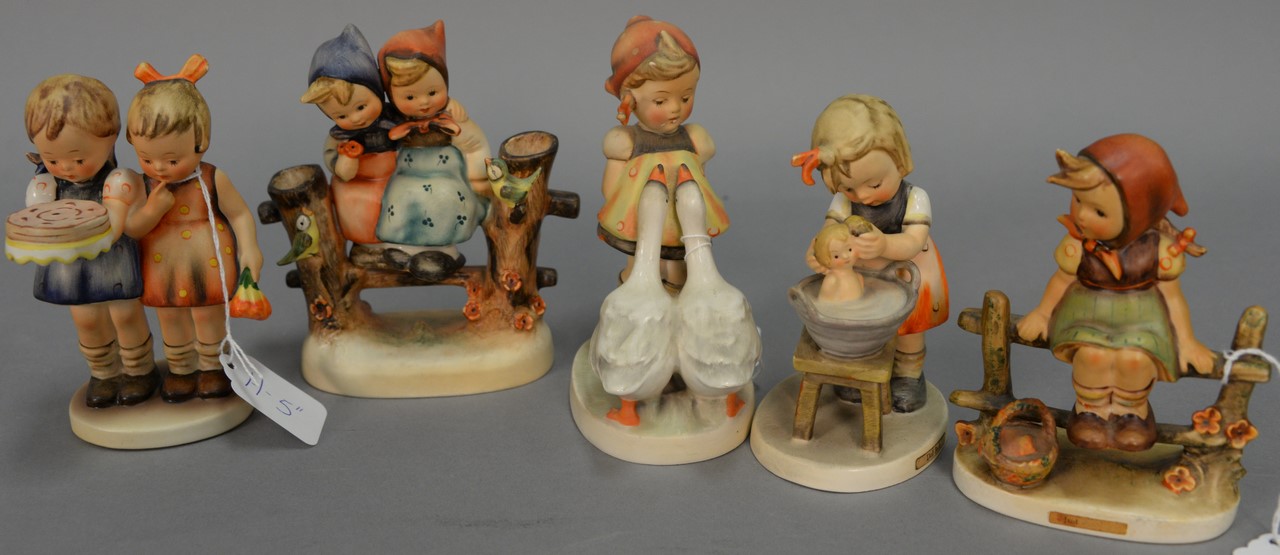 Five Hummel figures including Doll Bath #319, Coquettes #179 with full bee, girl with geese as is, Just Resting #112/1, and Happy Birthday #176. average ht. 5 in.