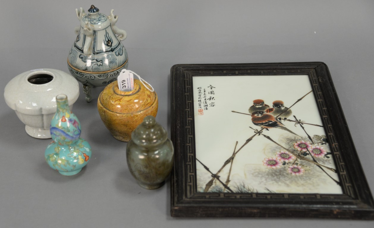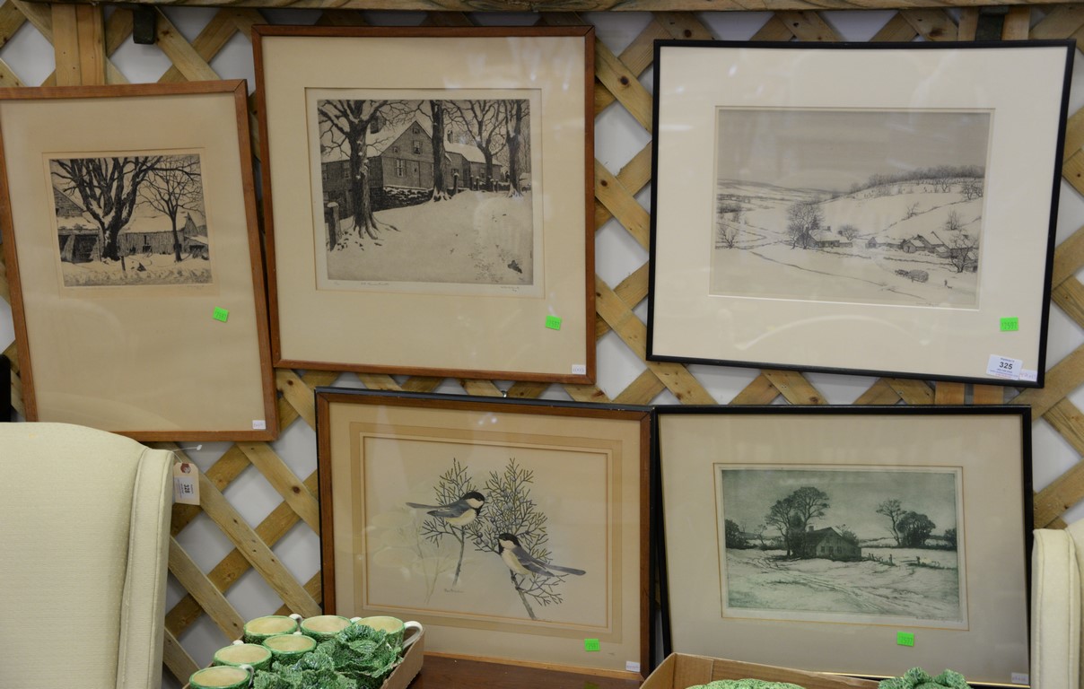 Five prints and etching including Rex Brasher print, two I.C. Cook etchings Old Connecticut, Kerr Ely winter etching, and Gustav Adolph Hoffman etching.