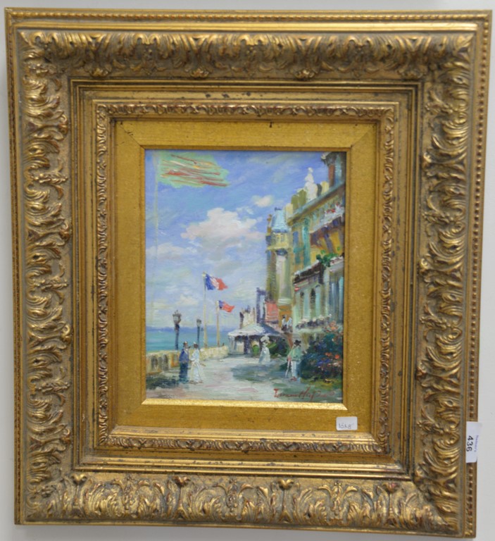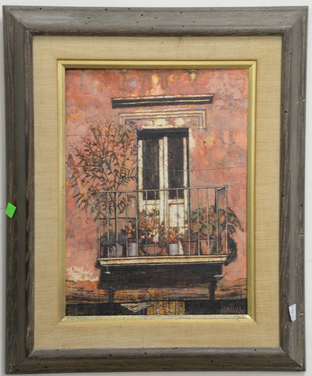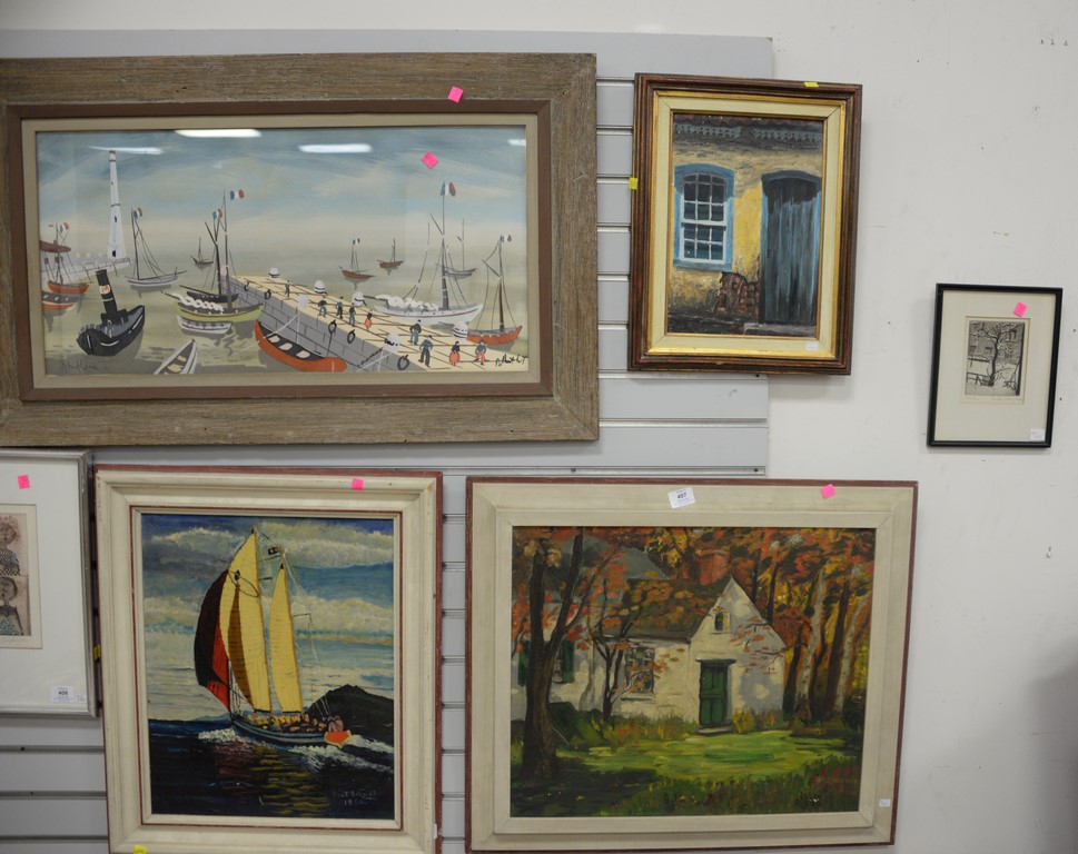 Five framed pieces including Ricard Filgueira oil on masonite of front door, an oil on canvas of a house signed Brand, oil on board with sailboats signed lower right Will Schwab, watercolor of dock with people, and an etching Winter.