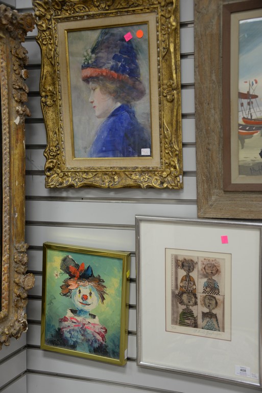 Three framed pieces to include Graciela Rodo Boulanger 1935 colored etching signed lower right G. Rodo Boulanger and numbered lower left 16/150, an oil on canvas Pablo Matania of a clown, and a watercolor of a girl with a hat.