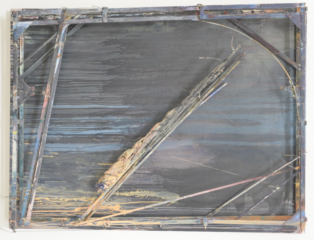 David Maxim 1945 Blue Dusk three dimentional wood, various string, nylon, linen and cloth on canvas with meatl fittings, glue and acrylic, signed on back having Foster Goldstrom Gallery label on reverse. 10 x 57 x 43.