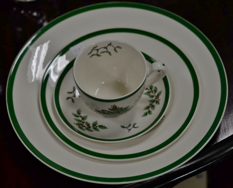 Spode Christmas tree pattern dinner set, setting for eight to include eight dinner plates, twelve salad plates, eight cups, eight saucers, and a serving tray, 45 pieces total.
