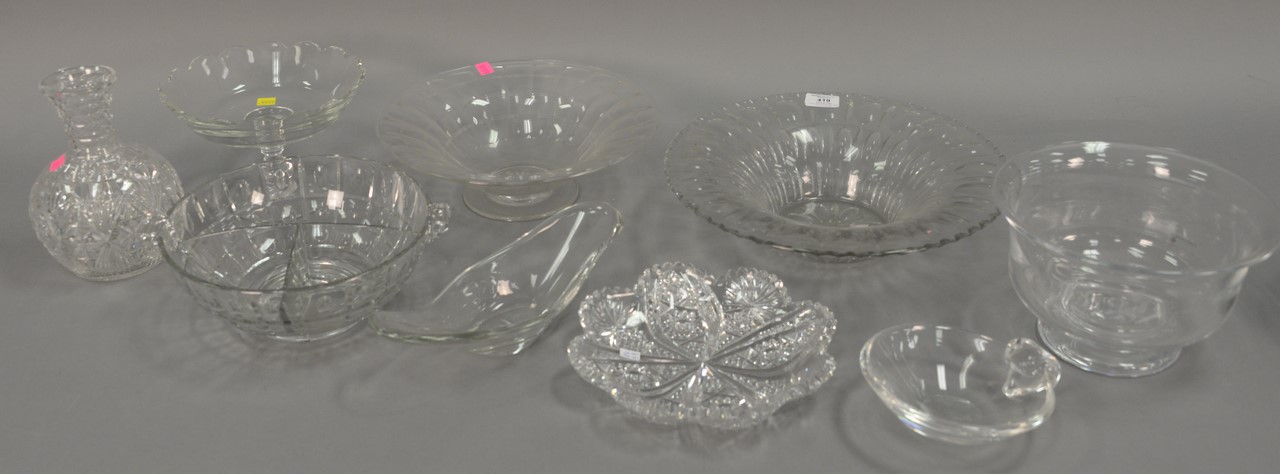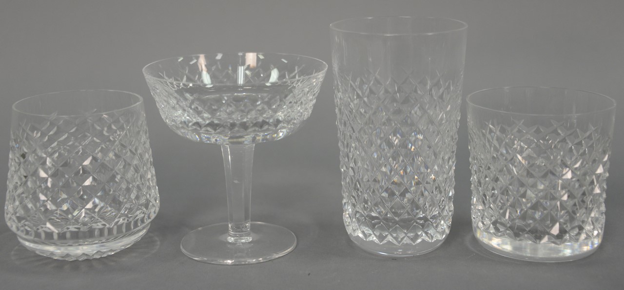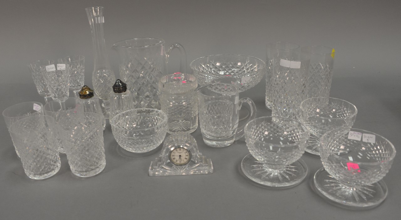 Large group of Waterford to include set of four tumblers, three dessert bowls, three large water tumblers, three stemmed cordials, compote, creamer, clock, salt and pepper, sugar, vase, and pitcher.