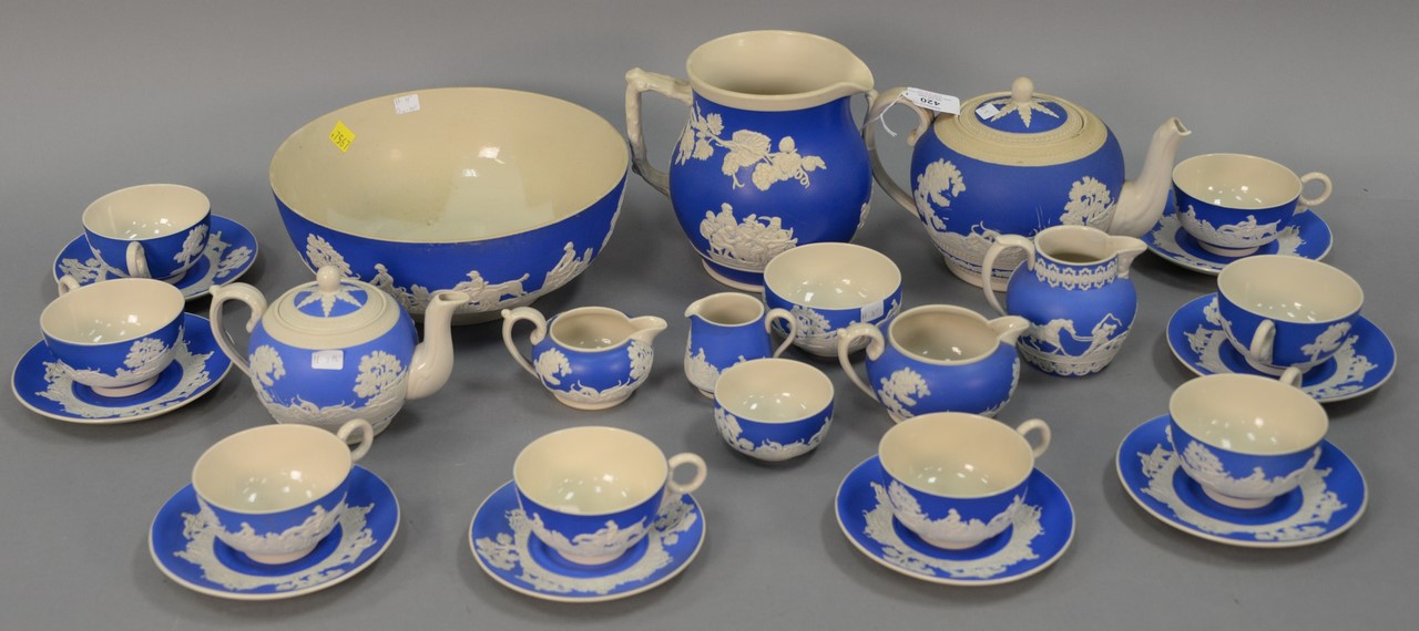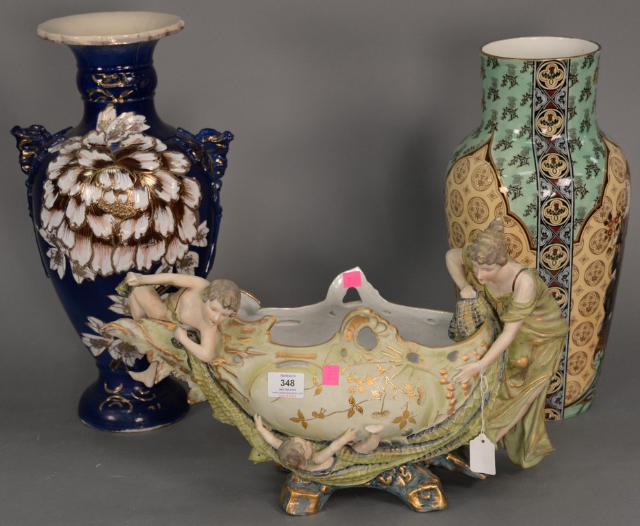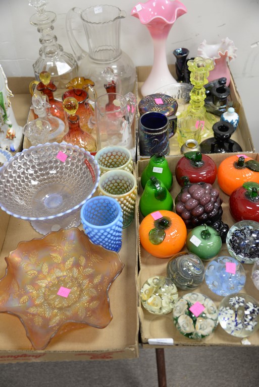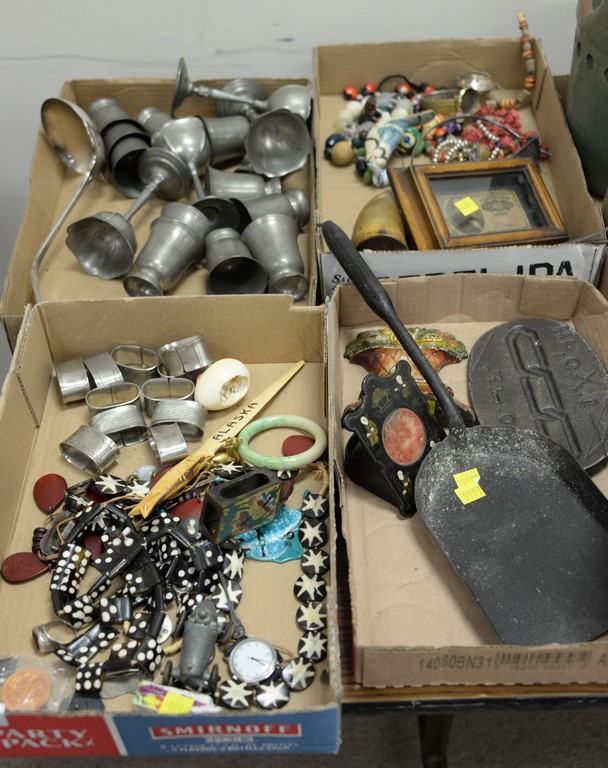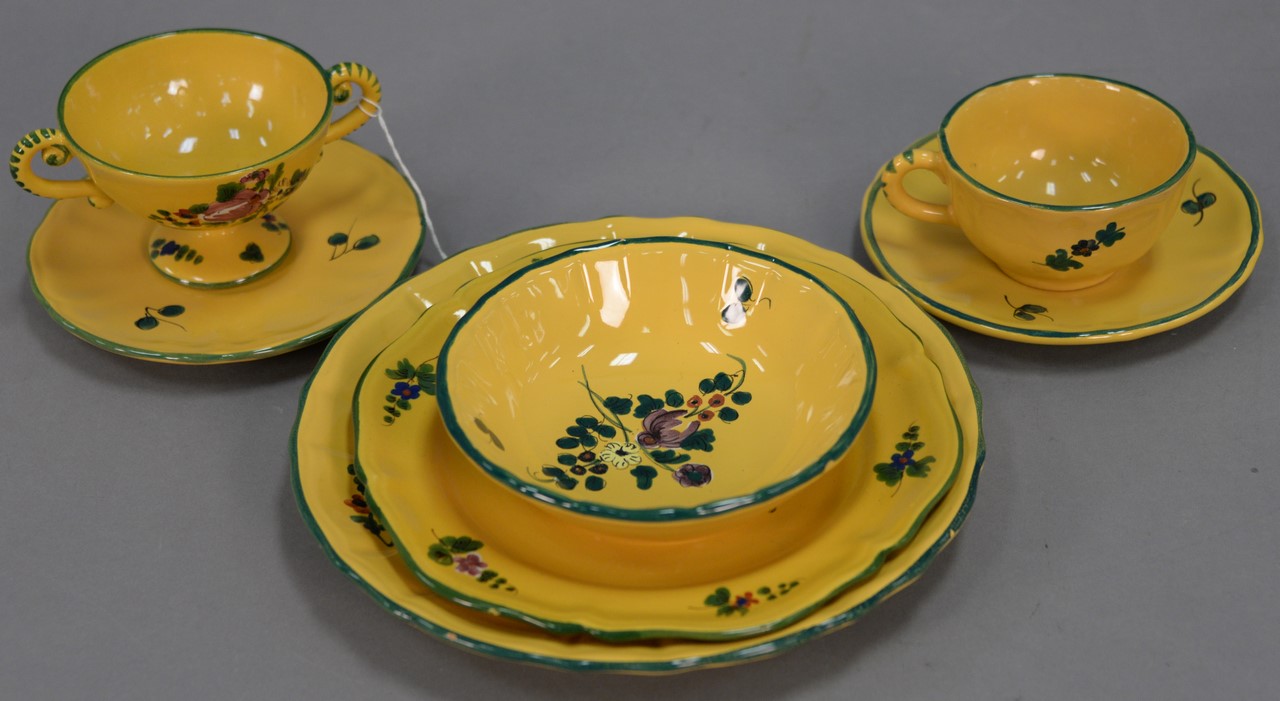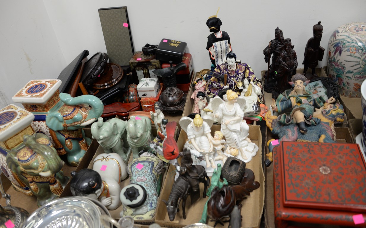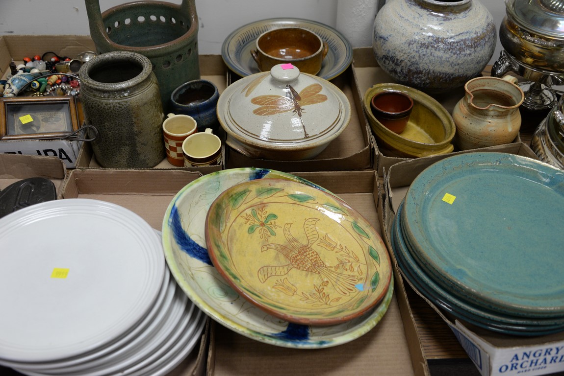 Six box lots of glazed stoneware Majolica items including set of six large Carla Ward blue glazed plates, redware plates, stoneware vases, set of eight white glazed plates, etc.