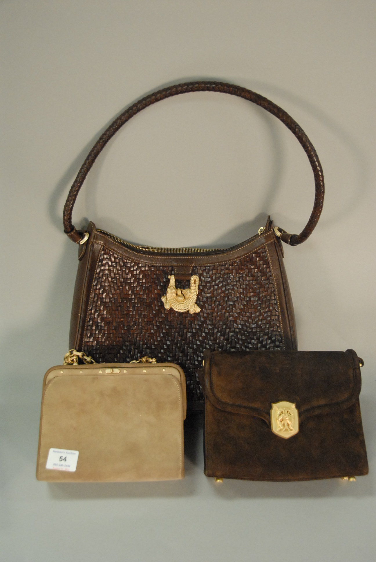 Three Barry Kieselstein Cord purses to include one brown leather with gold alligator ht. 10in. lg. 12in., one new with horse feet and horse clasp ht. 6 1/2in. lg. 8in., and one tan as is.