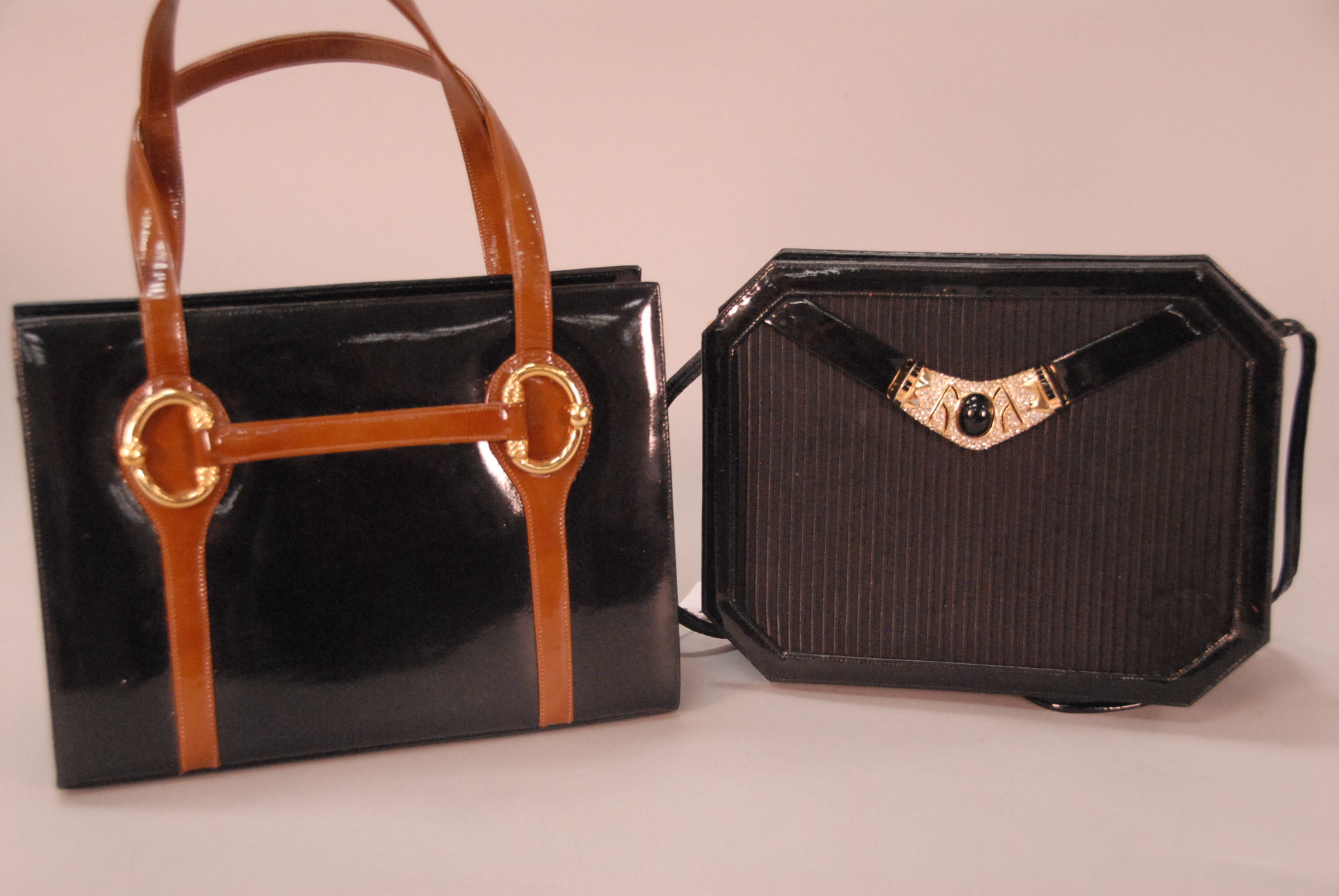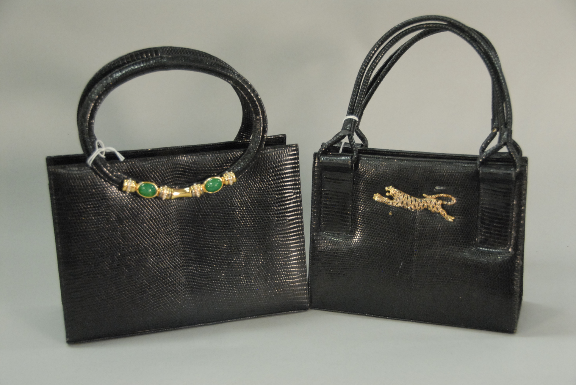 Two vintage Martin Van Schaak purses / handbag, both custom black lizard skin, one having leaping tiger decoration ht. 6in. lg. 7 1/2in. and the other with a jeweled decoration ht. 6in. lg. 9in.