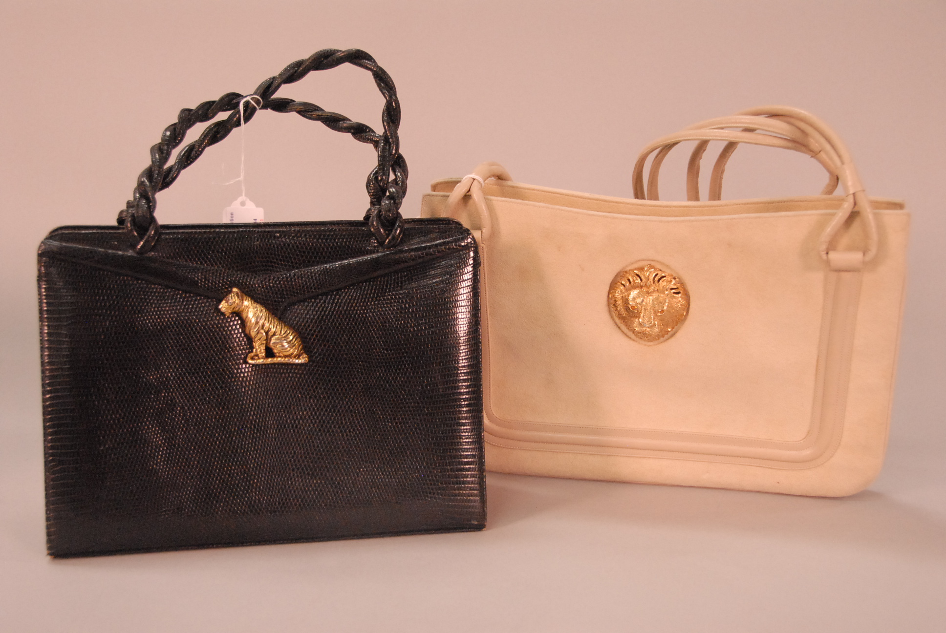 Two Martin Van Schaak purses to include one handbag of lizard skin and tiger decoration 8 1/2 x 10 1/2 and the other tan suede with lion’s head 9 x 13.