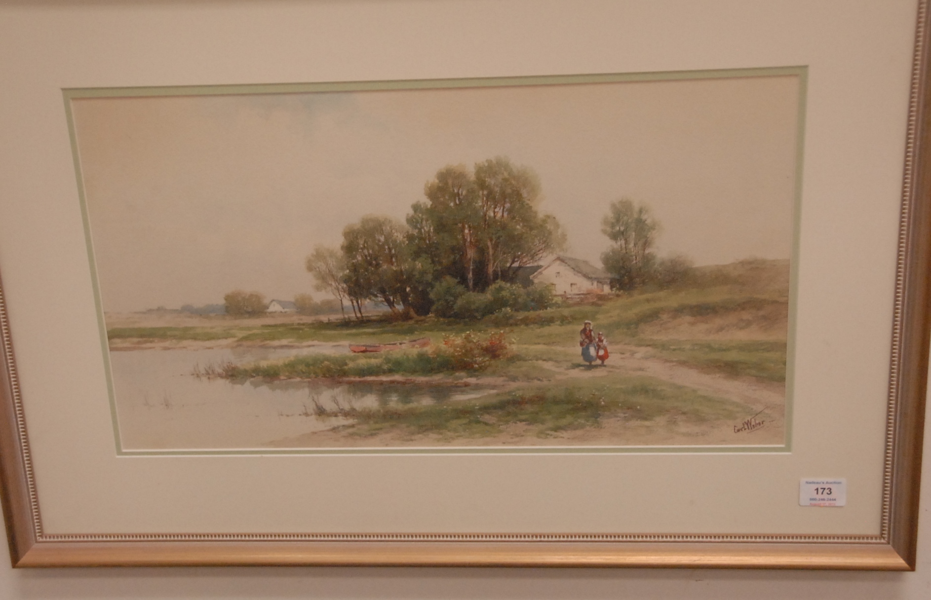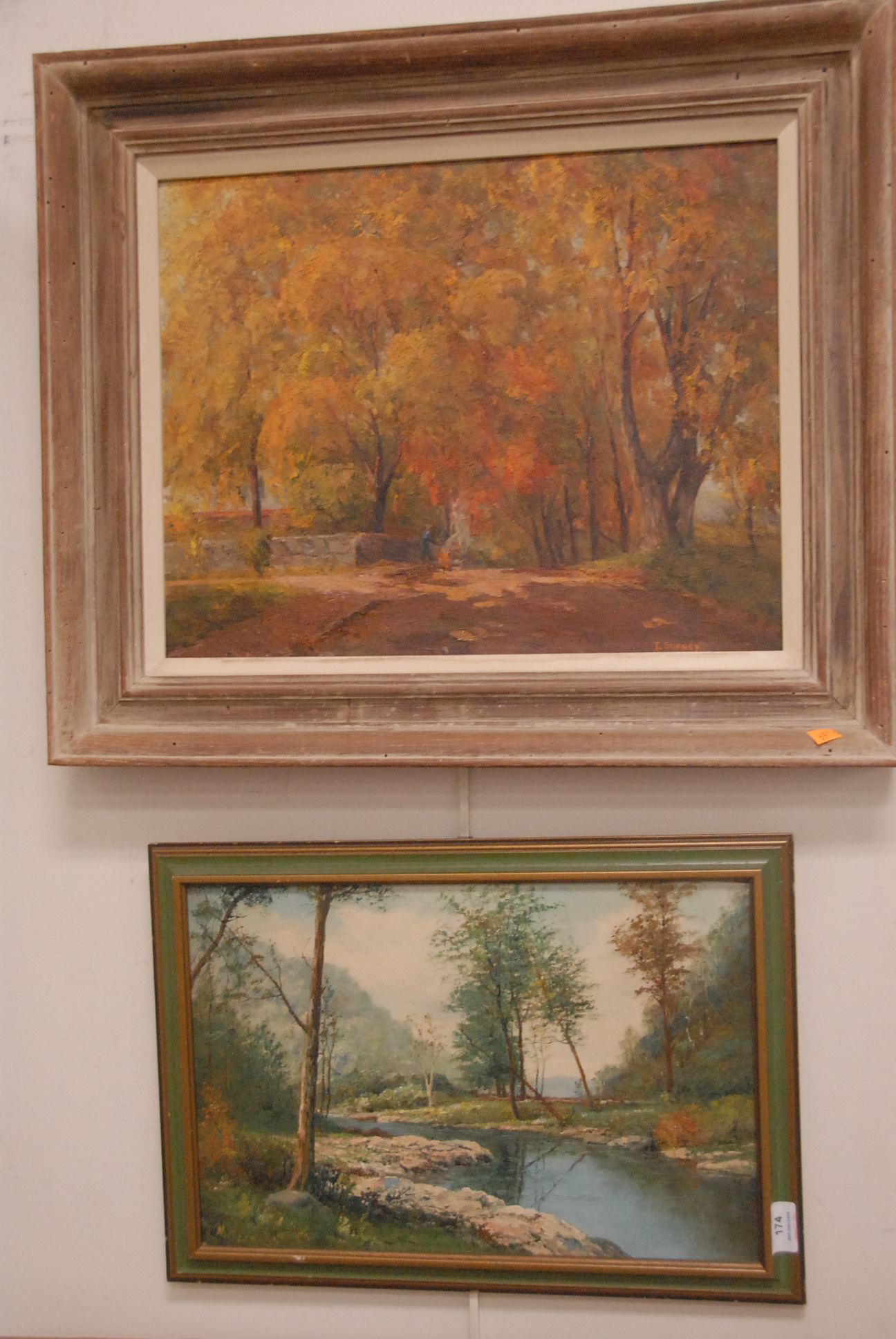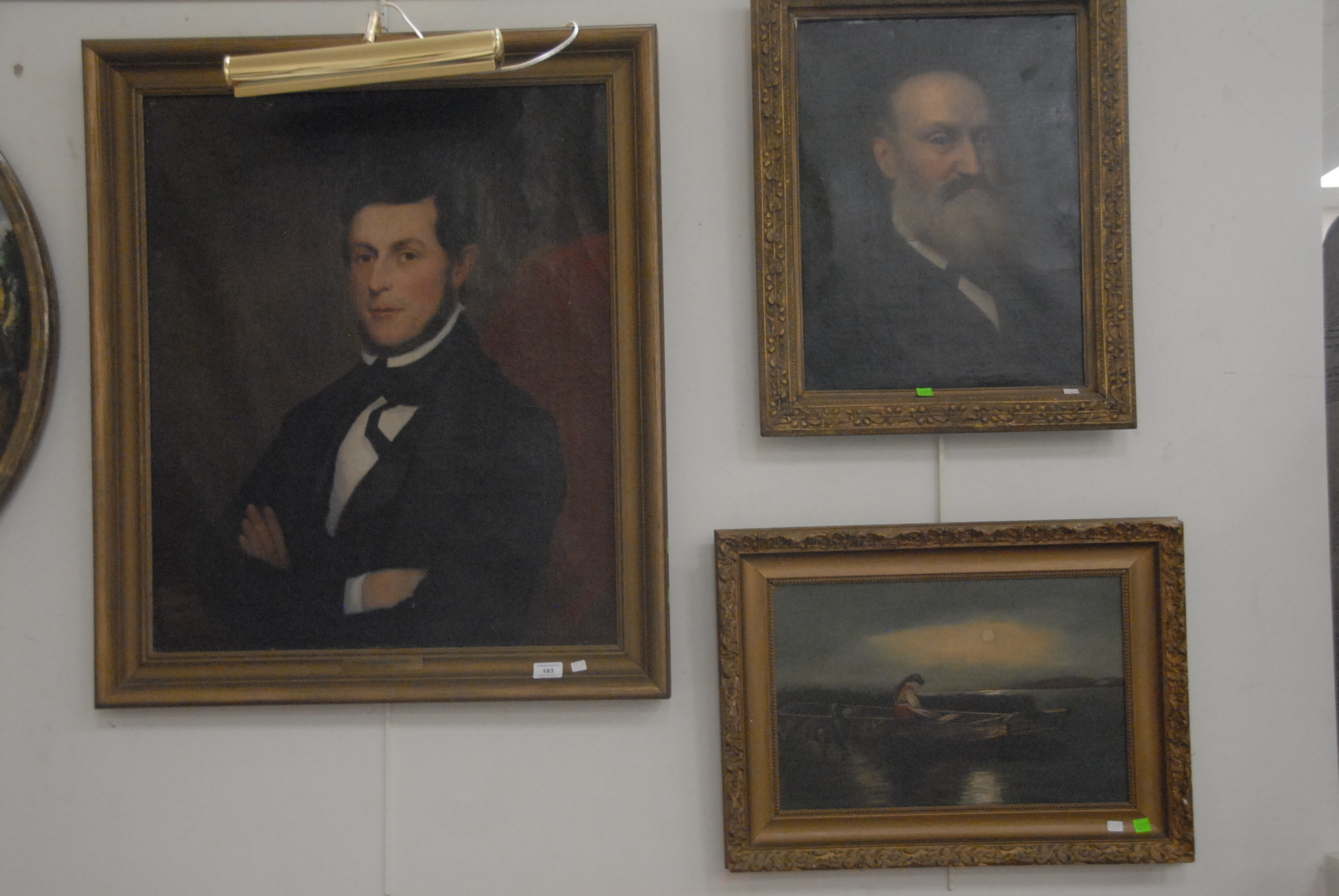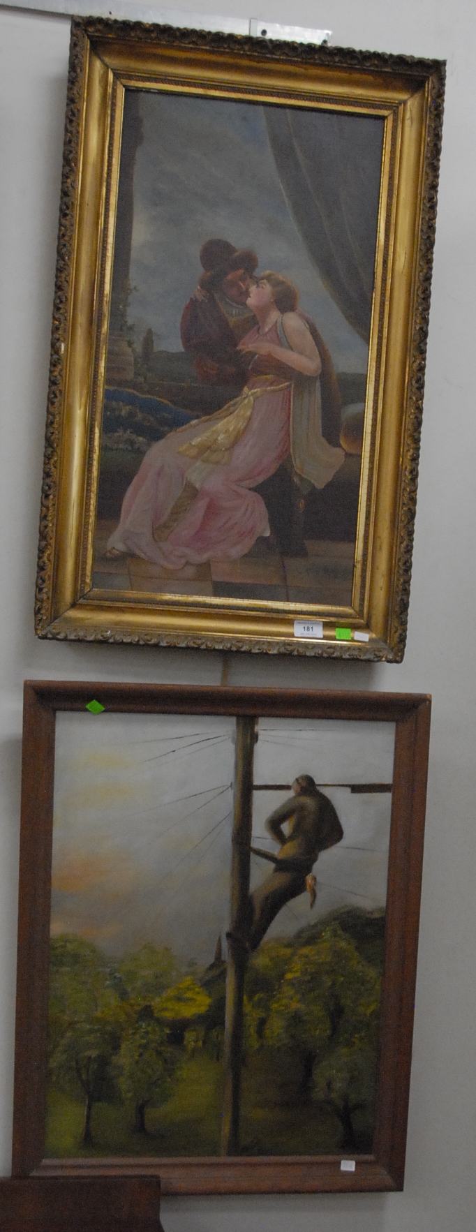 Two paintings to include Josephine Stever 19th/20th century Romantic Scene signed lower right Josephine Stever 1901 25 x 14 and Renie Evants oil on canvas Man on Pole