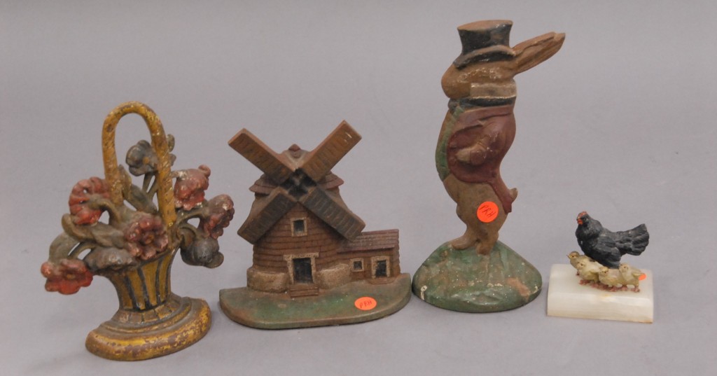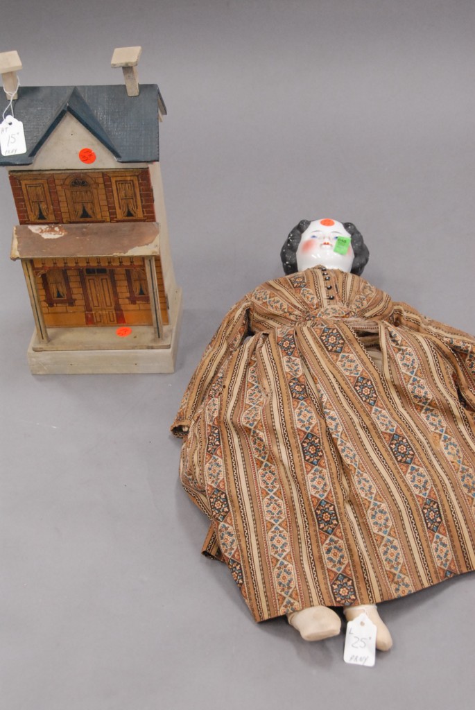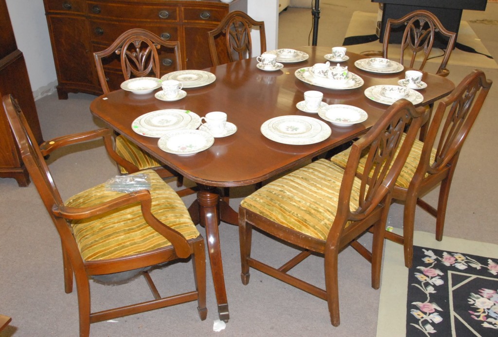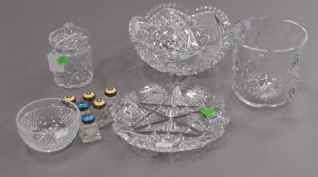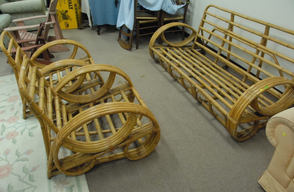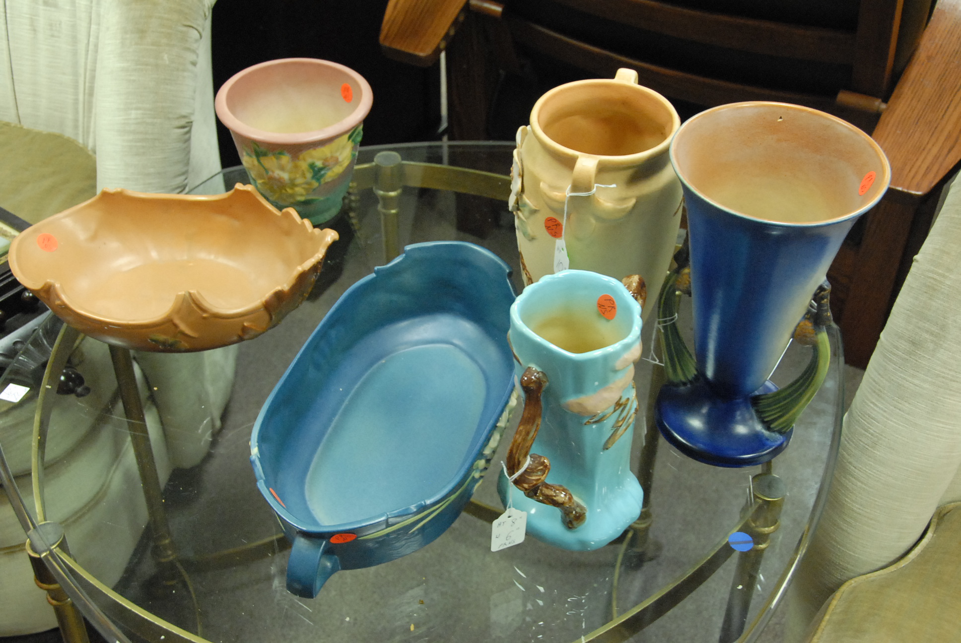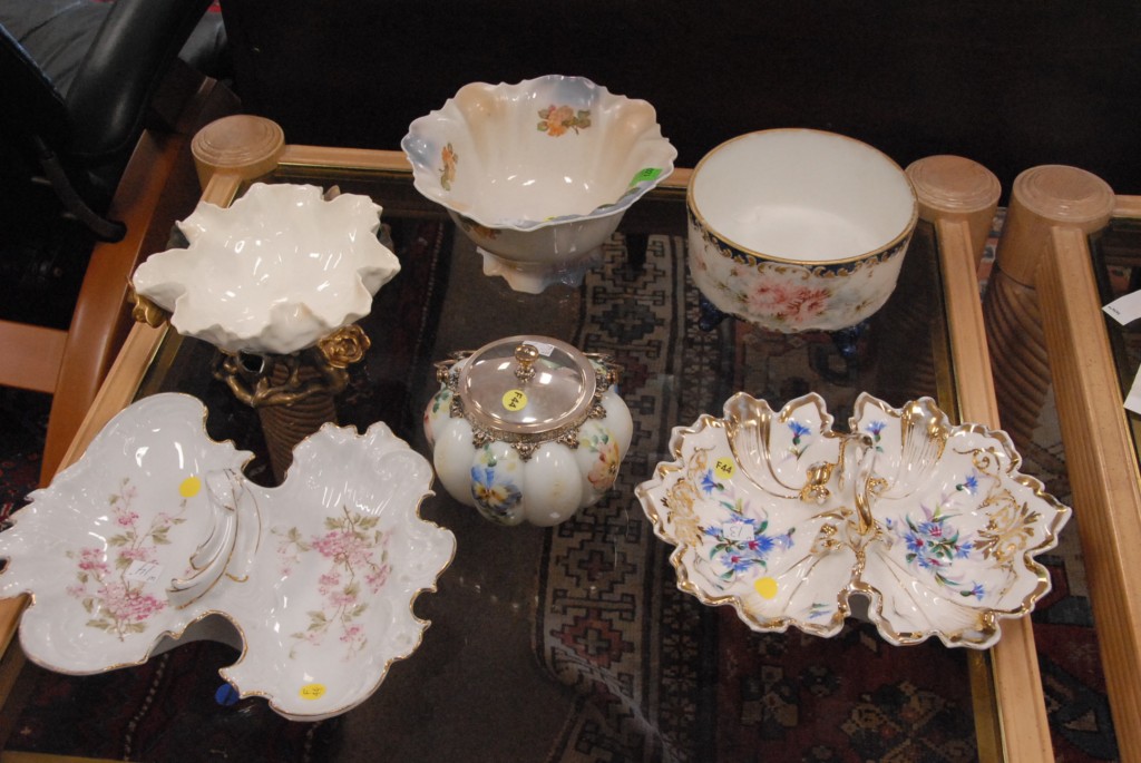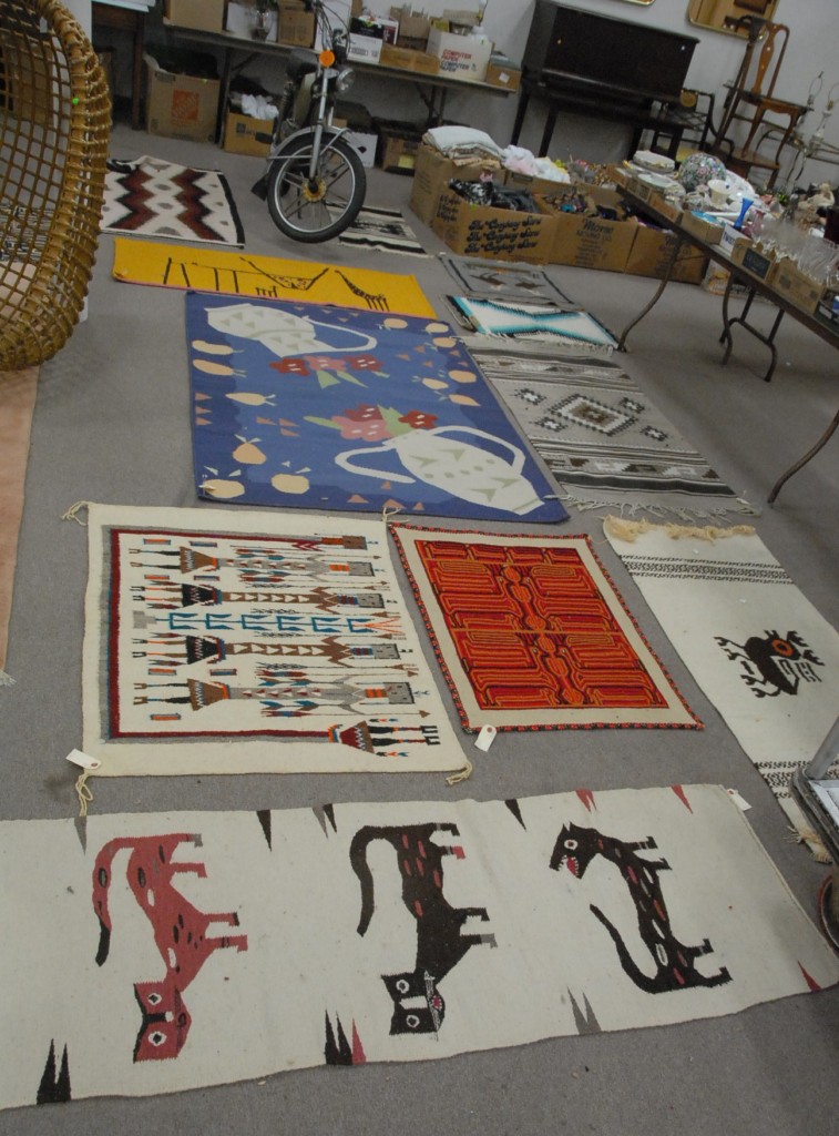 On top and under a table books, glassware, Victorian frames, lamps, records, and miscellaneous along with porcelain top table, office chair, side chair, metal flower, coats, file cabinet, antique pine lift top commode, large trunk, exercise machine, and cedar chest.