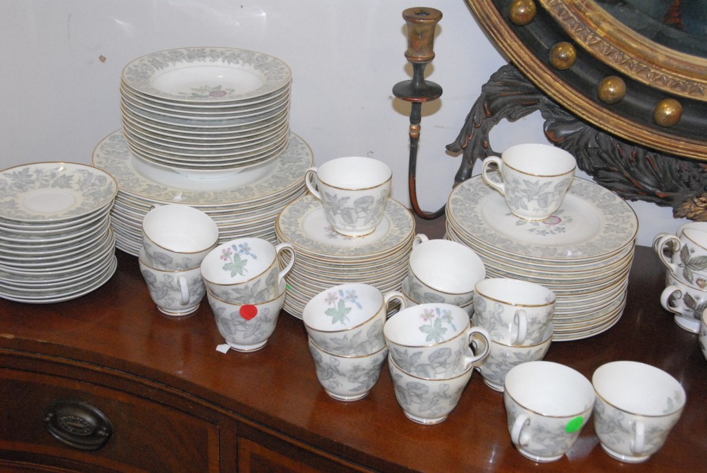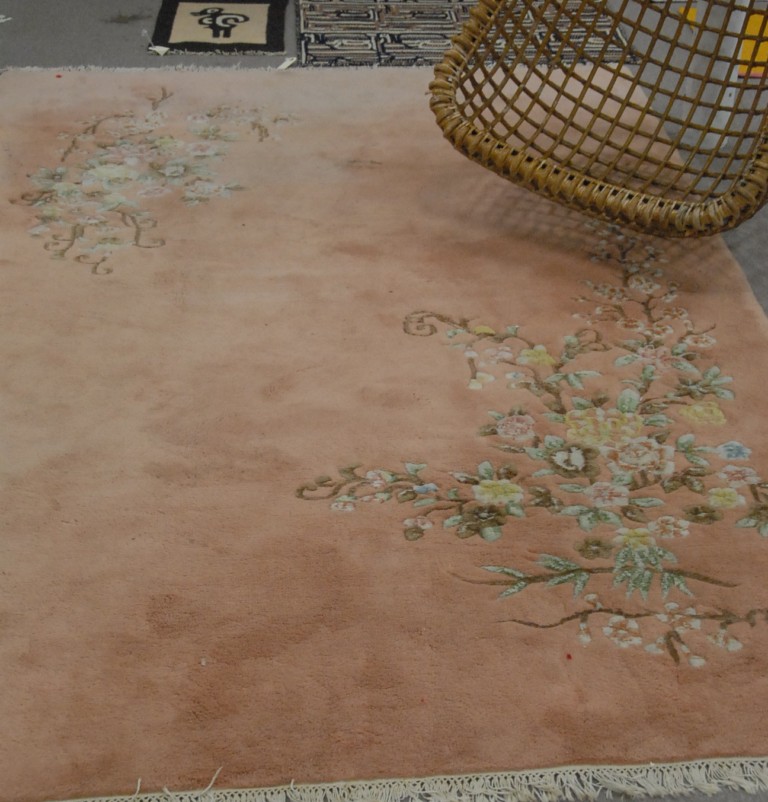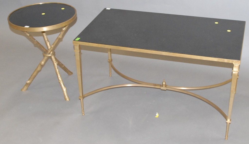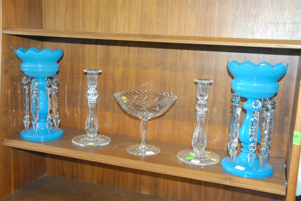 Group lot pair of upholstered chairs, four glass and metal tables and teacart, 5 table lamps, chair, armchair, floor lamp, Ethan Allen shelf, cedar chest, and side chair.